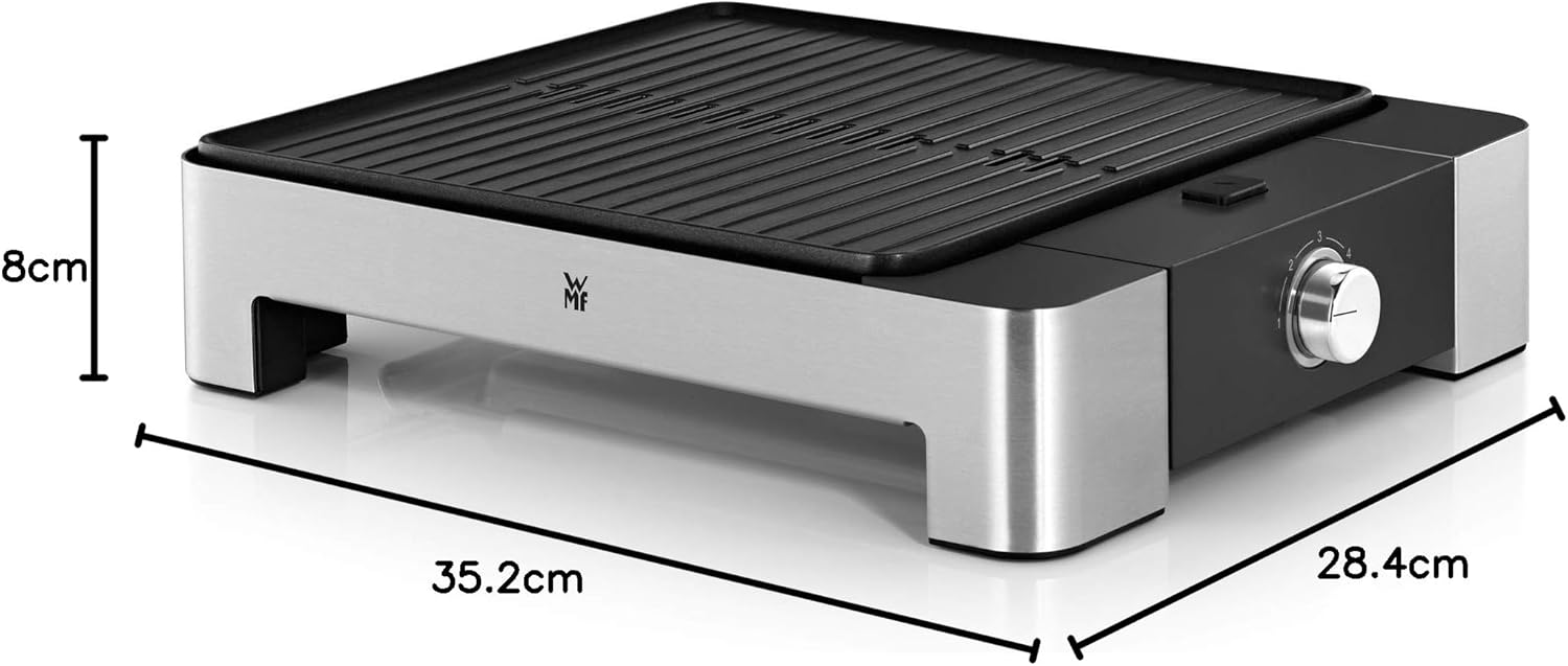 WMF Lono Tischgrill Quadro, Indoor Grill, Elektrogrill klein mit kompakter Grillfläche, spülmaschinenfest, 1250 W Lono – Tischgrill – Edelstahl matt لینک آمازون : https://www.amazon.de/dp/B01IVDYAJ4?th=1&psc=1 محتویات: ۱ عدد گریل رومیزی برقی از جنس استیل ضد زنگ Cromargan®، روکش مات (۳۵.۲ در ۲۸.۴ در ۸ سانتیمتر، سطح گریل ۲۷ در ۲۷ سانتیمتر، ۱۲۵۰ وات) - شماره کالا: ۰۴۱۵۱۹۰۰۱۱ گریل رومیزی تزئینی ساخته شده از Cromargan® مات با کیفیت بالا با سطح گریل مربعی و شیاردار به ابعاد ۲۷ در ۲۷ سانتیمتر. این صفحه چدنی نچسب برای کباب کردن سالم و کم چرب در خانه ایدهآل است؛ به هیچ وجه به چربی نیاز ندارد. تنظیم دمای متغیر و بدون وقفه با روشنایی LED سینی چکه گیر و صفحه گریل قابل جدا شدن و قابل شستشو در ماشین ظرفشویی