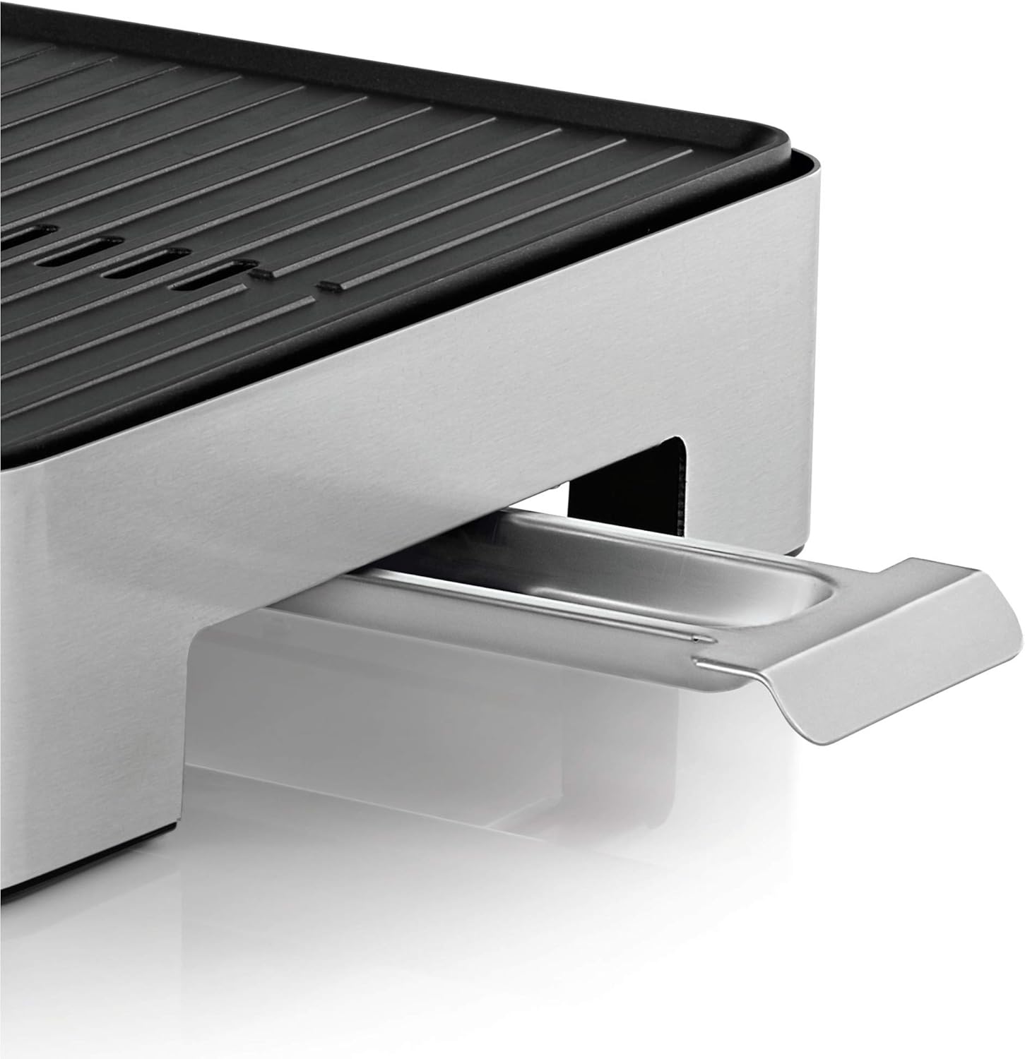 Inhalt: 1x Tischgrill elektro aus Cromargan Edelstahl matt (35,2 x 28,4 x 8 cm, Grillfläche 27 x 27 cm, 1250 W) - Artikelnummer: 0415190011 Dekorativer Tischgrill aus hochwertigem Cromargan matt mit quadratischer, gerippter Grillfläche 27 x 27 cm Ideal geeignet für gesundes, fettarmes Grillen zuhause; die antihaftbeschichtete Gussplatte kann ganz auf Fett verzichten Variable, stufenloseTemperatureinstellung mit LED-Beleuchtung Herausnehmbare Auffangschale und Grillplatte spülmaschinenfest | قیمت یورویی : 79.59€