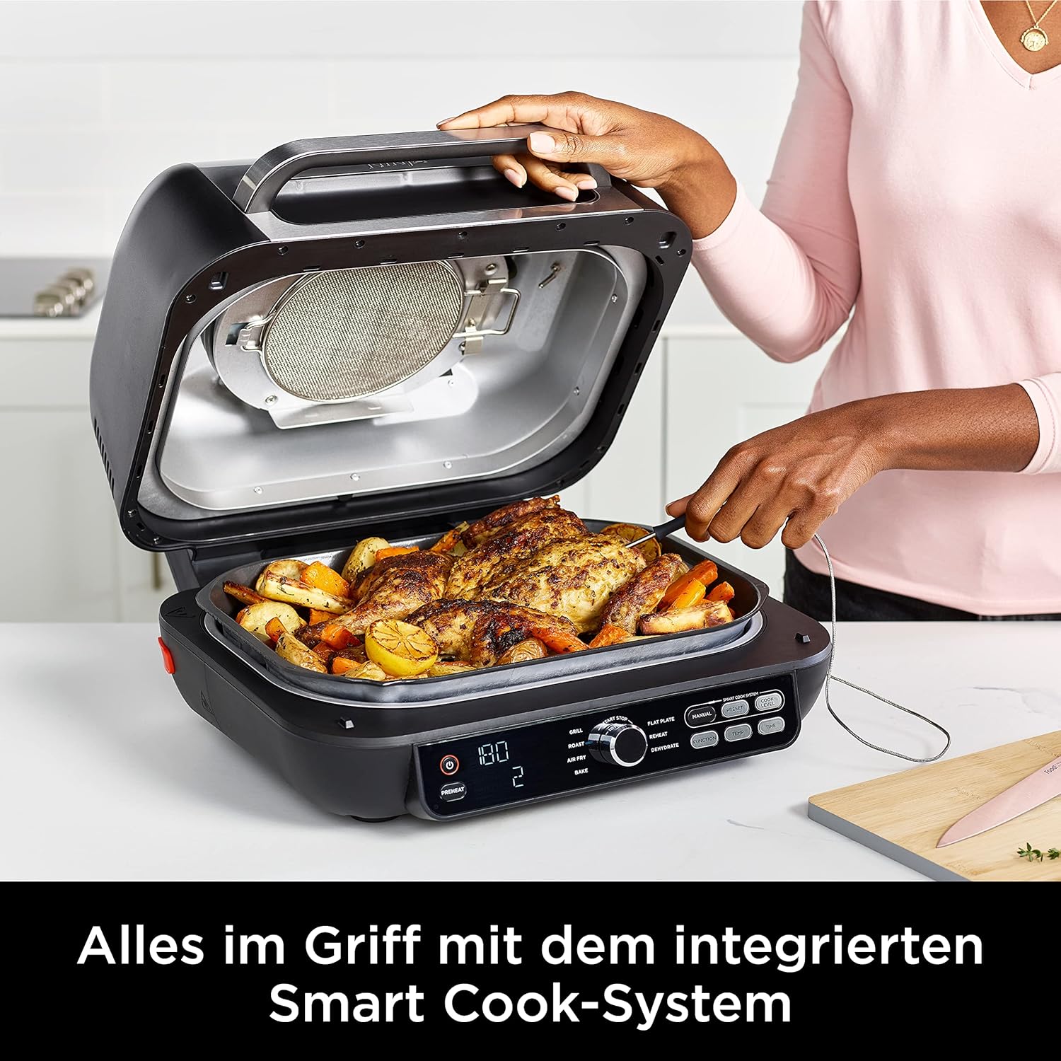 SPAREN SIE BIS ZU 55% Energiekosten gegenüber Backöfen mit Ninja Heißluftfritteusen* (*Tests & Berechnungen auf Grundlage der empfohlenen Garzeit für Würstchen bei Verwenden der Heißluftfrittieren-Funktion im Vergleich zu zwei repräsentativen Öfen) GROSSER GRILL MIT GROSSER KAPAZITÄT & PERFEKTEN ERGEBNISSEN: Der integrierte digitale Temperaturfühler überwacht die Temperatur der Speisen während des Kochens und informiert Sie, wann es bereit zum Entnehmen ist. Genau so gekocht, wie Sie es mögen 7 VIELSEITIGE FUNKTIONEN: Grillen, Flache Platte, Air Fry, Backen, Rösten, Aufwärmen, Dehydrieren & EINFACH ZU REINIGEN: Abnehmbare Teile sind antihaftbeschichtet und spülmaschinenfest für einfache Reinigung GRILLEN OHNE WENDEN: Grillen Sie wie ein Profi mit der Cyclonic Air Technology, die Temperaturen von bis zu 260°C um Ihr Essen zirkulieren lässt, für gleichmäßiges Garen und 360° Anbraten Enthält: Ninja Foodi Max Pro Grill (EU-Stecker), Grillplatte mit Stromversorgung, Flache Platte, 3,8L Crisper-Kochtopf, Rezeptführer. Perfekt für 4-6 Personen. Antihaftbeschichtete, spülmaschinenfeste Teile. Farbe Silber/Schwarz ABMESSUNGEN: H28 x B39 x T42 cm. Gewicht: 10 kg | قیمت یورویی : 263.99€