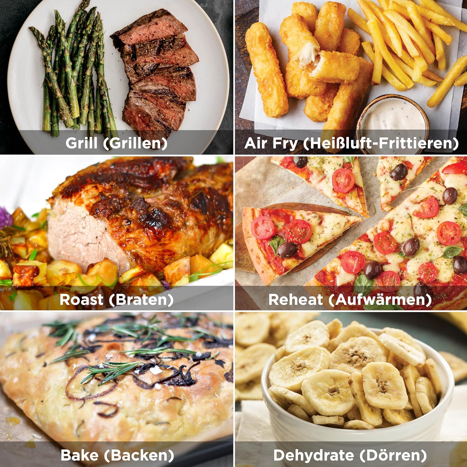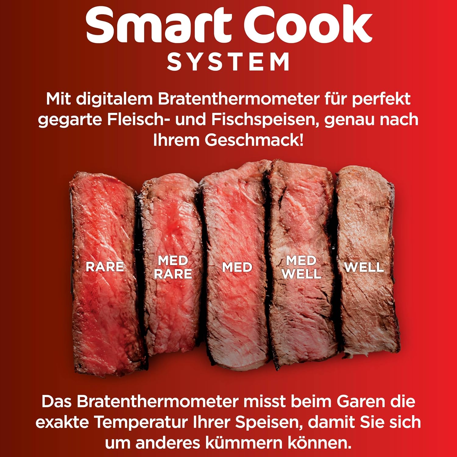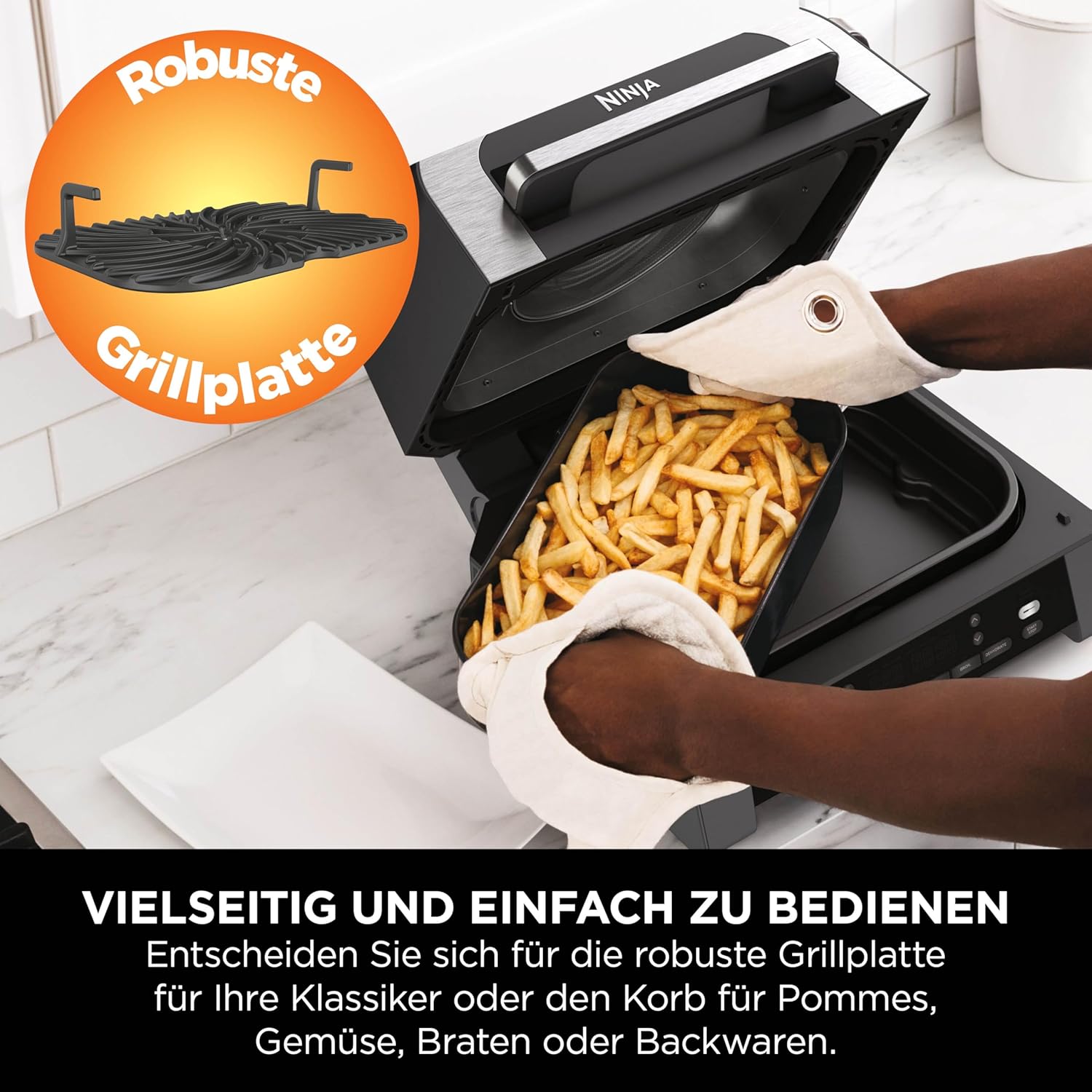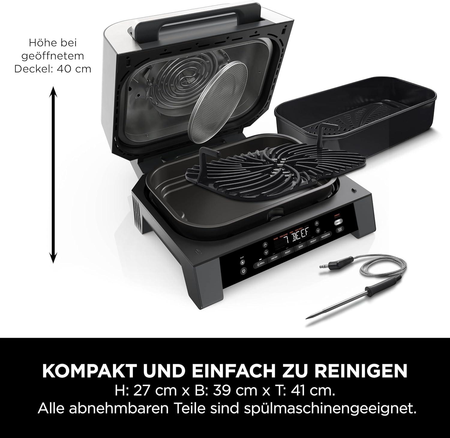 6 ANPASSBARE KOCHFUNKTIONEN: Grillen, Heißluftfrittieren, Braten, Backen, Dörren & Aufwärmen – alles in einem Gerät SCHNELLES & GLEICHMÄSSIGES GRILLEN BEI HOHER HITZE: Das Brutzeln und Anbraten auf der schweren Grillplatte sorgt für ein authentisches Grillaroma mit frischem oder gefrorenem Grillgut – ganz ohne Wenden SMART-COOK-SYSTEM: Das integrierte Thermometer sorgt dafür, dass Fleisch oder Fisch immer perfekt gegart werden BIS ZU 6 PORTIONEN: In den 3,8-Liter-Kochtopf passt ein 1,4 kg schweres Hähnchen oder ein Nussbraten, auf der Grillplatte können Sie bis zu 6 Burger oder Blumenkohlsteaks braten und im 3,8-l-Korb 1 kg Pommes frites zubereiten ENTHÄLT: 3,8-l-Kochtopf, 3,8-l-Korb, XL-Grillplatte, Korb, digitaler Temperaturfühler, Reinigungsbürste & Rezepte. Gewicht: 7,5 kg. Farbe: Grau/Silber ABMESSUNGEN: H: 40 cm x B: 28,2 cm x L: 42 cm. 2 Jahre Garantie bei Registrierung mit Ninja | قیمت یورویی : 223.62€