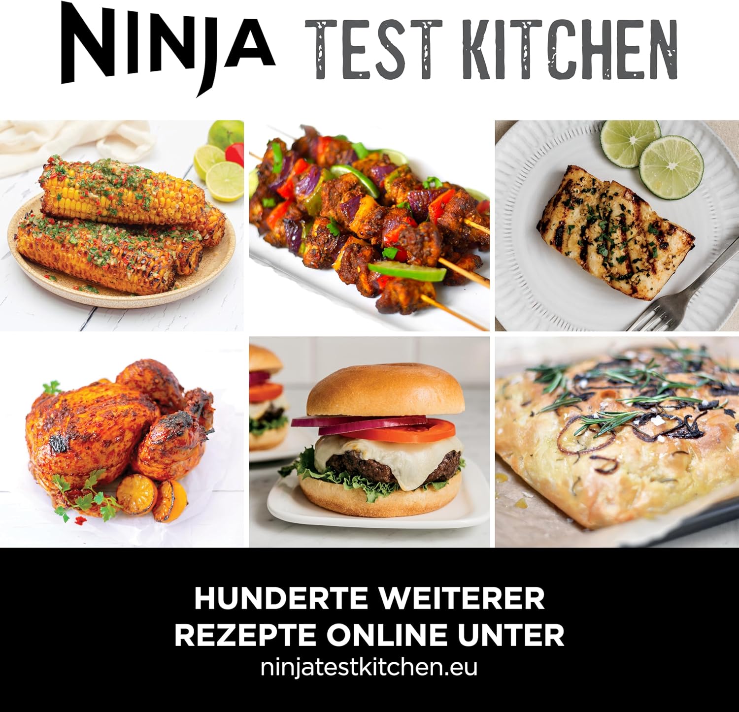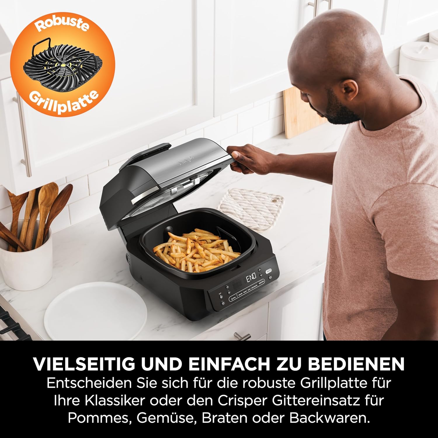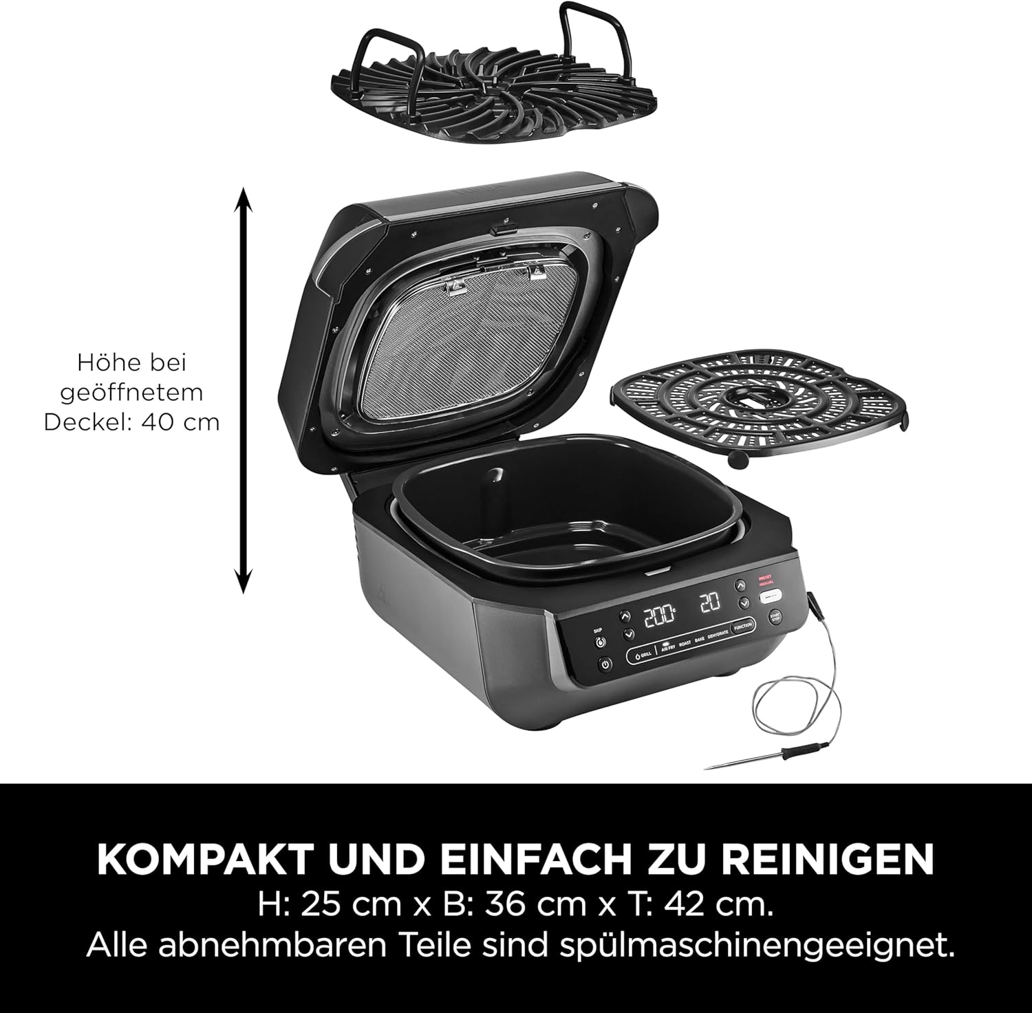 5 ANPASSBARE KOCHFUNKTIONEN: Grillen, Heißluftfrittieren, Braten, Backen & Dörren – alles in einem Gerät SCHNELLES & GLEICHMÄSSIGES GRILLEN BEI HOHER HITZE: Das Brutzeln und Anbraten auf der schweren Grillplatte sorgt für ein authentisches Grillaroma mit frischem oder gefrorenem Grillgut – ganz ohne wenden SMART-COOK-SYSTEM: Das integrierte Thermometer sorgt dafür, dass Fleisch oder Fisch immer perfekt gegart werden BIS ZU 4 PORTIONEN: In den 5,7-Liter-Kochtopf passt ein 1,4 kg schweres Hähnchen oder ein Nussbraten und auf der Grillplatte können Sie bis zu 4 Burger oder Blumenkohlsteaks braten ENTHÄLT: 5,7-L-Kochtopf, Grillplatte, Korb, Spritzschutz, digitaler Temperaturfühler, Reinigungsbürste & Rezepte. Gewicht: 8,3 kg. Farbe: Schwarz/Silber ABMESSUNGEN: H: 43 cm x B: 28 cm x L: 35,5 cm. 2 Jahre Garantie bei Registrierung mit Ninja | قیمت یورویی : 189.98€