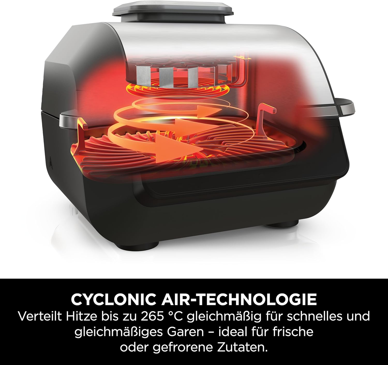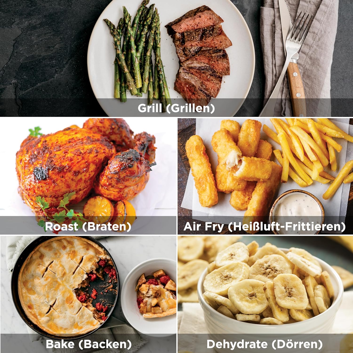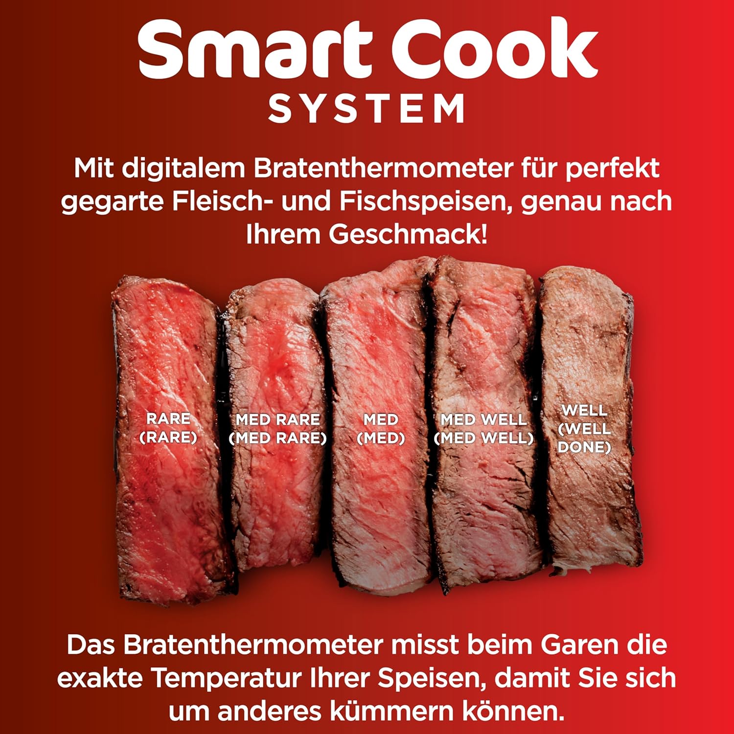 5 ANPASSBARE KOCHFUNKTIONEN: Grillen, Heißluftfrittieren, Braten, Backen & Dörren – alles in einem Gerät SCHNELLES & GLEICHMÄSSIGES GRILLEN BEI HOHER HITZE: Das Brutzeln und Anbraten auf der schweren Grillplatte sorgt für ein authentisches Grillaroma mit frischem oder gefrorenem Grillgut – ganz ohne wenden SMART-COOK-SYSTEM: Das integrierte Thermometer sorgt dafür, dass Fleisch oder Fisch immer perfekt gegart werden BIS ZU 4 PORTIONEN: In den 5,7-Liter-Kochtopf passt ein 1,4 kg schweres Hähnchen oder ein Nussbraten und auf der Grillplatte können Sie bis zu 4 Burger oder Blumenkohlsteaks braten ENTHÄLT: 5,7-L-Kochtopf, Grillplatte, Korb, Spritzschutz, digitaler Temperaturfühler, Reinigungsbürste & Rezepte. Gewicht: 8,3 kg. Farbe: Schwarz/Silber ABMESSUNGEN: H: 43 cm x B: 28 cm x L: 35,5 cm. 2 Jahre Garantie bei Registrierung mit Ninja | قیمت یورویی : 189.98€