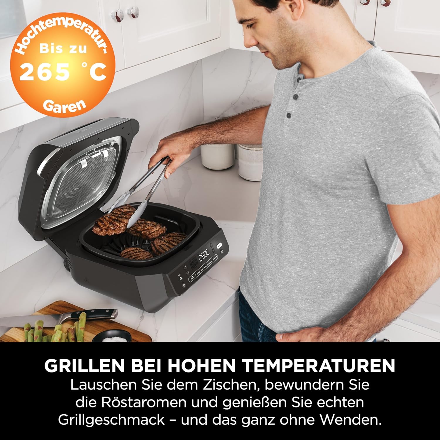 Ninja 5-in-1-Grill & -Heißluftfritteuse für den Innenraum, 5 Kochfunktionen, für bis zu 4 Burger, 5,7-l-Fassungsvermögen, raucharm, enthält digitales Bratthermometer, Schwarz/Silber, EG351EU 5-in-1-Grill & -Heißluftfritteuse 5,7L Schwarz/Silber
