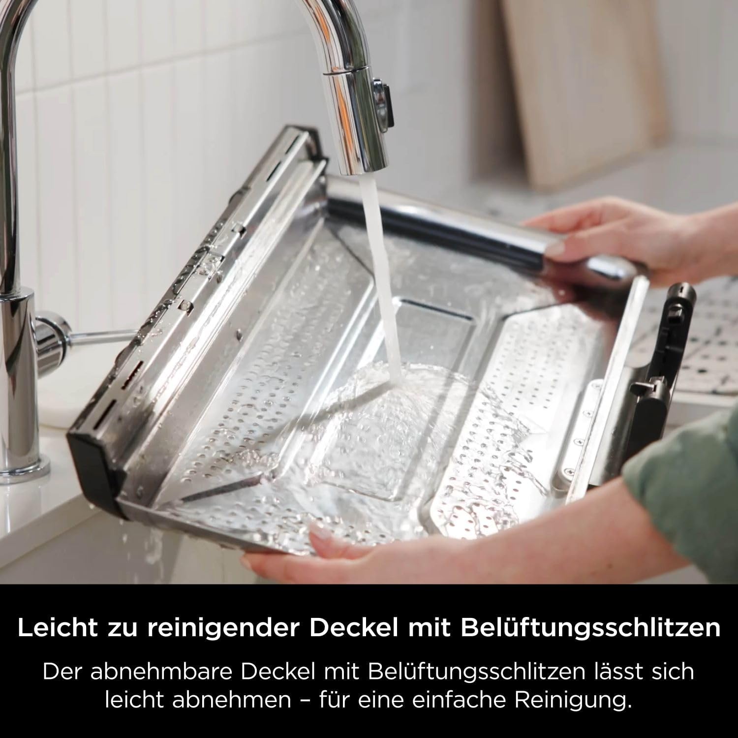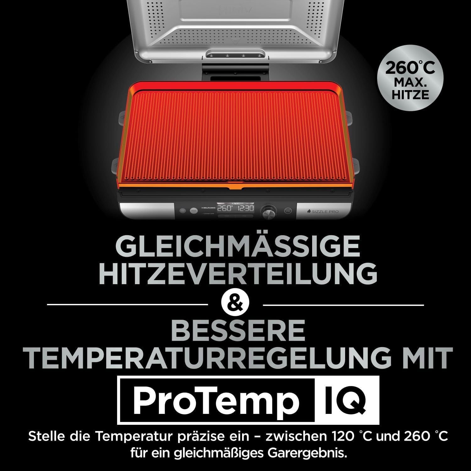 40 % MEHR FASSUNGSVERMÖGEN (IM VERGLEICH ZUM NINJA SIZZLE GR101): Die breite Kochfläche des Zimmergrills bietet Platz für bis zu 10 Burger, Hähnchen- oder Lachsfilets. Perfekt für Mahlzeiten unter der Woche und für die ganze Familie. AUTHENTISCHES HOLZKOHLE-AROMA FÜR DIE KÜCHE: Mit der pflegeleichten, antihaftbeschichteten Grillplatte und Plancha zum Anbraten und Durchbraten – Fajitas, Smash-Burger und mehr. BESSERE TEMPERATURREGELUNG MIT PROTEMP IQ (IM VERGLEICH ZUM NINJA SIZZLE GR101): Stelle die Temperatur für präzises Garen zum Braten und Anbraten von 120 bis 260 °C ein. Mit Timer-Funktion. 3 KOCHVARIANTEN MIT DEM DECKEL MIT BELÜFTUNGSSCHLITZEN: Gare mit geschlossenem, geöffnetem oder abgenommenem Deckel. Mit abgenommenem Deckel: Ideal zum Schmelzen von Käse, Umrühren oder für Teppanyaki-Gerichte. BEINHALTET: Ninja XL Sizzle Pro Indoor-Grill elektrisch (EU-Stecker), abnehmbaren Deckel, antihaftbeschichtete Grillplatte und Plancha, Fettauffangschale, Kurzanleitung mit Rezepten. ABMESSUNGEN: L: 53 cm x B: 39 cm x H: 15 cm. Gesamtkochfläche: 1.150 cm². Farbe: Silber/Schwarz. | قیمت یورویی : 199.99€