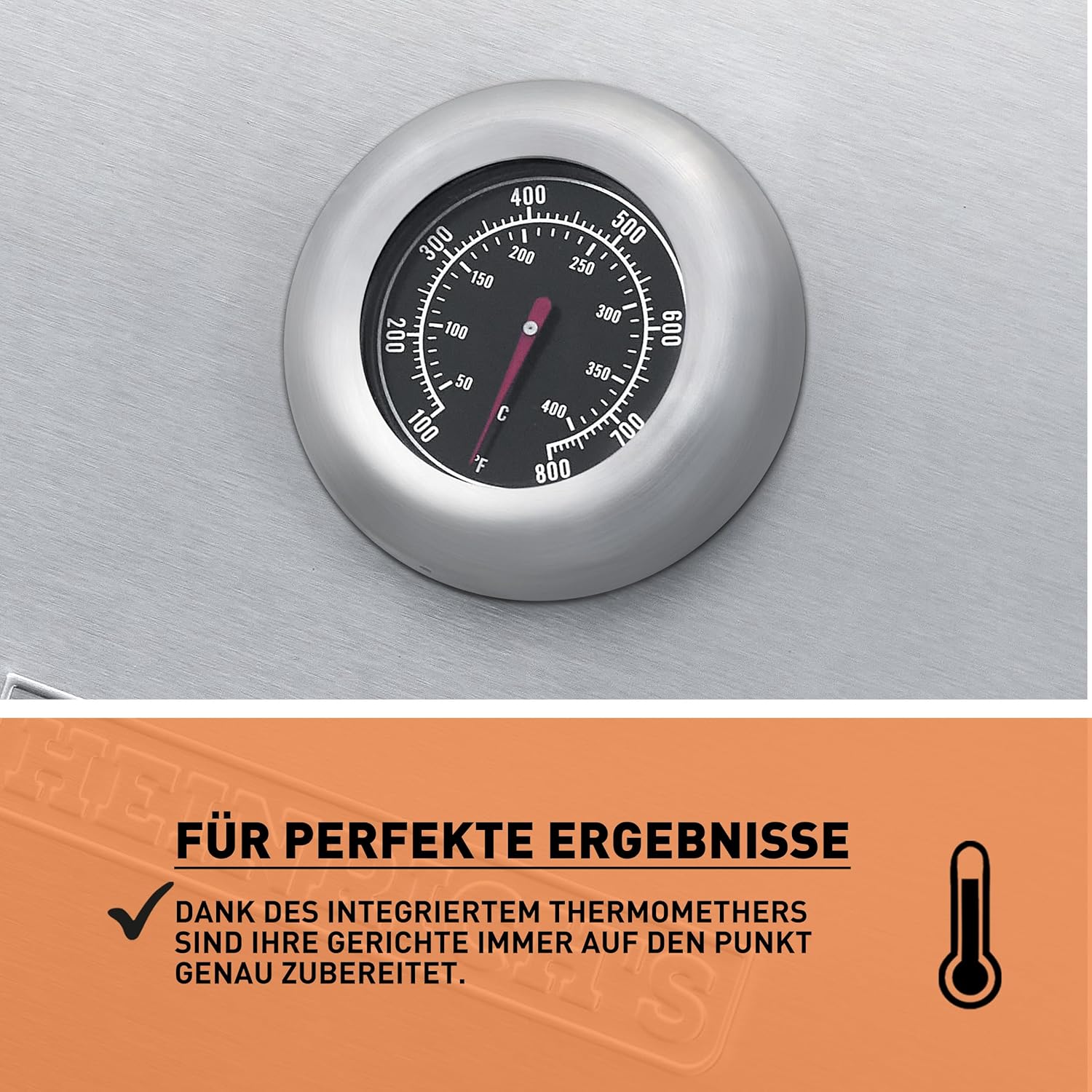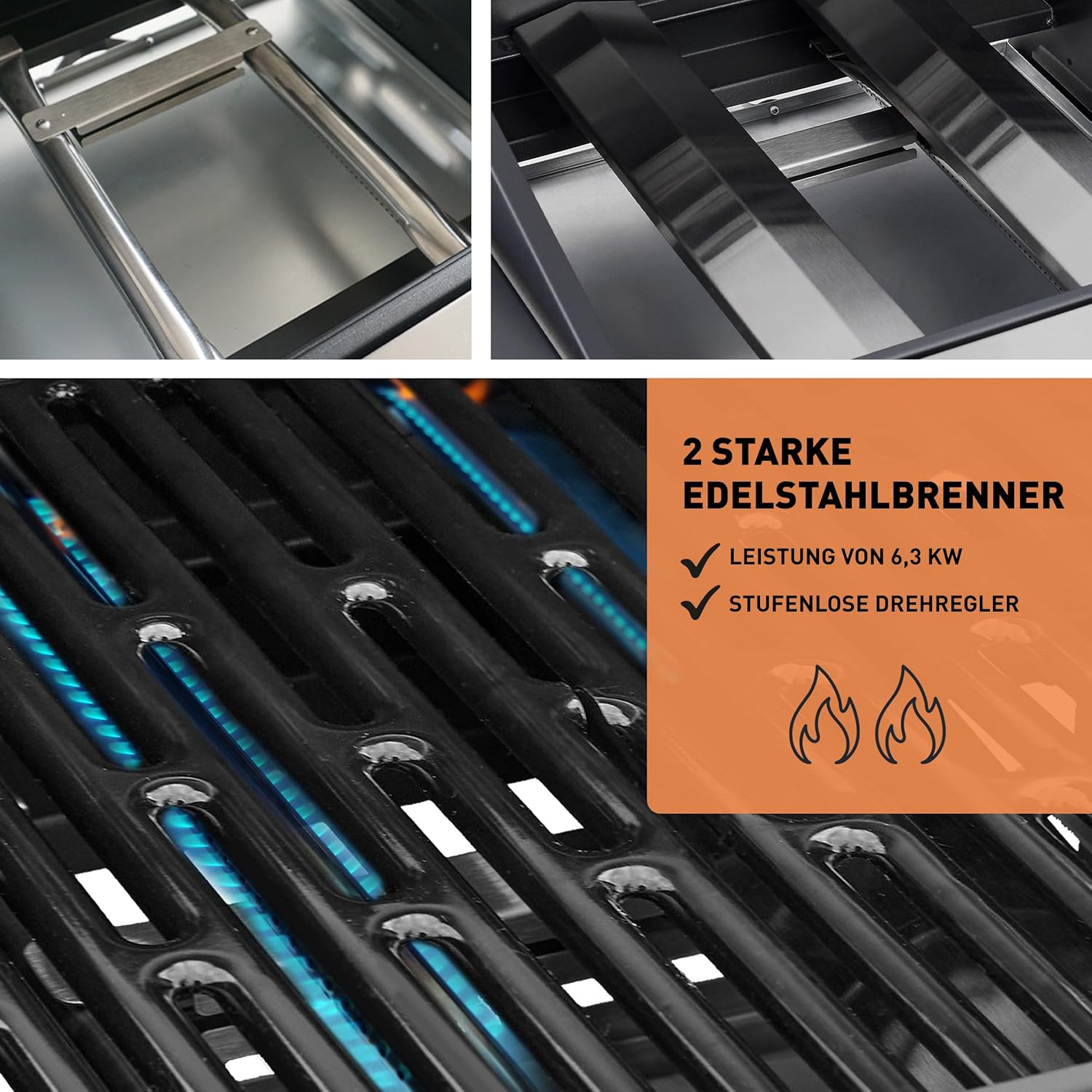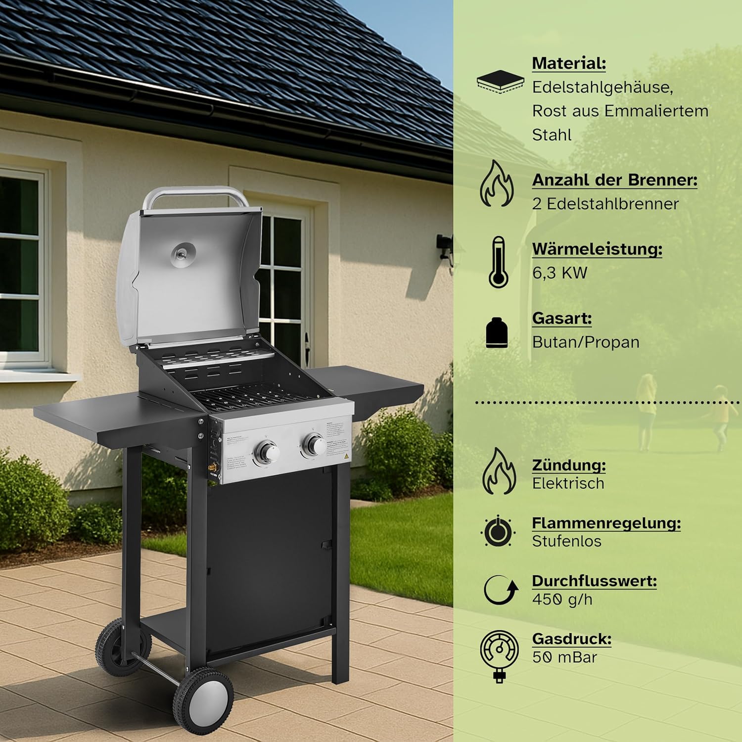 👍 GRILLVERGNÜGEN- Ob im Garten, auf der Terrasse, dem Balkon oder beim Camping-der Heinrichs BBQ Gasgrill passt perfekt in jede Umgebung und sorgt für unvergessliche Grillabende mit Familie und Freunden. ✅ KONFORM und LEISTUNGSSTARK-Die 2-Edelstahlbrenner mit 6,3 kW Leistung sorgen für kraftvolles und gleichmäßiges Grillen. Ausgestattet mit einem Gehäuseschrank für 5 Kg Gasflaschen und Gasgriller inkl. Druckminderer und Gasschlauch ist der Gasgrill für Deutschland und Österreich konform. 💪 FLEXIBEL: Die zwei 40x35 cm großen klappbaren Seitenablagen bieten einen idealen Abstellplatz für Ihre Grillspezialitäten und sorgen eingeklappt für eine platzsparende Einlagerung. Außerdem sorgen die Warmhalteroste für langanhaltende Temperaturspeicherung. 🎨SCHLANKES DESIGN - welches perfekt für ein Grillerlebnis geeignet ist und überall seinen Platz findet. Dank der stufenlosen Temperaturregelung können Sie Grillfleisch/Fisch/Grillgemüse auf dem 42,5x36cm Grillrost nach Ihrem belieben und Geschmack grillen. Die integrierte Temperaturanzeige dient für den vollen Überblick und Erzielung des individuellen Grillgenusses. 🎁Freude beim Verschenken: Überraschen Sie Ihre Liebsten mit unseren Produkten. Wir stehen Ihnen auch dort mit Rat und Tat zur Seite. | قیمت یورویی : 189.99€