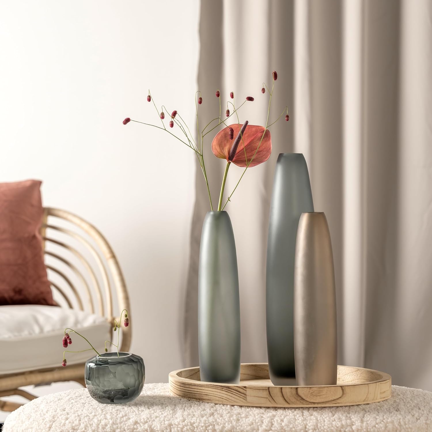 Stil: Elegante und stilvolle schmale Glasvase mit einer Höhe von 35 cm und einem Durchmesser von 8 cm. Die farbige Dekovase eignet sich besonders für langstielige einzelne Blumen wie Rosen, kann aber auch für Trockenblumen, und Zweige verwendet werden. Material: In Handarbeit aus hochwertigem Kalk-Natron Glas in natürlichem Beige gefertigt, jedes Stück ist ein Unikat. Mit matter Außenseite, die dekorativ ist und eine angenehme Haptik bietet. Massiver Boden für sicheren Stand auf dem Boden oder Tisch. Anwendung: Die hohe Blumenvase ist ideal für langstielige einzelne Blumen wie Rosen oder Lilien, sowie andere Dekorationen geeignet. Schaffen Sie kinderleicht abwechslungsreiche Arrangements auf dem Esstisch, im Wohnzimmer, Schlafzimmer oder Büro. Vielseitig: Die zeitlose Ästhetik der Vase passt perfekt in moderne Wohnräume und lässt sich mit jeder Art von Einrichtungsstil kombinieren. Die Serie Bellagio umfasst Blumenvasen in verschiedenen Formen und modernen Farben, die kombiniert werden können. Daten: Schlanke Bodenvase aus hochwertigem Glas - Handgemacht, jedes Stück ein Unikat - Höhe 35 cm, Ø 8 cm - Gewicht 800 g - Farbe: beige, auch in anderen Farben & Größen erhältlich - Verpackt im bedruckten Geschenkkarton - Hergestellt in Deutschland | قیمت یورویی : 52.9€