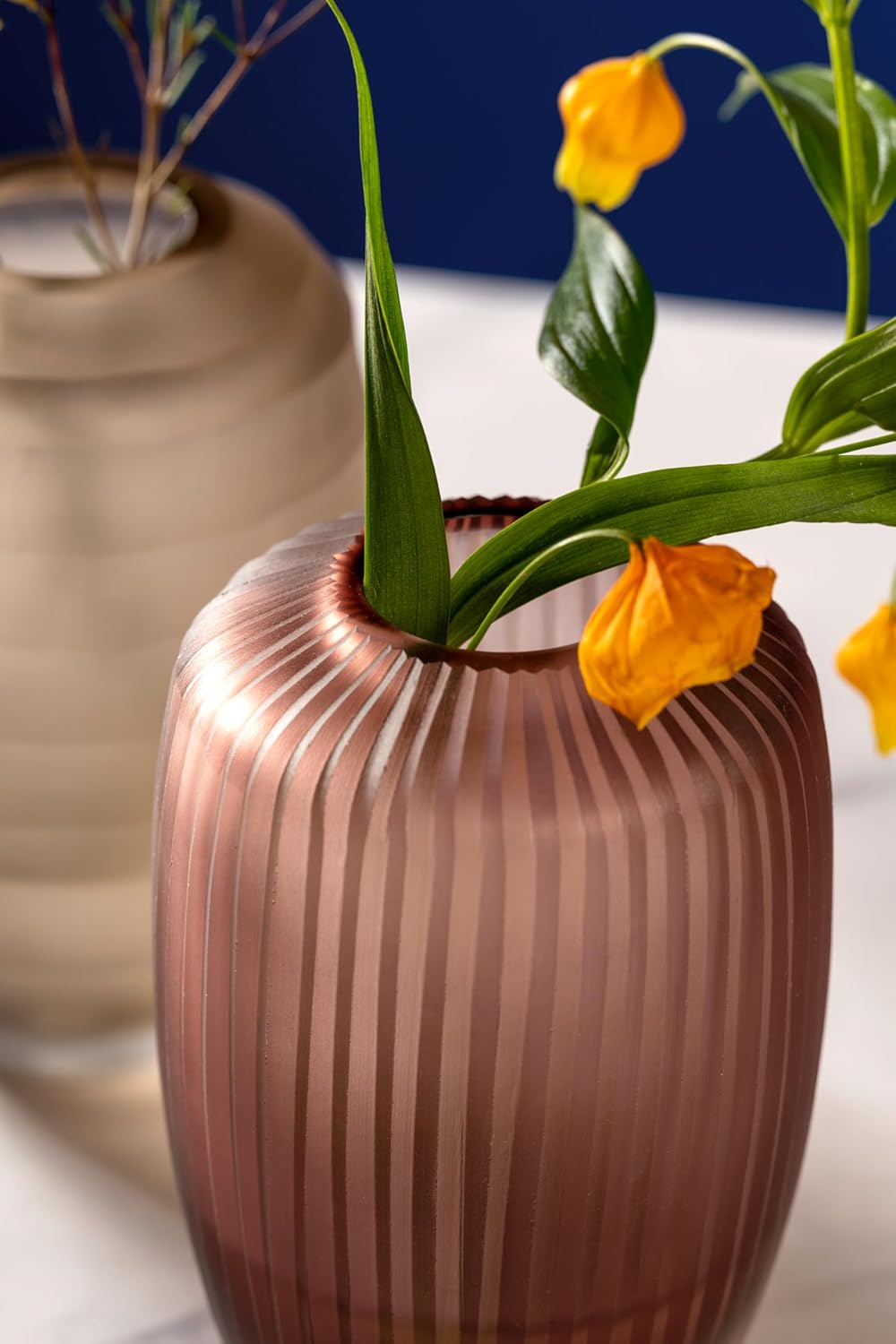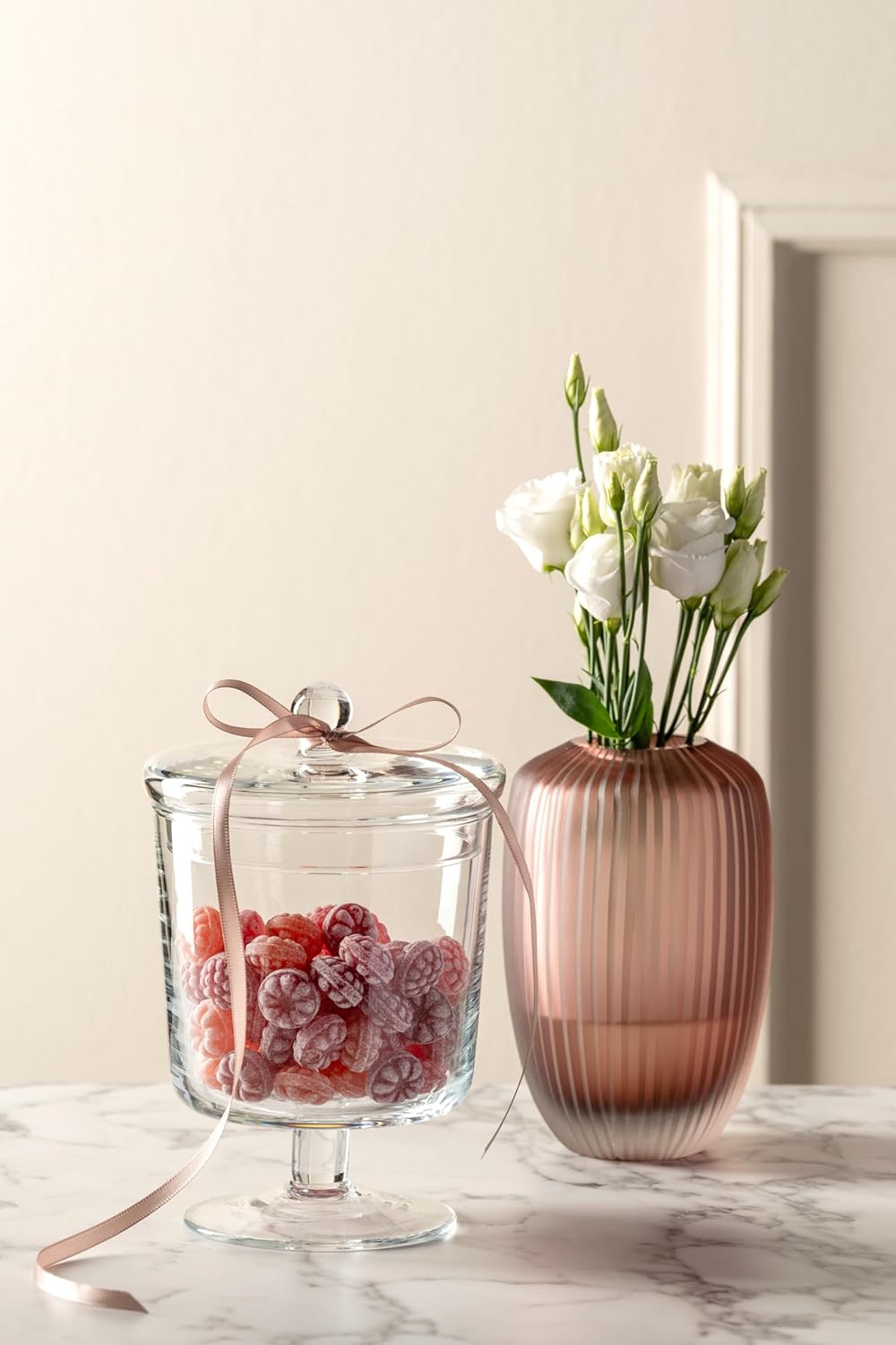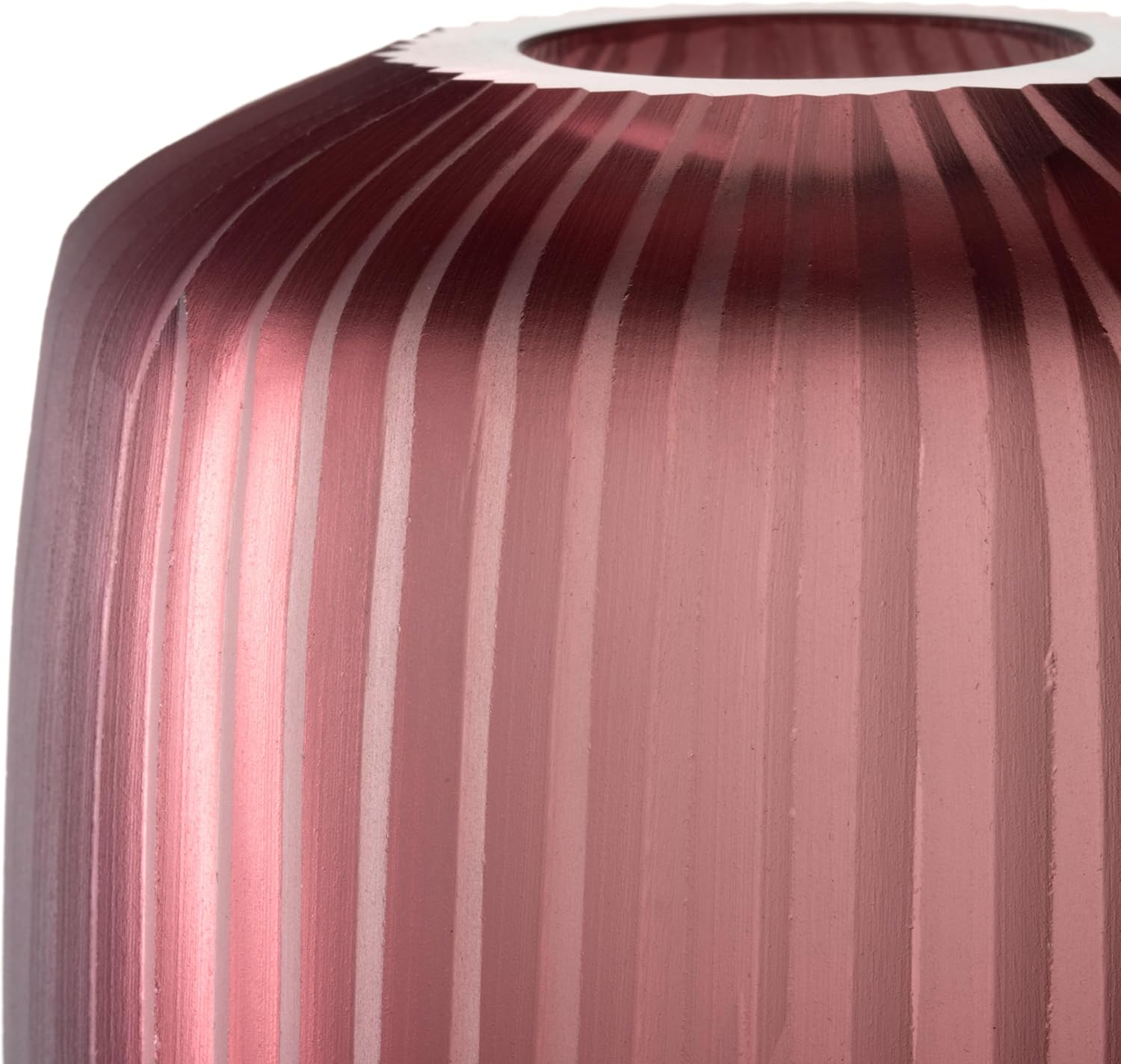 Stil: Elegante und stilvolle runde Glasvase mit einer Höhe von 16 cm und einem Durchmesser von 10 cm. Die farbige Dekovase eignet sich besonders gut für frische Blumen wie Tulpen und Rosen, kann aber auch für Trockenblumen, und Zweige verwendet werden. Material: In Handarbeit aus hochwertigem Kalk-Natron Glas in warmem Berry-Farbton gefertigt. Mit schönem klassischem Relief in Längsstreifen außen, das dekorativ ist und eine angenehme Haptik bietet. Massiver Boden für sicheren Stand auf dem Tisch. Anwendung: Die kleine Tischvase ist perfekt für kleine und mittlere Blumensträuße, sowie andere Dekorationen geeignet. Schaffen Sie kinderleicht abwechslungsreiche Arrangements im und Tischdekorationen in Ess- und Wohnzimmer, Schlafzimmer oder Büro. Vielseitig: Die zeitlose Ästhetik der Vase passt perfekt in moderne Wohnräume und lässt sich mit jeder Art von Einrichtungsstil kombinieren. Die Serie Bellagio umfasst Blumenvasen in verschiedenen Formen und modernen Farben, die kombiniert werden können. Daten: Mittelgroße Tischvase aus hochwertigem Glas - Handgemacht, jedes Stück ein Unikat - Höhe 16 cm, Ø 10 cm - Gewicht 550 g - Farbe: dunkelrosé, auch in anderen Größen erhältlich - Verpackt im bedruckten Geschenkkarton - Hergestellt in Deutschland | قیمت یورویی : 47.9€