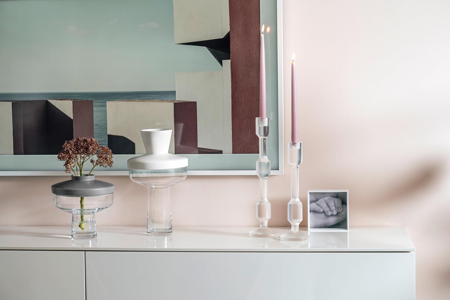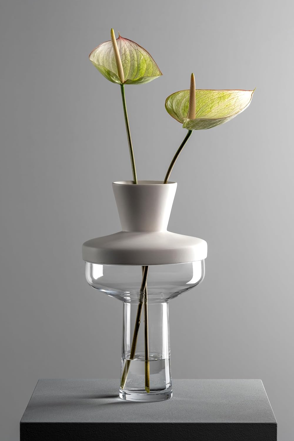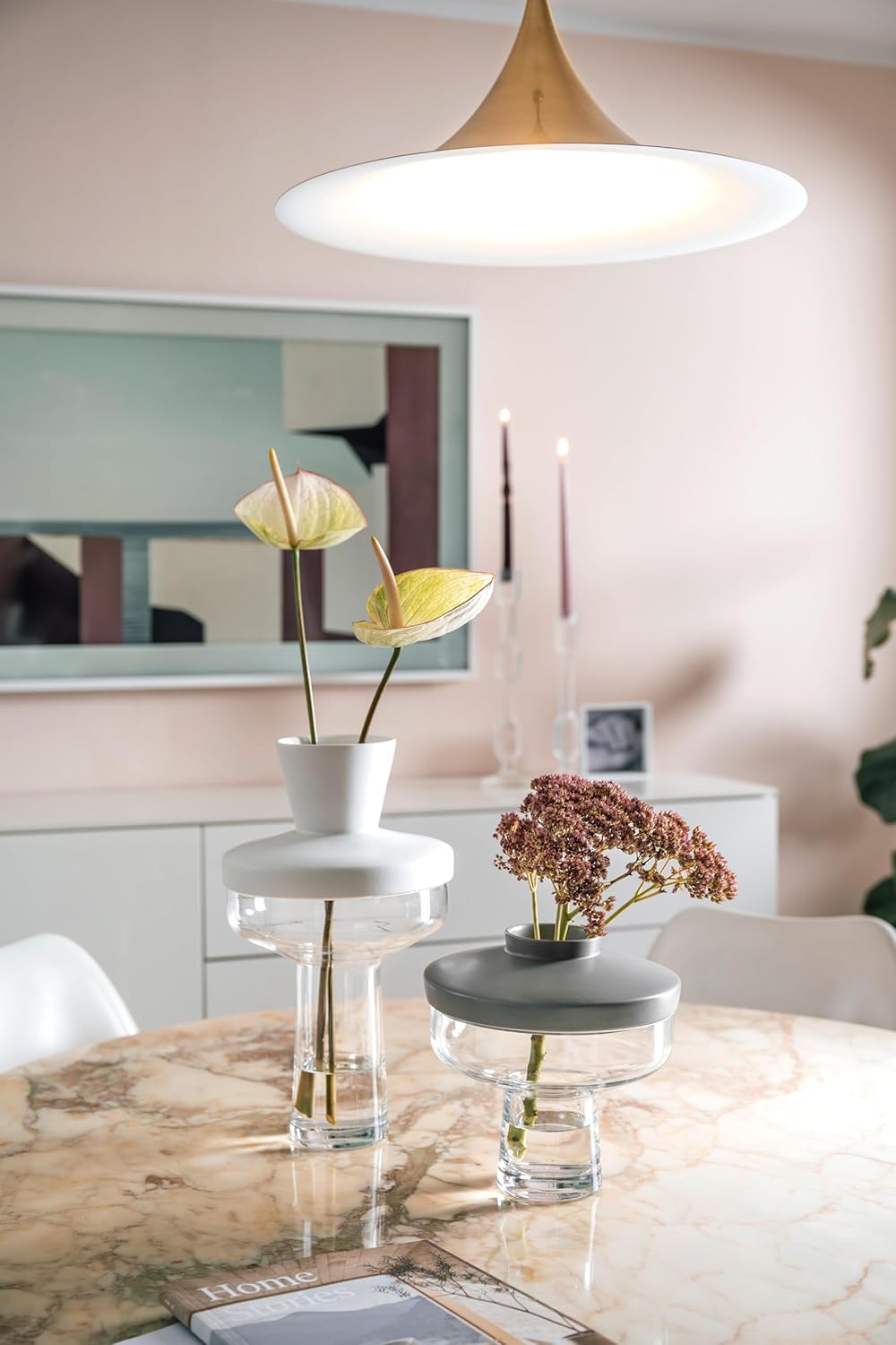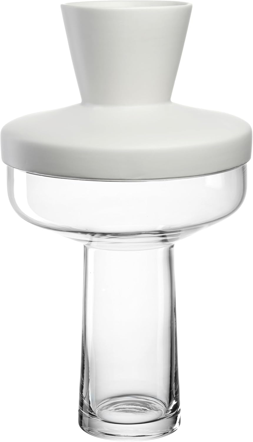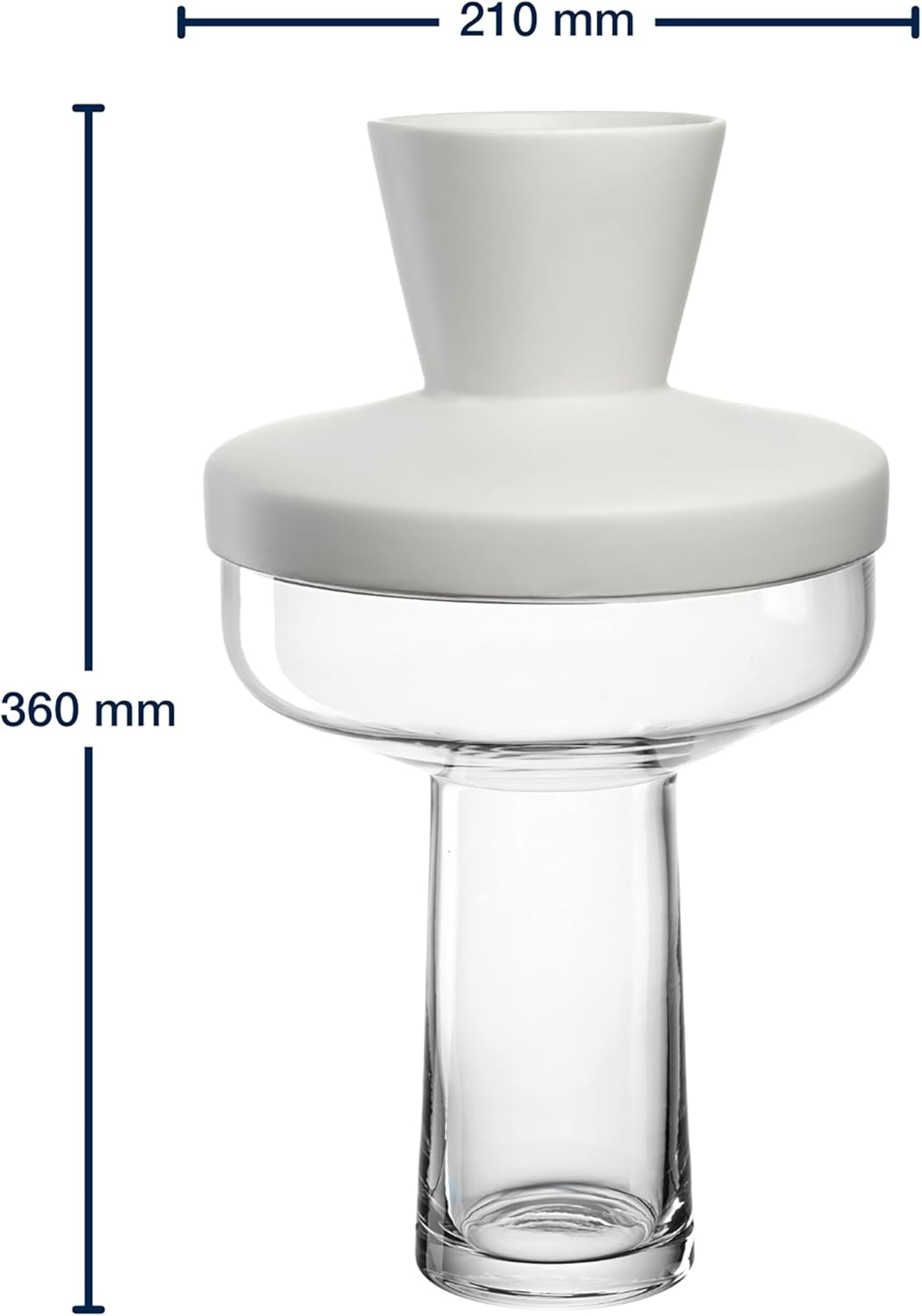 Mit der Vase RIVA von LEONARDO setzt du auf ein elegantes Wohnaccessoire, das Glas und Porzellan in perfekter Harmonie vereint. Der stilvolle Porzellanaufsatz verleiht dieser außergewöhnlichen Dekovase einen modernen Charakter und lässt sich ideal mit weiteren Designstücken aus der LEONARDO HOME Kollektion kombinieren Die Kombination aus klarer Glasvase und mattem, weißen Porzellan sorgt für einen edlen Look, der sowohl mit als auch ohne Blumen beeindruckt. Der raffinierte Aufsatz dieser besonderen Objektvase bringt Struktur in jedes Arrangement und lässt deine Blumen stilvoll zur Geltung kommen Ob du einzelne Stiele perfekt in Szene setzen möchtest oder einen kleinen Strauß arrangierst – die RIVA Blumenvase bietet dir unzählige Möglichkeiten für kreative Dekorationen. Auch als minimalistisches Deko-Objekt überzeugt sie durch ihre zeitlose Eleganz und moderne Ausstrahlung Die robuste Tischvase kombiniert edles Glas mit feinem Porzellan und steht für langlebige Qualität sowie stilvolles Design. Mit der RIVA Vase holst du dir ein besonderes Wohnaccessoire, das durch Funktionalität und ästhetische Raffinesse begeistert Lieferumfang & Maße: 1 Vase, weiß, 38,3 x 21,2 x 21,2 cm (HxBxT), 2 kg, ⌀ 6,6 cm an schmalster Stelle | قیمت یورویی : 61.68€
