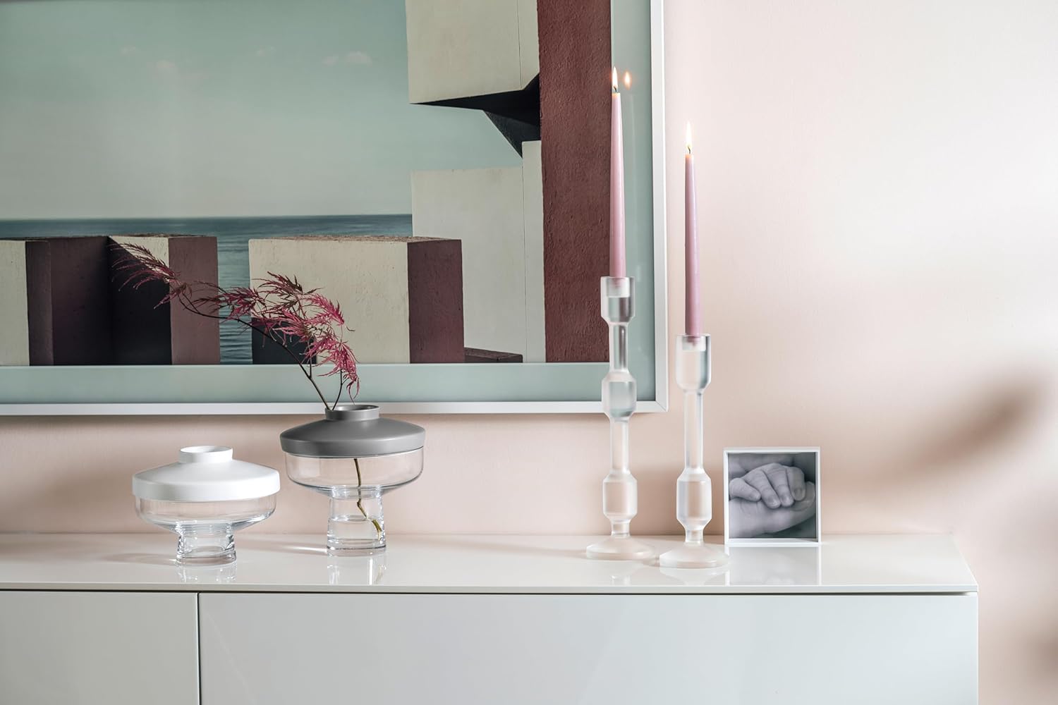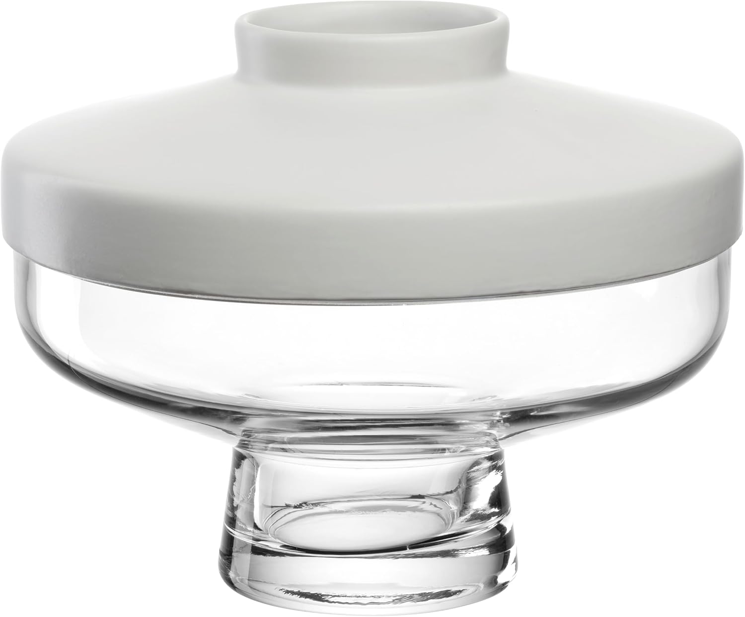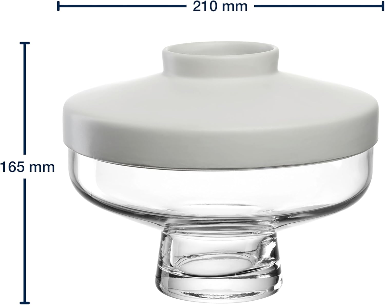 Mit der Vase RIVA von LEONARDO setzt du auf ein elegantes Wohnaccessoire, das Glas und Porzellan in perfekter Harmonie vereint. Der stilvolle Porzellanaufsatz verleiht dieser außergewöhnlichen Dekovase einen modernen Charakter und lässt sich ideal mit weiteren Designstücken aus der LEONARDO HOME Kollektion kombinieren Die Kombination aus klarer Glasvase und mattem, weißen Porzellan sorgt für einen edlen Look, der sowohl mit als auch ohne Blumen beeindruckt. Der raffinierte Aufsatz dieser besonderen Objektvase bringt Struktur in jedes Arrangement und lässt deine Blumen stilvoll zur Geltung kommen Ob du einzelne Stiele perfekt in Szene setzen möchtest oder einen kleinen Strauß arrangierst – die RIVA Blumenvase bietet dir unzählige Möglichkeiten für kreative Dekorationen. Auch als minimalistisches Deko-Objekt überzeugt sie durch ihre zeitlose Eleganz und moderne Ausstrahlung Die robuste Tischvase kombiniert edles Glas mit feinem Porzellan und steht für langlebige Qualität sowie stilvolles Design. Mit der RIVA Vase holst du dir ein besonderes Wohnaccessoire, das durch Funktionalität und ästhetische Raffinesse begeistert Lieferumfang & Maße: 1 Vase, weiß, 16,5 x 21,5 x 21,5 cm (HxBxT), 1,5 kg, ⌀ 7,5 cm an schmalster Stelle | قیمت یورویی : 47.38€