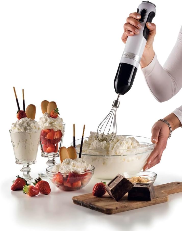 گوشت کوب و همزن Ariete مدل Moderna 602/01 با رنگ سفید و طراحی جمعوجور، گزینهای کاربردی برای آمادهسازی سریع غذاهای خانگی است.