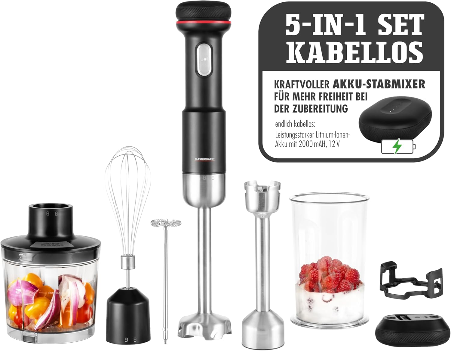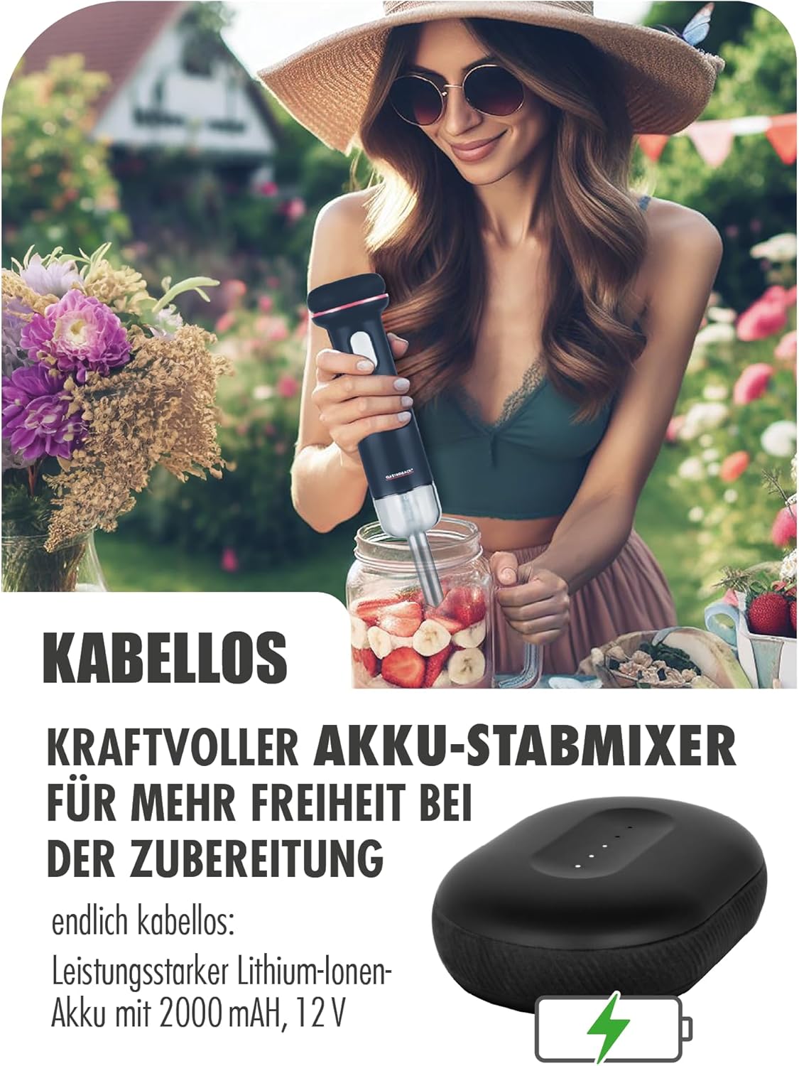 Kraftvoller Akku-Stabmixer für mehr Freiheit bei der Zubereitung Speed-Control-Taste: stufenlose Anpassung der Geschwindigkeit - je stärker der Tastendruck, desto höher die Leistung, 6000 - 13000 U/Min Leistungsstarker, abnehmbarer Lithium-Ionen-Akku (2000 mAH,12 V) und 180 Watt Hochleistungsmotor sorgen für eine optimale Laufzeit und Leistung Eine Akkuladung für alle Aufgaben: Akku-Laufzeit ca. 20 Minuten, Akku-Ladezeit ca. 4 Stunden (für vollständige Ladung bei 0% Akku) 21 cm Mixstab mit 4-fach Edelstahlmesser Mit Emulgieraufsatz (21 cm) für frische selbstgemachte Salatdressings, Aioli und Mayonnaise Verwendung auch als Zerkleinerer, Schneebesen und Milchaufschäumer Mit Topfschutz zur Vermeidung von Kratzern in hochwertigem Kochgeschirr, abnehmbar Umfangreiches Zubehör inklusive: Pürieraufsatz, Emulgieraufsatz, Multizerkleinerer (500 ml), Mixbehälter 700 ml), Schneebesenaufsatz und Milchaufschäumaufsatz Akku zum einfachen und platzsparenden Aufladen abnehmbar, inkl. Ladekabel | قیمت یورویی : 109.99€