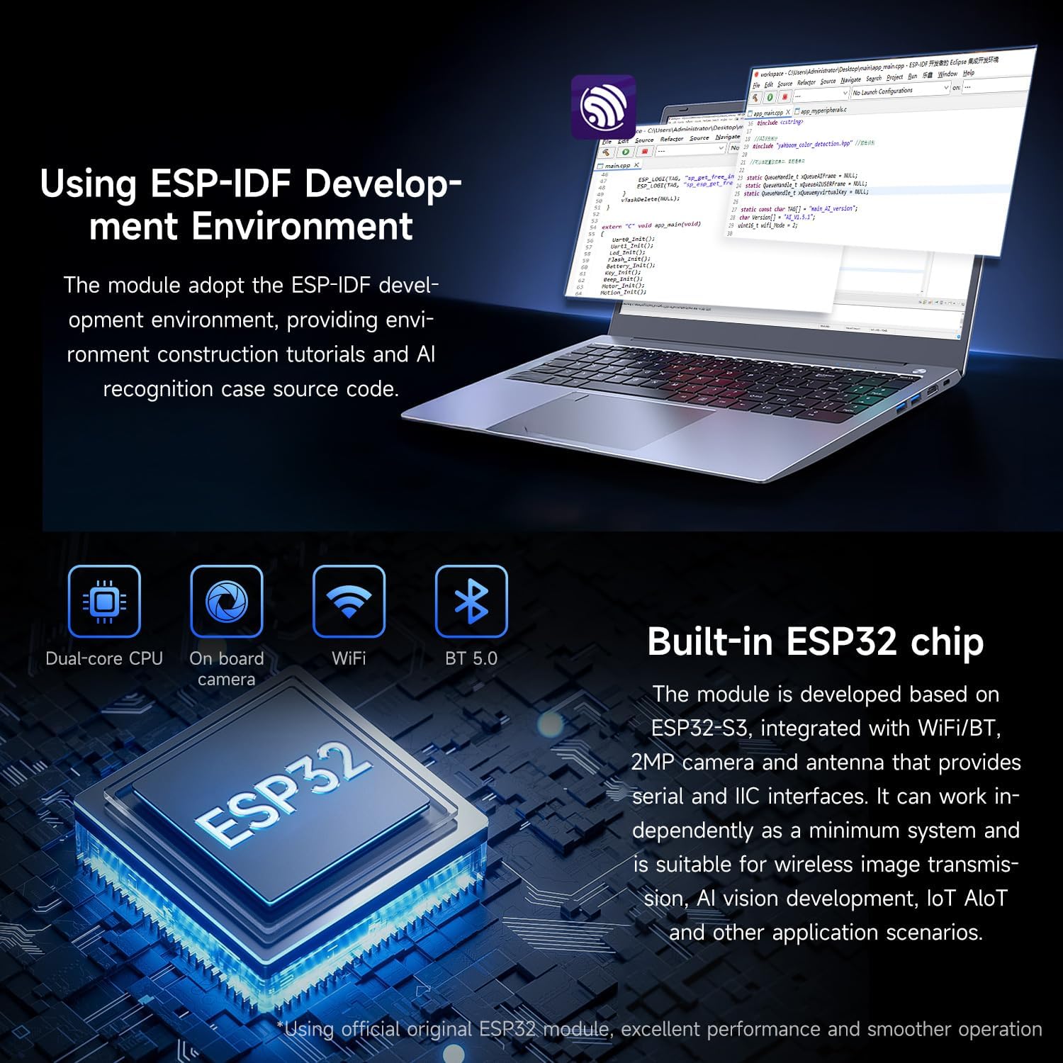 Yahboom ESP32-S3 CAM Module 2MP Camera,ESP32-S3 Chip,with Remote Control APP, Onboard Camera Wireless, Project Tutorial, Python C Code (Cam Lite Module+Board+2DOF PTZ) لینک آمازون : https://www.amazon.de/dp/B0DXF79W58?th=1&psc=1 تراشه ESP32-S3 با کارایی بالا و دوربین 2 مگاپیکسلی: مجهز به تراشه ESP32-S3، اتصال WI-FI پایدار و انتقال تصویر 2 مگاپیکسلی با کیفیت بالا را فراهم می کند، عملکرد کنترل از راه دور خودروی هوشمند را ارائه می دهد، از مشاهده جریان ویدئو در زمان واقعی پشتیبانی می کند و عملیات کنترل از راه دور بصری را درک می کند. اتصال شبکه دو حالته: از حالت هات اسپات (حالت AP) و حالت کلاینت (حالت STA)، حالت هات اسپات پیش فرض پشتیبانی می کند، به شبکه WI-FI موجود نیاز نیست، عملیات ساده و فاصله انتقال می تواند به 20 متر برسد. چندین گزینه ماژول بصری: Yahboom 4 ماژول بصری را برای رفع نیازهای مختلف توسعه ارائه می دهد. برای جزئیات بیشتر، لطفا نمودار مقایسه محصول را ببینید. سازگاری گسترده: مناسب برای STM32، MSPM0G3507، BBCmicrobit، Ard-uino و سایر میکروکنترلرها و همچنین می تواند از طریق پورت سریال به Raspberry-Pi، سری Jetson، RDK و سایر کنترلرهای اصلی متصل شود. اطلاعات کد را ارائه دهید: کد زیربنایی منبع باز است و برای کاربران با پایه برنامه نویسی مناسب است. ماژول انتقال تصویر با استفاده از محیط توسعه ESP-IDF ساخته شده است که آموزش های ساخت محیط و کد منبع تشخیص هوش مصنوعی را ارائه می دهد.