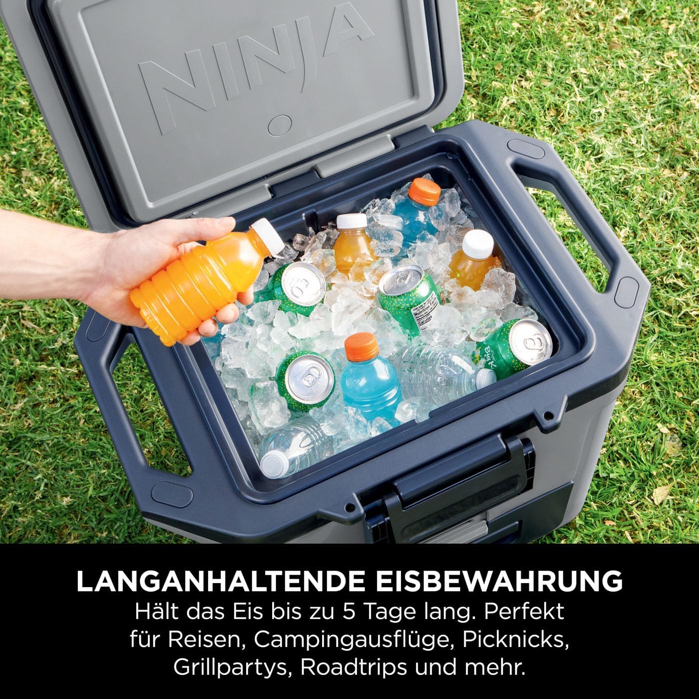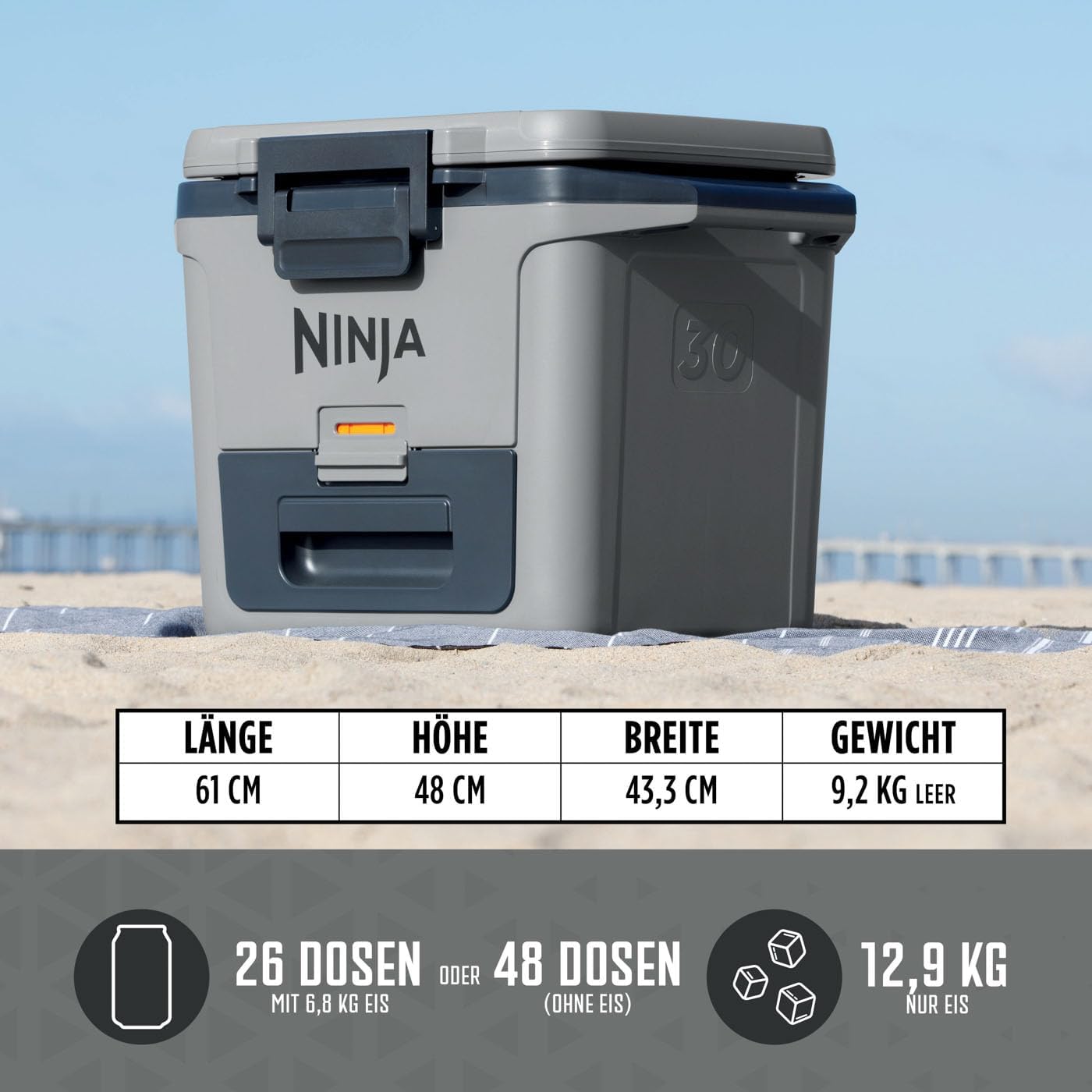 FROSTVAULT TECHNOLOGIE: Die Trockenzone-Schublade hält Lebensmittel kühl, trocken und getrennt. Lagern Sie sie tagelang bei lebensmittelsicheren Temperaturen (unter 4,5°C). Greifen Sie ganz einfach nach Ihren Lieblingsartikeln, ohne durch Eis graben zu müssen LANGANHALTENDE EISBEWAHRUNG: Hält das Eis bis zu 5 Tage lang. Perfekt für Reisen, Campingausflüge, Picknicks, Grillpartys, Roadtrips und vieles mehr 30-QUART / 28-LITER-KAPAZITÄT: Platz für bis zu 48 Dosen (ohne Eis) oder 26 Dosen mit Eis. Viel Platz für all Ihre Lieblingsgetränke ROBUST & SICHER: Kann auch als praktische Sitzgelegenheit verwendet werden. Hochbelastbare Konstruktion. Leicht zu transportieren dank strapazierfähiger geformter Tragegriffe. Abschließbarer Deckel und Schubladenriegel. Einhändig leicht zu öffnen ENTHÄLT: Ninja FrostVault 30-Quart / 28-Liter-Kühler mit integrierter Trockenzone-Schublade. Abmessungen: H: 48 cm B: 43,3 cm T: 61 cm. Gewicht: 9,2 kg. Farbe: Schiefergrau Kostenlose 5-Jahres-Garantie (bei Registrierung bei Ninja) | قیمت یورویی : 139.98€