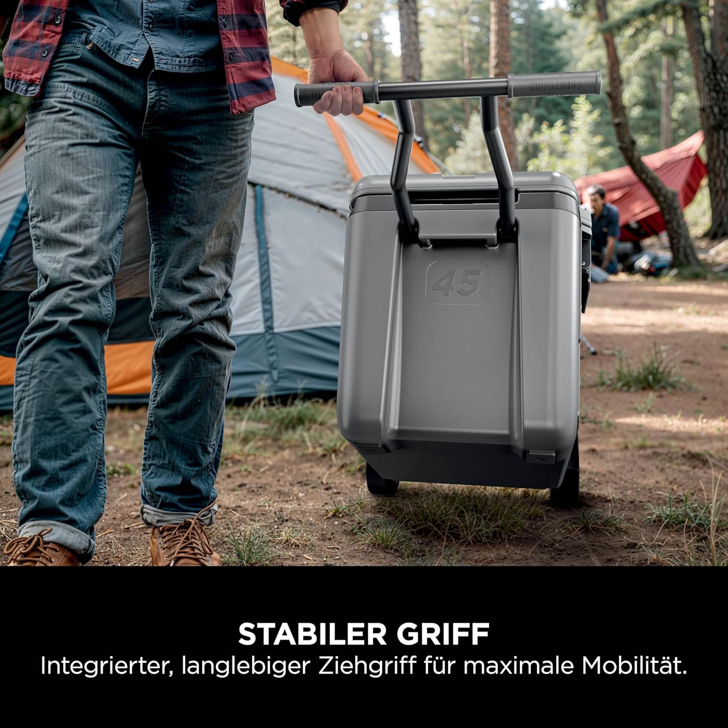 FROSTVAULT-TECHNOLOGIE: Die Dry-Zone-Schublade hält Lebensmittel kühl, trocken und getrennt. Lagern Sie sie tagelang bei lebensmittelsicheren Temperaturen (unter 4,5 °C)*. Greifen Sie nach Ihren Lieblingsspeisen, ohne im Eis wühlen zu müssen LANGLEBIGE RÄDER FÜR JEDES TERRAIN: Die Kühlbox mit Rädern lässt sich leicht transportieren. Perfekt für Reisen, Campingausflüge, Picknicks, Grillabende, Roadtrips und mehr 42-LITER-KAPAZITÄT: Für bis zu 68 Dosen ohne Eis oder 32 Dosen mit Eis. Erstklassige Eisspeicherung hält das Eis tagelang* LANGLEBIG UND SICHER: Dient auch als praktischer Sitz. Robuste Konstruktion. Leicht zu transportieren dank robuster, geformter Tragegriffe. Verschließbarer Deckel und Schubladenriegel. Mit einer Hand leicht zu öffnen INKLUSIVE: Ninja FrostVault 45QT/42 L Kühler auf Rädern mit integrierter Dry-Zone-Schublade. Maße: H: 48 cm x B: 72,6 cm. Gewicht: 13,9 kg. Farbe: Schiefergrau 5 JAHRE GARANTIE: Bei Registrierung bei Ninja. (*Bei 25 °C in einem mit Eis gefüllten und geschlossenen FrostVault. Gemessene Zeit (in Tagen), bis gesamtes Eis schmilzt und die Temperatur 4,5 °C übersteigt. Tatsächliche Leistung kann abweichen) | قیمت یورویی : 248.99€