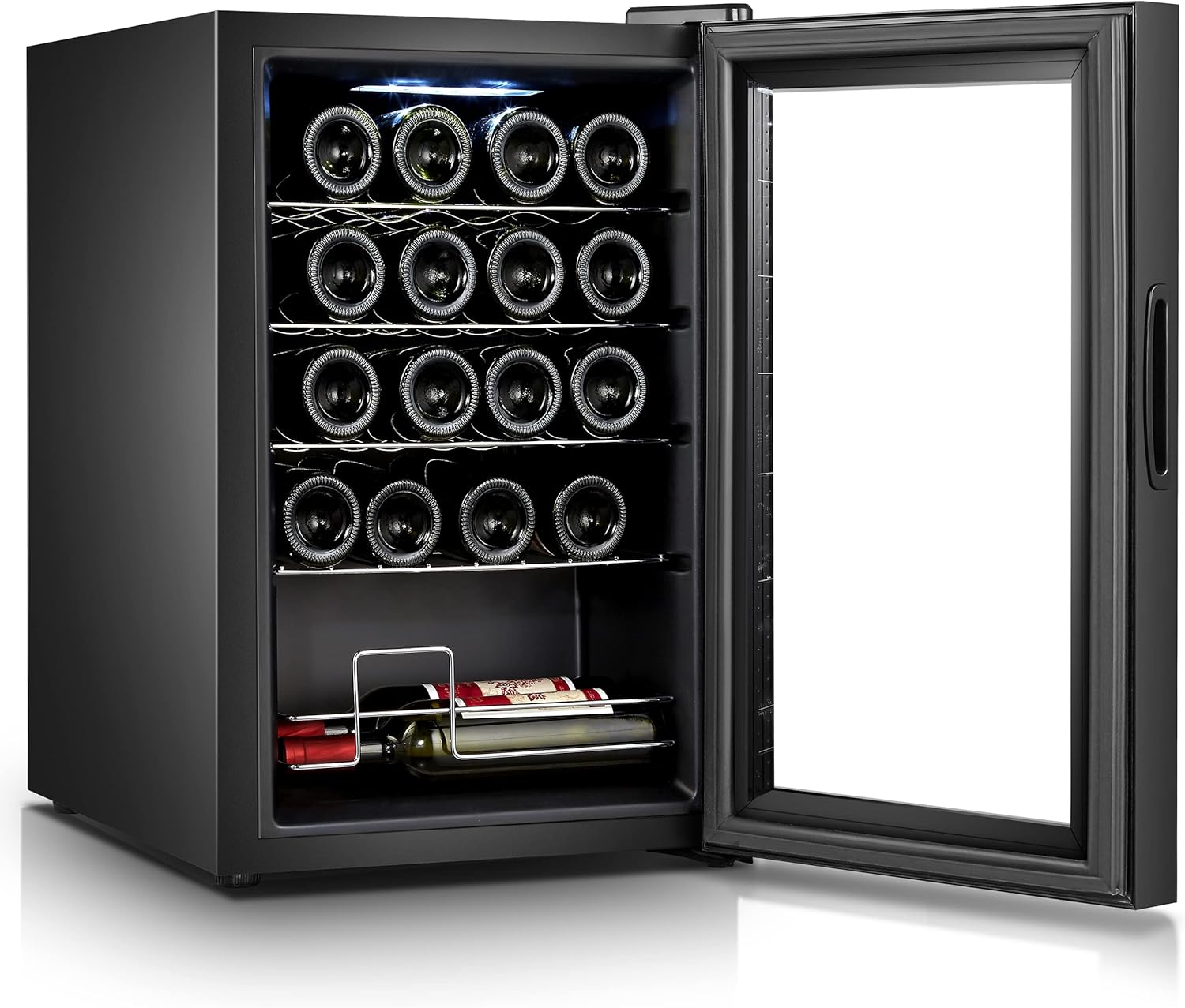 💎 Der hochwertige Weinschrank sticht im schwarzen Design und der zuschaltbaren LED-Blaue Innenraumbeleuchtung besonders hervor und bringt Ihre Rot-und Weißweinsammlung besonders in den Vordergrund. 💪 Platz für 20 Flaschen: Dank des 53 Liter Volumens können bis zu 20 Flaschen deiner Wahl auf 5 Metallablagen gelagert werden. Eine Ablage am Boden des Kühlschrankes, ist für die besondere Präsentation deiner Sammlung optimal geeignet. ☝️ Touch-Temperatureinstellung: Aufgrund des LED-Touch-Displays ist die Bedienung des Weinkühlschranks kinderleicht. Sie haben die Möglichkeit, Ihre individuell von Ihnen bevorzugte Temperatur zwischen 5 bis 18°C durch eine sensible Touch-Bedienung einzustellen. Folglich wird Ihr Rot und Weißwein, Prosecco und Rose nach Ihrem Wunsch optimal gekühlt. 💵 SPARSAMER LUXUS- Verbrauch pro Jahr beträgt nur 142 kWh- Demnach mehr für die Haushaltskasse! Außerdem ist der Weinkühler angenehm leise(42dB) und sorgt für ein unvergessliches Ambiente 🎁Freude beim Verschenken: Überraschen Sie Ihre Liebsten mit unseren Produkten. Wir stehen Ihnen auch dort mit Rat und Tat zur Seite. | قیمت یورویی : 249.99€