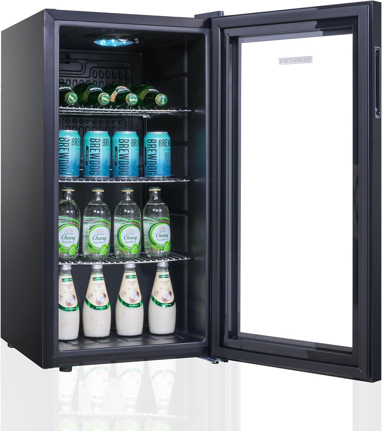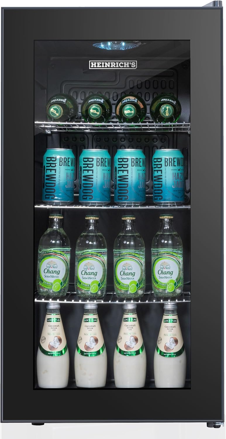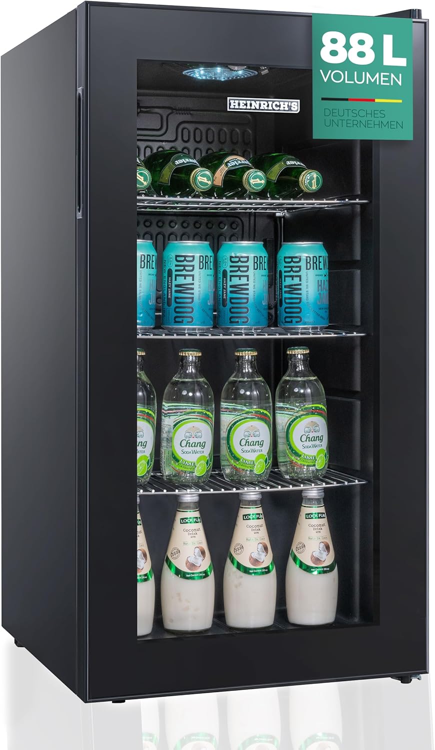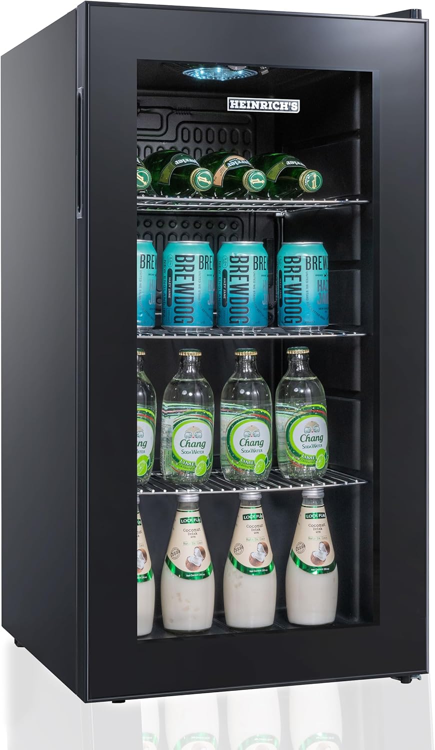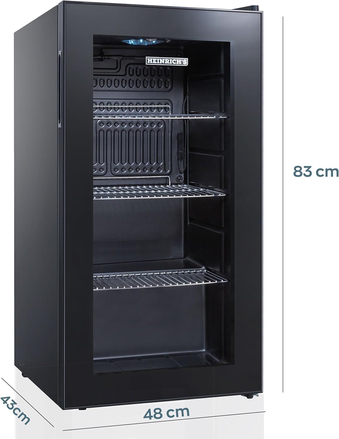 یخچال نوشیدنی هاینریش هاینریشز، یخچال کوچک با درب شیشهای، جمع و جور و بیصدا: ۴۰ دسیبل، روشنایی داخلی LED، مناسب برای دفتر کار، کمپینگ، باغ، دمای ۴ تا ۱۸ درجه سانتیگراد، (۸۸ لیتر/۳ قفسه/۴۰ دسیبل)