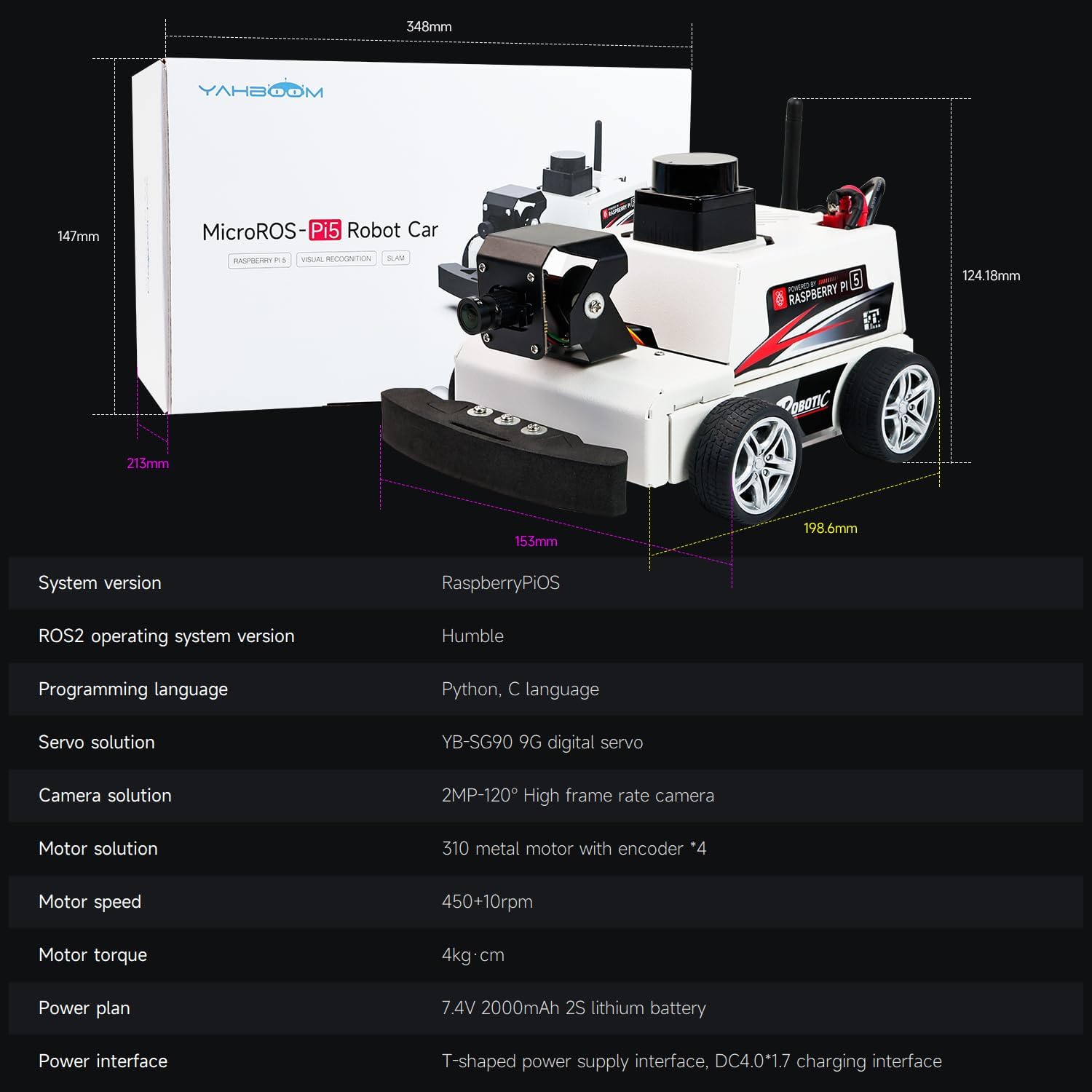 【First Raspberry Pi 5 robot】microROS robot is based on Raspberry Pi 5 development board, supports Raspberry Pi 5 power supply protocol, can provide 5.1V/5A power supply for Raspberry Pi 5, to avoid lag and reboot and other abnormalities, to play the full performance of the Raspberry Pi 5, the image visual processing is more clear. On-board ESP32 coprocessor, built-in Wi-Fi and Bluetooth function, can handle a number of sensor data. Please note: not compatible with raspberry pi 4B. 【Fully compatible with ROS2】 Based on the Humble version of the ros2 system, it is widely used, stable and has many case tutorials; The communication technology of MicroROS is used between the main control and the driver board, the code is open-source, the programming software, one-stop learning. No need to worry about the robot hardware is not compatible, provide adaptive ROS2 exclusive function play. 【MS200 is fully compatible with ROS2】supports indoor and outdoor, supports 360° scanning and detection, and realizes three-dimensional mapping; the MicroROS control board supports WiFi, Bluetooth, serial port and other communication functions, supports power supply for Raspberry Pi 5PD, and can be directly connected to the ROS2 environment for use. Easy to use and efficient; built-in 310 motor, the metal material is wear-resistant and durable and provides precise and stable motion control. 【AI visual gameplay】The 2-degree-of-freedom 2MP HD camera gimbal is utilized for AI visual depth development, remote control through APP or handle,paired with the high performance of Raspberry Pi 5, enabling smooth implementation of face, QR code, and posture recognition, object tracking, line-following autonomous driving, and gesture recognition control. 【What do you get】 You get a programmable robot kit with metal chassis construction, most of the accessories already installed, including expansion boards for on-board ESP co-processing and 6-axis IMU, 310-coded geared motors, 7.4V recyclable battery, Raspberry Pi 5 (depending on the version), Pi5 active radiator, radar, and 2DOF camera. High-performance hardware paired with solid electronics course content, including Yahboom's original hands-on training and theory courses. | قیمت یورویی : 264€