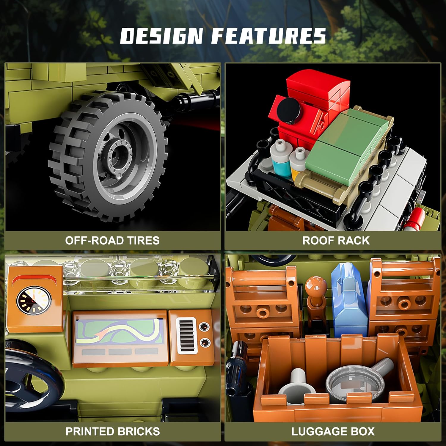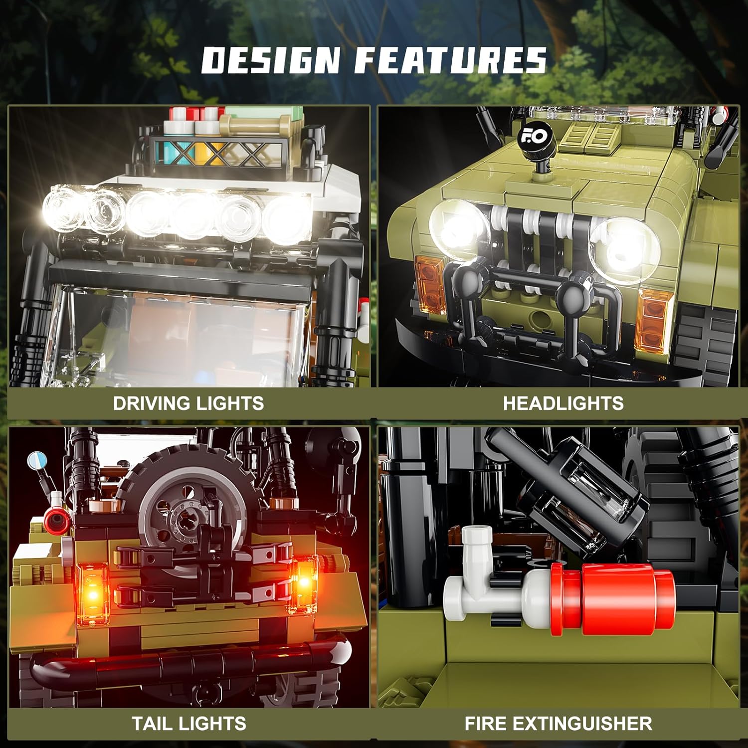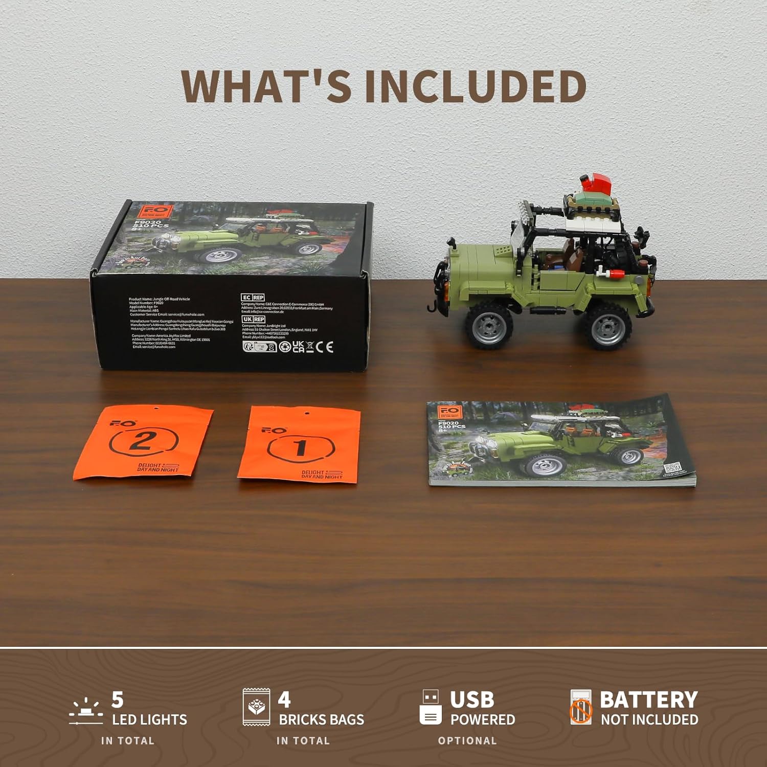 【Premium Lighting Design】Unser Jungle-Camping-SUV, kompatibel mit der Technic Serie, verfügt über exklusive integrierte Beleuchtung (Batterie nicht enthalten). Die leuchtenden Scheinwerfer und Rücklichter schaffen ein immersives Erlebnis und liefern außergewöhnliche fotografische Ergebnisse. 【Authentic Model Features】Zusätzlich zu dem sorgfältig gestalteten Automodell ist der Geländewagen mit Gummireifen, Radaufhängung, abnehmbaren Hauben und Camping-Requisiten ausgestattet, die ein Outdoor-Abenteuer-Gefühl vermitteln. 【Beginner-Friendly STEM Toy】Dieses pädagogische Auto-Spielzeug ist für einfaches Bauen konzipiert und besteht aus 510 Bausteinen. Es enthält eine umfassende Papieranleitung, einen Baustein-Trenner und nummerierte Beutel, die eine mühelose Montage gewährleisten. Geeignet für Kinder ab 8 Jahren! 【Engaging and Interactive】Geeignet für Erwachsene und Kinder bietet unser Jungle-Geländefahrzeug den Spaß am Teambuilding und an der praktischen Spielbarkeit. Kinder werden von den beweglichen Funktionen begeistert sein, darunter die Vorderradlenkung, zu öffnende Türen und Hauben, die stundenlangen Spaß mit diesem FUNWHOLE Auto-Bausatz bieten. 【Kids and Age-friendly】Wir stellen eine detaillierte Papieranleitung und nummerierte Beutel mit Bausteinen zur Verfügung. Eine digitale Version der Anleitung kann ebenfalls heruntergeladen werden. Es ist eine schöne Freizeitbeschäftigung während Geburtstagen und Feiertagen, zusammen mit der Familie ein niedliches Autokit zu bauen. | قیمت یورویی : 43.99€