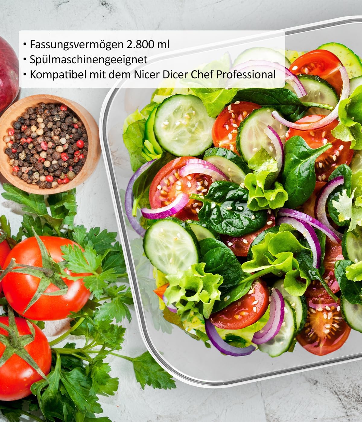 Die Nicer Dicer Chef Professional Glasschüssel im 3-teiligen Set ideal für Sie! Sie bietet mit einem Fassungsvermögen von 2.800 ml ausreichend Platz für Speisen für die ganze Familie. Die Glasschüssel ist backofenfest und somit bestens geeignet für Aufläufe Die im Set enthaltene Silikonmatte können Sie als praktische Unterlage nutzen, wenn Sie Ihren köstlichen Auflauf in der Glasschüssel frisch aus dem Ofen holen und auf dem Esstisch servieren möchten Der Frischhaltedeckel verschließt luftdicht und auslaufsicher! | قیمت یورویی : 49.95€
