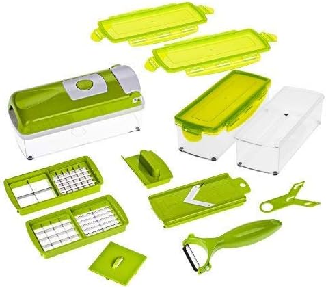Genius Nicer Dicer Smart | 13 Teile | Gemüseschneider | Zwiebelschneider | Schneiden / Würfeln / Hobeln / Stifteln / Schälen / Aufbewahren | Mandoline | Multischneider | Gemüsehobel | Obstschneider | NEU, 22.2 x 10 x 8.1999999999999993 cm لینک آمازون : https://www.amazon.de/dp/B01HRLY8U2?th=1&psc=1 با فشار دادن دکمه "فشار"، صفحه تمیز کننده شفاف یکپارچه به طور خودکار به پایین فشار داده می شود و شبکه پین را حتی از کوچکترین باقی مانده های مواد غذایی پاک می کند. تیغه های بسیار تیز ساخته شده از فولاد ضد زنگ با کیفیت G-NOX با 2 سطح مختلف برش برای برش همزمان مواد غذایی مختلف تنوع برش های متعدد: مکعب ها و چوب های متوسط و بزرگ، برش های نازک و ضخیم، نوارها و ربع های ضخیم ظرف جمع آوری با درب نگهداری تازه برای برش مستقیم، ذخیره سازی با صرفه جویی در فضا (قابل انباشته)، تازه نگه داشتن و حمل و نقل پایه های ضد لغزش کار ایمن را تضمین می کند