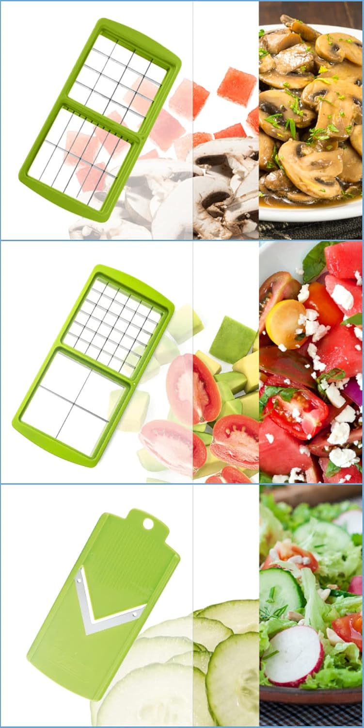 Durch Betätigung des Buttons „Push“ wird die integrierte transparente Reinigungsplatte automatisch nach unten gedrückt und reinigt das Stifteraster selbst von kleinsten Essensresten Extrem scharfe Messereinsätze aus Edelstahl in G-NOX-Qualität mit 2 unterschiedlichen Schneidflächen für gleichzeitiges Schneiden unterschiedlicher Lebensmittel Zahlreiche Schneid-Variationen: mittlere und große Würfel und Stifte, dünne und dicke Scheiben, dicke Streifen und Viertel Auffangbehälter mit Frischhaltedeckel für direktes Hineinschneiden, platzsparendes Aufbewahren (stapelbar), Frischhalten und Transportieren Rutschhemmende Standfüsschen gewährleisten eine sichere Arbeitsweise | قیمت یورویی : 34.85€