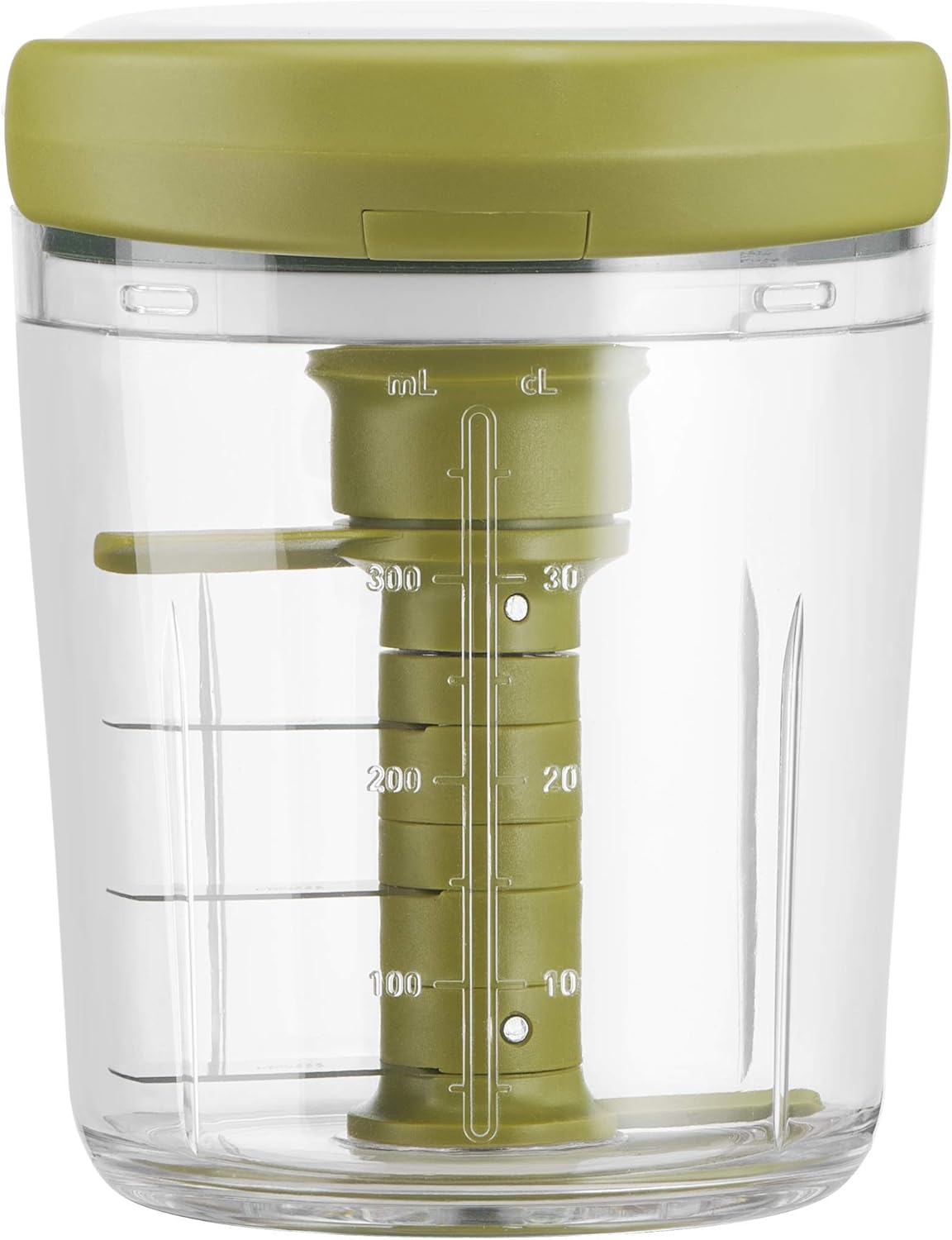 SCHNELL & EINFACH: Einmal am Griff ziehen ... und schon wird das Klingensystem beschleunigt. Weiter ziehen, um die Zutaten noch schneller zu zerkleinern. Geben Sie Ihre flüssigen Zutaten hinzu. Schliessen Sie den Deckel und ziehen sie an der Kordel oder schütteln Sie den Behälter VIELSEITIGER MANUELLER ZERKLEINERER: Ideal für eine Vielzahl von frischen Lebensmittelzubereitungen, von gehackten Zwiebeln, Kräutern und Nüssen bis hin zu perfekt gemischten Salsas, Pestos, Dressings, Dips, Marinaden und Saucen SICHER: Der auslaufsichere Deckel bleibt dank seines Verriegelungssystems fest verschlossen, während der rutschfeste Boden das vielseitige Gerät stabil an seinem Platz hält EINFACHE REINIGUNG: Behälter und Klingen sind spülmaschinenfest und somit besonders pflegeleicht PATENTIERT: Drei patentierte unabhängige Rotormesser mit Mischarmen sorgen für ein effizientes Zerkleinern und Verrühren GARANTIE: Der robuste Chop & Shaker Mechanismus hat eine Garantie von zwei Jahren ENERGIESPAREND: Der Zerkleinerer wird von Hand betrieben, ein Stromanschluss ist nicht erforderlich KOMPAKTES DESIGN: 450 ml Fassungsvermögen, geeignet zum Zerkleinern einer großen Zwiebel, und praktisches Design für eine tägliche Nutzung | قیمت یورویی : 28.91€