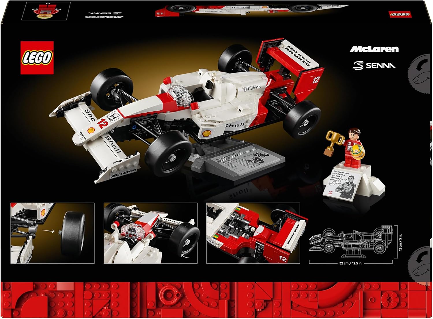 Sammlermodell eines LEGO Rennwagens für Erwachsene: LEGO Icons McLaren MP4/4 & Ayrton Senna ist ein Bauprojekt für Motorsportfans und Liebhaber legendärer Autos Inhalt der Box: Dieses Bauset beinhaltet alles, was du brauchst, um eine maßstabsgetreue Nachbildung des McLaren MP4/4 zu bauen, sowie Ständer für den Rennwagen und die Minifigur Ayrton Senna Details und Funktionen: Diese LEGO Icons Nachbildung verfügt über eine funktionierende Lenkung, eine Schubstreben-Aufhängung, einen verstellbaren Heckflügel, Slicks, Außenspiegel, eine Gangschaltung und einen detailgetreuen V6-Turbomotor Heimdekoration für den Schreibtisch: Auf dem Ständer für den McLaren MP4/4 sind Statistiken des Fahrzeugs aufgedruckt. Der Ständer für die Minifigur ist einem Siegerpodest nachempfunden und trägt ein Foto und ein berühmtes Zitat von Ayrton Senna Geschenk für Autoliebhaber: LEGO Icons McLaren MP4/4 & Ayrton Senna ist ein tolles Bauset und ein faszinierendes Geburtstagsgeschenk für einen Mann, eine Frau, und alle Fans, die klassische Autos und Bausätze lieben Inklusive digitaler Bauanleitung: Die LEGO Builder App beinhaltet eine digitale Version der Bauanleitung zu diesem LEGO Icons Bauset Kreatives Hobby für Erwachsene: Dieses LEGO Icons Bauset gehört zu einer ganzen Reihe von anspruchsvolleren LEGO Sets für Erwachsene | قیمت یورویی : 57.99€