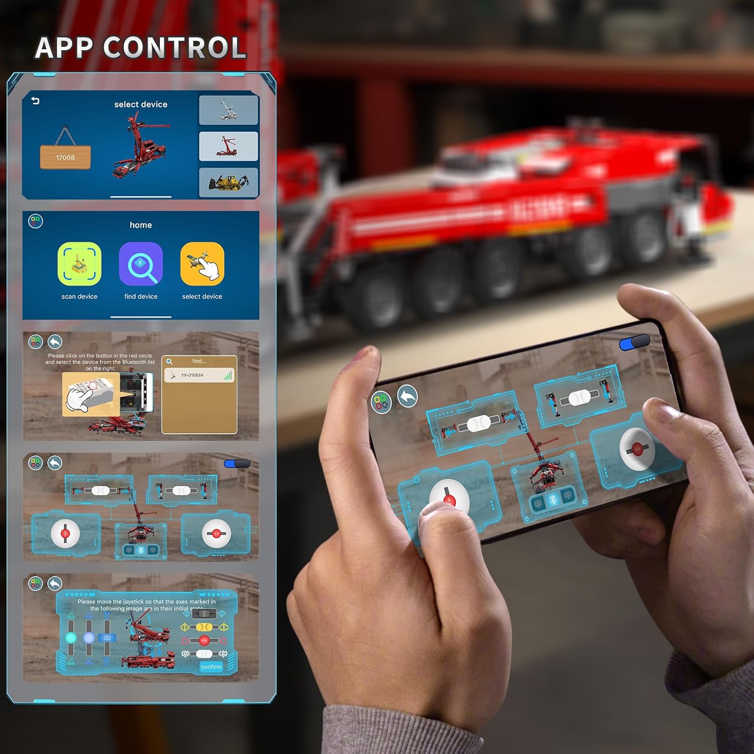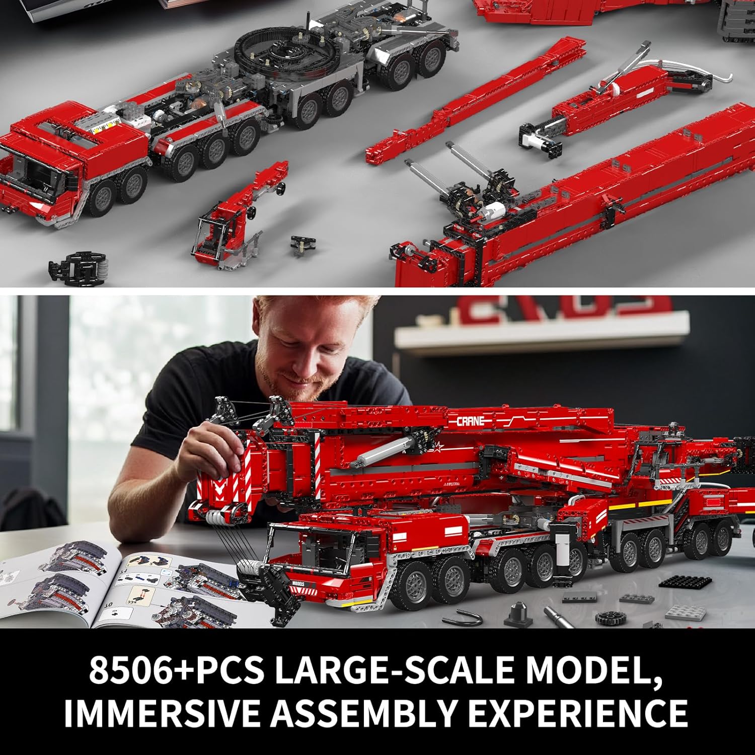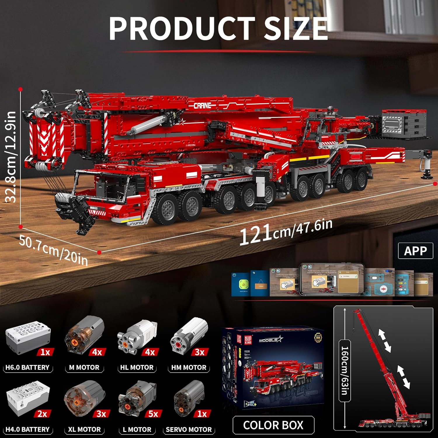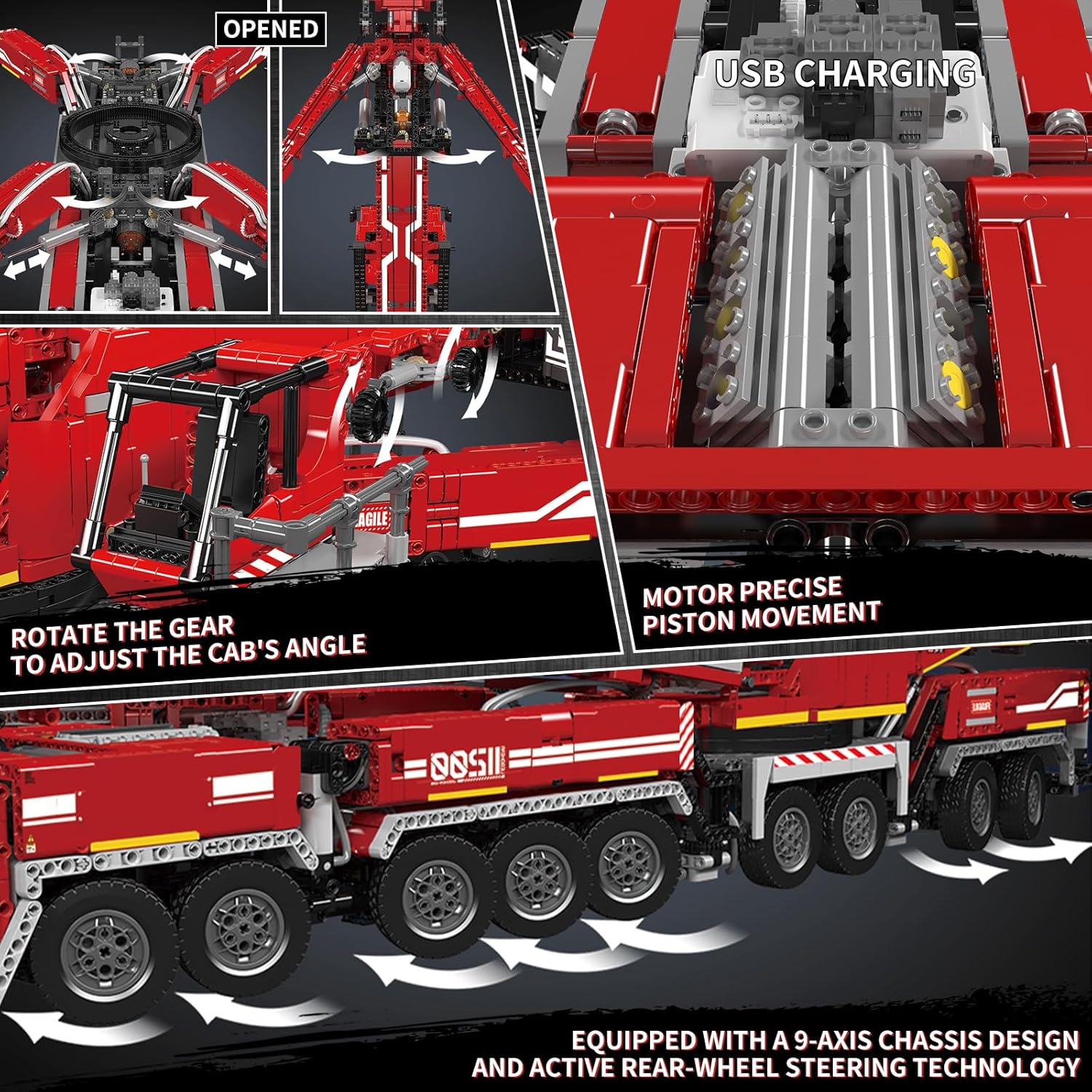 Der größte Kran in der Mould King Technik-Serie kombiniert enorme Hubkraft mit einer ausfahrbaren langen Auslegerstruktur. Ausgestattet mit einem aktiven Hinterachs-Knicksystem, Y-förmigen Seilen und einem flexiblen Gittermast bietet er herausragende Hebeleistung. Der dreistufige Ausleger ist ausziehbar, und die Kombination aus Haupt- und Seitenausleger erreicht eine maximale Höhe von 160 cm, wobei die Hubhöhe präzise gesteuert werden kann. Der Flaggschiff-Schwerlastkran von Mould King ist ausgestattet mit 20 Motoren, 3 Lithiumbatterien, pneumatischen Komponenten, Kohlefaserteilen und 12 Gewichtsausgleichern. Maße: 12150,732,8 cm. Der Hauptarm kann vollständig auf eine Länge von 160 cm ausgezogen werden. Mit drehbarem Zahnrad, einstellbarem Kabinenöffnungswinkel, paralleler Verbindung von L-Motor und Servomotor zur Steuerung der pneumatischen Aufblasfunktion, wodurch die pneumatischen Stützbeine auf Knopfdruck frei ausgefahren werden können. Mould King 17008 Mobilkran kombiniert ein 9-Achs-Chassis-Design mit einer aktiven Hinterachsabweichungstechnologie, die eine flexible Lenkung der Hinterräder ermöglicht und den minimalen Wendekreis erheblich verkleinert. Die obere Struktur kann um 360° gedreht werden, die Stützbeine können geöffnet werden, und das Y-förmige Seilsystem ermöglicht eine präzise Steuerung des Auslegers und seiner Neigung. Dieses Set ist das beste Spielzeuggeschenk für Jungen und Mädchen zu Valentinstag, Geburtstag oder Vatertag, besonders geeignet für Kinder, Jugendliche und Erwachsene ab 8, 9, 10, 12, 14 Jahren und älter. Es ist konsistent, kompatibel, leicht zu verbinden und fällt nicht leicht auseinander. Es bietet alle gewünschten Funktionen zu einem erschwinglichen Preis und ist die erste Wahl für Geburtstage, Kindertag, Weihnachten oder Ostern. Jedes unserer Produkte wird maschinell konfiguriert und vor der Verpackung drei Mal getestet. Wenn Teile in Ihrem Set fehlen oder es irgendwelche Betriebsprobleme gibt, kontaktieren Sie uns bitte. Vielen Dank. | قیمت یورویی : 439.19€