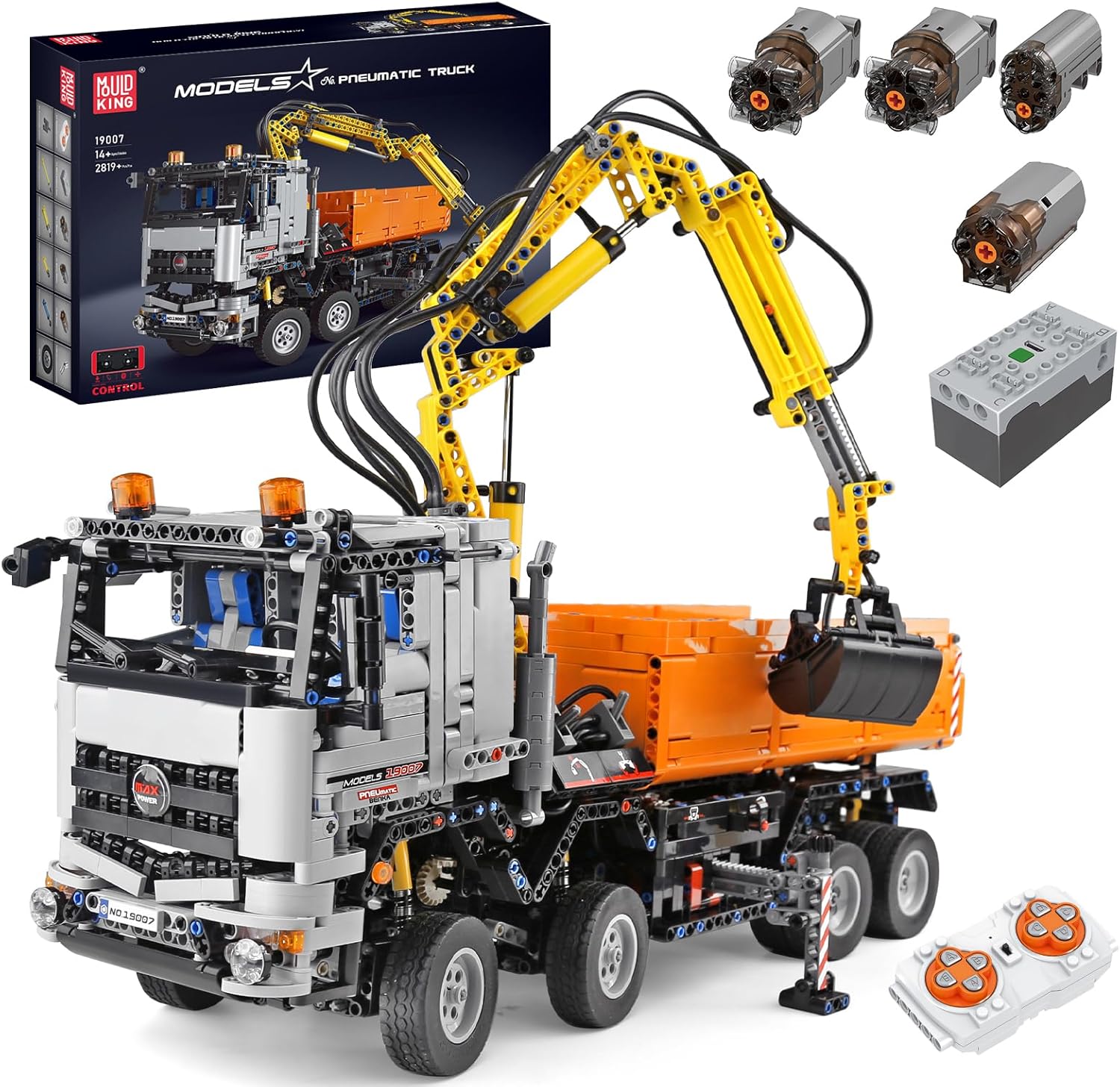 Mould King 19007 Technik Pneumatischer LKW Bausteine Modell, 2970 Teile Fernbedienung Pneumatic Truck Bauset, Klemmbausteine Kran Spielzeug Bausatz mit Fernbedienung und App Doppelsteuerung | قیمت یورویی 143.99€