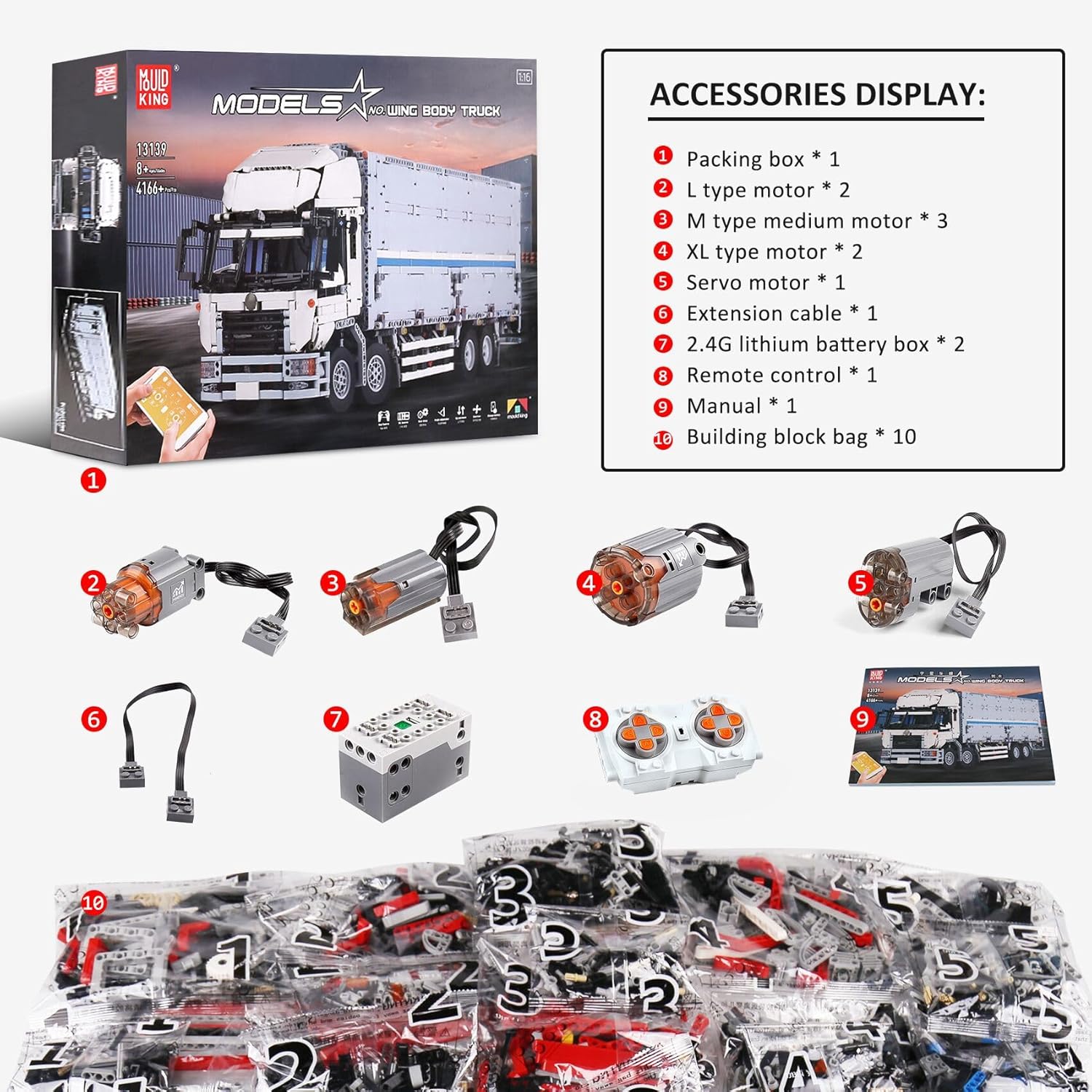 Mould King 13139 Technischer Kranwagen-Kit: Länge, Breite und Höhe: 72 * 16,5 * 20 cm, 4166 Teile und Kraftfunktionsgruppe. Die zu öffnende Ladetür und die ein- und hochfahrbare Ladebordwand machen es zu einem Technikbaustein mit guter Bespielbarkeit.die Teile sind mit allen Markenkomponenten kompatibel und lassen sich mit anderen Markenprodukten zu einer großen Szenerie kombinieren. 【Madoca1977-Design】er mobile Wing Booy Truck Der Baustein-LKW ist kompatibel mit 2.4G und App Dual Control System, stabil und störungsfrei, Leistungssteigerung, einschließlich XL-Großmotor * 2, M-Mittelmotor * 3, L-Motor * 2, Servomotor * 1, Bluetooth Lithiumbatterie * 2, Motorverlängerungskabel * 7, 2,4-GHz-Fernbedienung * 1. Verwenden Sie die 2.4G-Fernbedienung oder eine Bluetooth-Anwendung, um viele interessante realistische Funktionen zu steuern. [Langlebig und gut gestaltet] Alle 4166-Komponenten sind aus hochwertigem ABS-Kunststoff gefertigt, konsistent, kompatibel, einfach anzuschließen und nicht leicht zu verteilen. Dazu modernes Design und Motorschwankung sowie detailreiche Deko-Aufkleber; tolle Geschenke zum Kindergeburtstag/Kindertag/Weihnachten/Neujahr/Chanukka/Ostern/Sommercamp/Schulanfang. [Kreativität und MINT-Lernen] DIY-Blöcke wurden entwickelt, um Kindern interessante und herausfordernde Bausteinerfahrungen zu bieten und verfügen über realistische Bewegungen und Mechanismen, die dazu beitragen, die Vorstellungskraft und Kreativität der Kinder, die Hand-Augen-Koordination und das Selbstvertrauen zu fördern ; es ist auch ein ideales Spielzeug für Jungen und Mädchen ab 8 Jahren, das sie zum Erlernen von Maschinen und Technik anregen kann. [Exquisites Indoor-Modell] Der Wing-Body-Schwerlast-Lkw mit Fahrgestell bringt Sie realen Bausteinen näher als je zuvor. Dieser exquisite Technik-Modellbausatz wurde speziell für Technikbegeisterte entwickelt, die auf Details achten. | قیمت یورویی : 229€