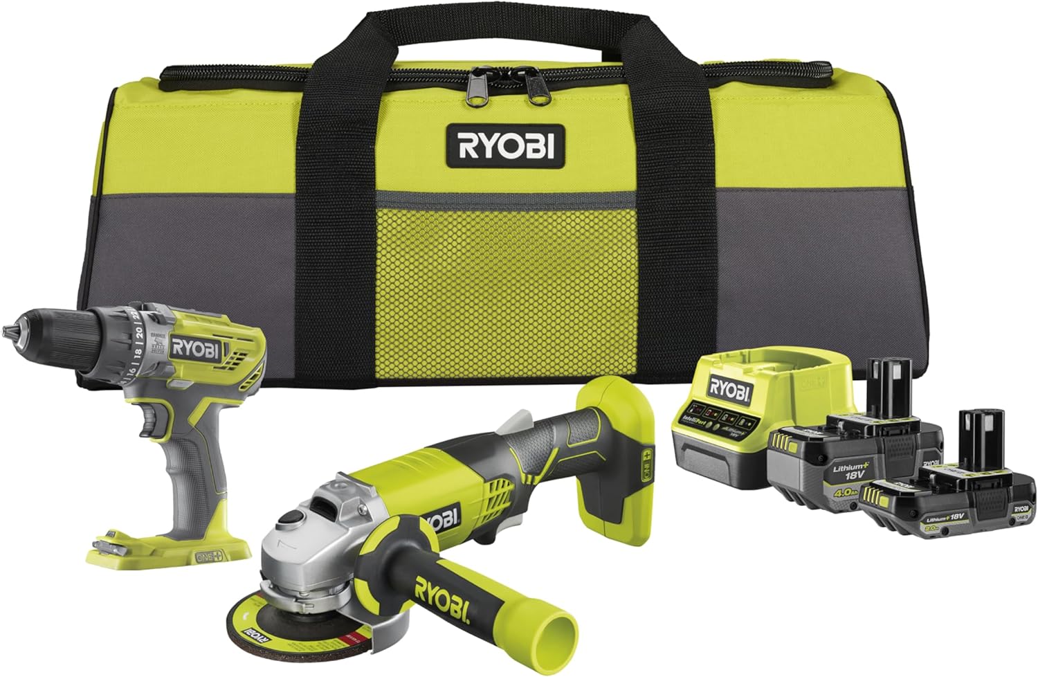 RYOBI 18 V ONE+ 6-tlg. Akku-Combo-Kit RCK182O-242SZL, Schlagbohrschrauber, Winkelschleifer, 2x Akkus (4,0Ah & 2,0Ah), Ladegerät, Werkzeugtasche | قیمت یورویی 243.11€