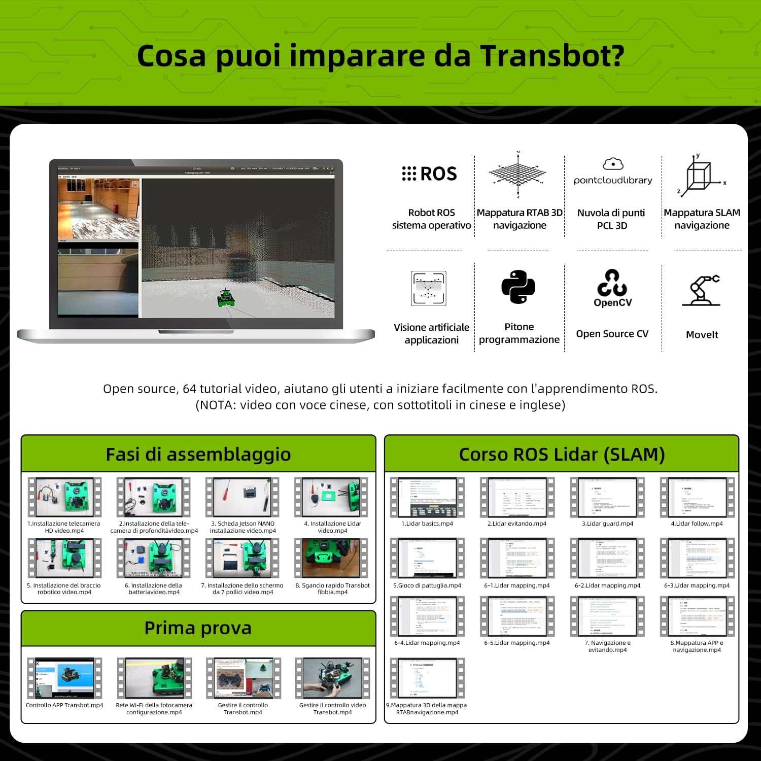 Basierend auf programmierbarem, intelligentem ROS-Roboter-Set: Transbot verwendet Rviz, TF, Qt, Navigation und andere Werkzeuge, kombiniert mit Lidar und Kameras mit hoher Bildrate, um 2D-Mapping-Navigation, Wegplanung und andere Funktionen zu realisieren. ROS von Grund auf lernen und ROS-Roboterauto bauen. Hinweis: Überprüfen Sie die von Ihnen bestellte Version sorgfältig) Lidar Scanning 2D Mapping Navigation: Das Crawler-Roboter-Set ist mit Silan A1 Lidar ausgestattet, das 2D-Plan-Scannen und Kartierungen im Innenbereich, Einzelpunkt- und Mehrpunkt-Navigation abschließen kann und Hindernisvermeidung und -folge realisiert. (★Hinweis: ROS Robot APP unterstützt iOS nicht, Sie können die Kartennavigation auf dem PC erstellen) KI-Funktionskombination: Der Roboter integriert eine Fülle von KI-Funktionen, wie Fixpunkt-Navigation, automatisches Fahren, Farberkennung und -verfolgung, AR-Tag-Erkennung und Realitätsverbesserung, visuelle Bildverschönerung, Gesichtserkennung, Lidar-Mapping-Navigation und Hindernisvermeidung. Sie erhalten den von Yahboom bereitgestellten Open-Source-Code, um mehr Möglichkeiten zu realisieren. Plattformübergreifende Verbindungssteuerung: Der Roboter kann auf 4 Arten programmiert oder gesteuert werden. ① Mobile Fernbedienungs-App integriert mit einer Vielzahl von KI-Funktionen, ② Griffsteuerung, die die FPV-Echtzeit-visuelle Effekte erleben kann, ③ JupyterLab Online-Programmierung und ④ professionelle Roboter-Betriebssystemsteuerung, eine Vielzahl von Steuerungsmethoden für verschiedene Anlässe, tiefgreifende Erfahrung des Spaßes an der Steuerung von Robotern (★Hinweis: App unterstützt iOS und Android, ROS-Roboter-App nur für Android) Professionelle Hardware und Kurse: Transbot verfügt über einen hochausgestatteten Rahmen aus Aluminiumlegierung, ein Anti-Stau-Lager, einen SLAM-Lidar, einen Codierungsgetriebemotor, ein Metall-Servo, eine professionelle Yaboom Roboter-Erweiterungsplatine, HD-Kamera mit elektrischer drehbarer Schwenkneigung (optional), wodurch der Roboter eine starke Fähigkeit hat, Hindernisse zu überqueren. Andere, Yahboom bietet 64 Video-Tutorials und detaillierte Dokumentation. Solange Sie ROS lieben, ist es ein Roboter, der nicht fehlen darf und ein professionelles Geschenk, von dem Macher und Programmierer träumen. 【Versionsunterschied】Transbot hat insgesamt 25 Versionen, I bis V unterscheiden zwischen High-Definition-Kamera oder Tiefenkamera, ob es einen Roboterarm enthält, ob es einen 7-Zoll-Bildschirm enthält; Darüber hinaus ist die Transbot-Hauptsteuerplatine in Jetson Nano oder Raspberry Pi unterteilt, und der Raspberry Pi ist in 4B 4G oder 4B 8G unterteilt, bitte überprüfen Sie die Version, die Sie benötigen, sorgfältig | قیمت یورویی : 659€