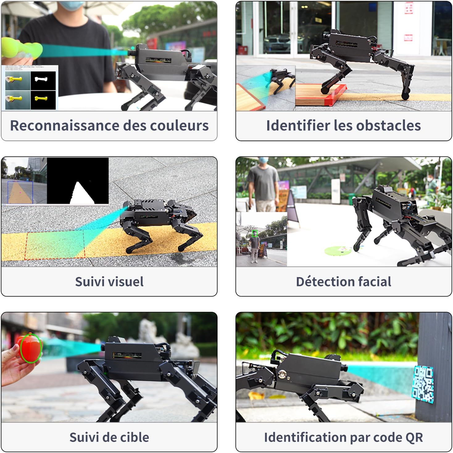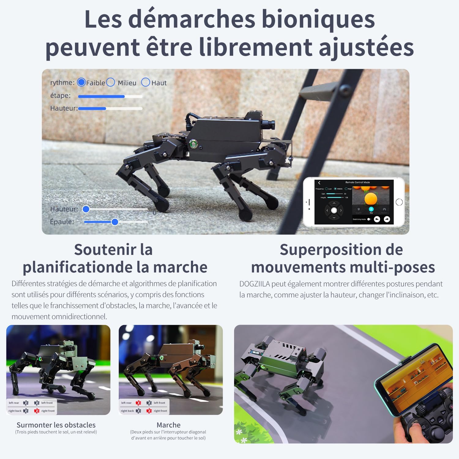 【AI Accompanying Technology Dog】DOGZILLA uses Raspberry Pi as the main controller and STM32 as the co-processor to drive the steering gear. It is equipped with a camera module and is developed based on OpenCV to realize künstliche Intelligence functions such as face recognition, target tracking, QR code and color recognition. If you dig deeper, you can even discard the Raspberry Pi and replace it with other development boards that support serial communication to achieve more exploration. 【Quadruped 12-DOF High-level Bionic】Each leg of the roboter dog is controlled by 3 bus servos, which can be compared to 3 joints of the elbow, shoulder and hip joint to accurately restore the action details. The 12 movable joints are based on inverse kinematics, enabling them to move forward, backward, left and right, and support omnidirectional motion and motion superposition in multiple directions, enabling six-dimensional attitude control, stabile haltung, various movement gait. 【Pre-Assembled Electronic Kit】Nach der Installation des Raspberry Pi aus der Box können Benutzer die Fernbedienung verwenden, um diesen vormontierten Roboter mit eingebauten Aktionen zu spielen. With its one button design and exclusive app, you can easily interact with DOGZILLA instantly interactive. Roboter hat eine solide Struktur, Metallaluminum-Legierung, 12 hochpräzise Lenkräder für Gelenke, viereckiges ABS Wear-resistant feet and silicone foot rods, it will be a qualified quadruped roboter dog you dream of. 【Born for programming and maker education】 Yahboom roboter dag is developed for young people to learn roboter programming, support computer to program roboter dogs in python, and develop AI applications. Entwickelt für Bildung, Forschung, Algorithmus Validation und Unterhaltung. Mit unterschiedlichen Programmierungen, kann es mehr Funktionen als Sie imagine machen. Unbegrenzte Programmierungsmöglichkeiten helfen Ihnen, zu erkunden, zu lernen und Spaß zu haben. 【Trainingsmethode】If this is a pet roboter dog, you can use the wireless handle to instruct it to run or sit down, or you can use the APP to see what the roboter dog sees, get the dog's first perspective. Check if the lights in the next room are off? Or change the existing program through the computer and add more personal customized functions. Control it according to your needs, this is an obedient mechanical dog. | قیمت یورویی : 869.99€