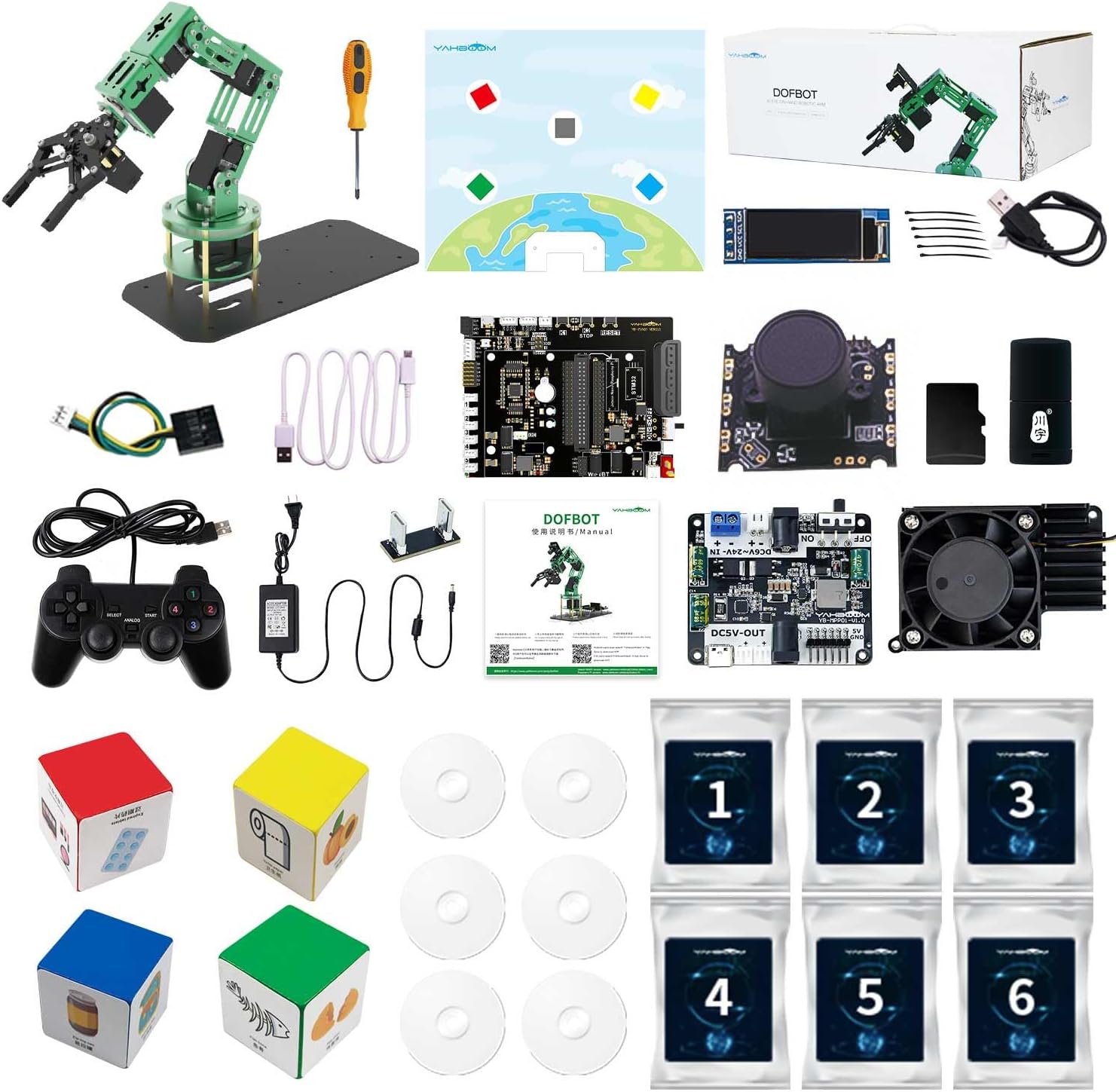 【Artificial Intelligence Robotic Arm with Camera】Robotic arm comes with camera to achieve FPV video transmission. The robotic arm can recognize colors, specific gestures and faces, respond to the recognized gestures and track the recognized faces, track the corresponding colors, and grab the corresponding designated color objects. These recognition, tracking and grabbing actions fully reflect the AI bionic characteristics of robot arm. DOFBOT starts to take you into the field of AI robotics. 【DOFBOT Motion Control】 Robotic arm not only has its own fixed action group, but also can perform custom actions. In terms of control method, we can use the Master Machine to control the Slave Machine to achieve remote operation of real-time transmission of action gestures. What’s more,the ros system can be used to build obstacle models, so that the robotic arm can avoid opening the obstacles to operate. Flexible arms can complete complex tasks for you 【Freely enjoy 5 control methods】 The programmable robot arm kit can use the multi-function APP (Android/iOS) to operate most of the functions; the kit is equipped with a USB gamepad remote control to achieve the best control feeling; it can also be used PC upper computer view image transmission; 3D simulation model construction of ROS system; Jupyter Lab webpage online programming. 5 kinds of interconnected control methods can enjoy the fun of robotic arm 【Top Configuration】Dofbot uses 15kg smart serial bus metal gear digital servo, which is conducive to separately controlling and reading the angle of each steering gear; equipped with a fully functional expansion board, reserved for continued expansion; the robotic arm is made of fully anodized aluminum alloy with a beautiful and strong structure 【Easy to Get Start & Online Technical Support】The assembled robotic arm can be controlled directly by simply installation and quick connection to the network (Based on the factory burned image). However, this robotic arm is for DIY makers with basic Python programming knowledge. Yahboom provide a large amount of course materials and online technical support is available. If you encounter difficulties, pls contact Yahboom. ***Raspberry Pi 4B (4G or 8G) is recommended | قیمت یورویی : 287.99€