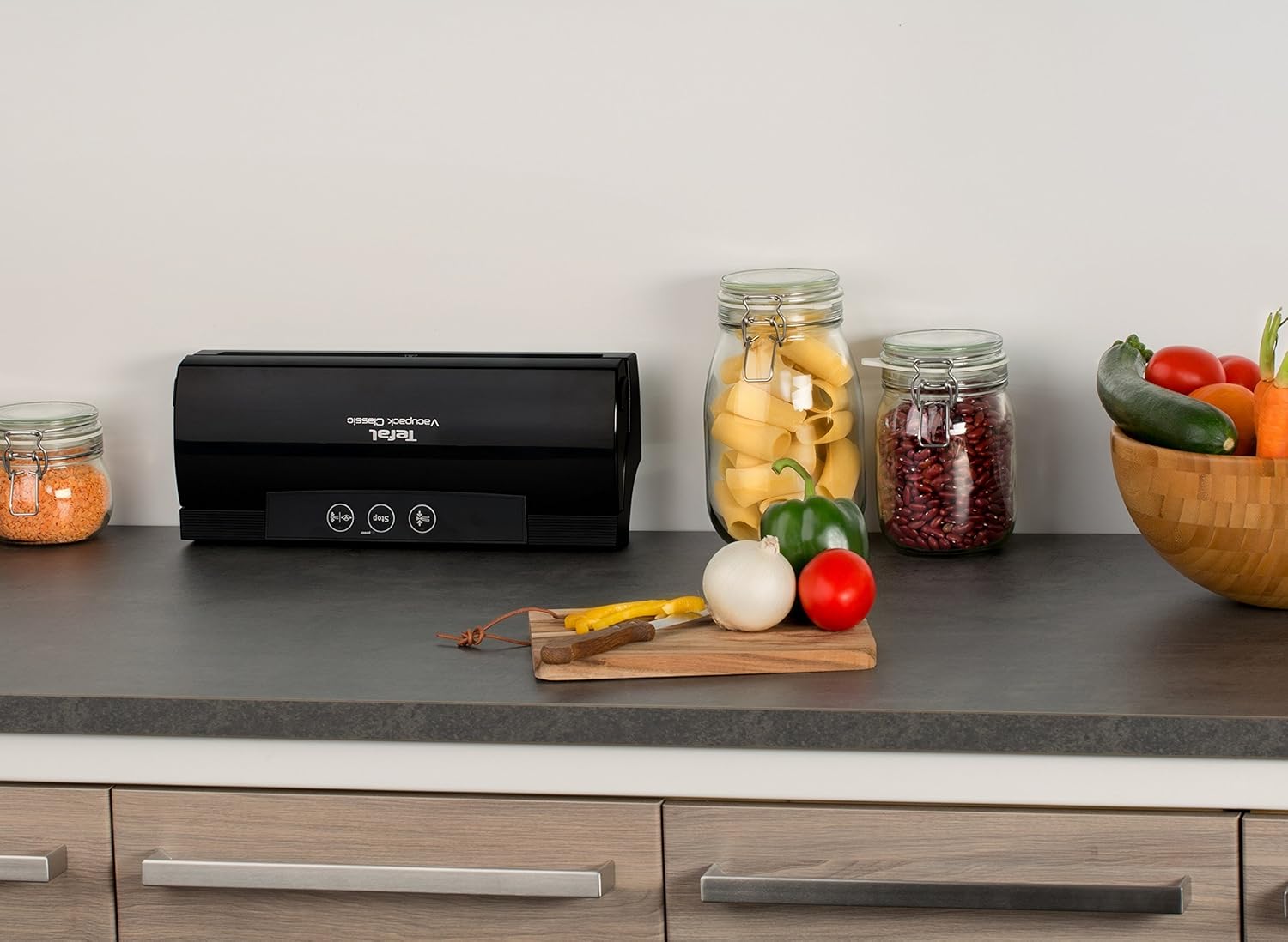TEFAL - Selador de Sacos VT254070, 110 W, Schwarz لینک آمازون : https://www.amazon.de/dp/B074WC3XW2?th=1&psc=1 دستگاه بسته بندی با کارایی بالا در طراحی مدرن با روکش فولاد ضد زنگ 4 عملکرد: خلاء و مهر و موم تنها به صورت دستی. عملکرد مرطوب یا خشک سرعت مکش را بسته به نوع غذا و عملکرد توقف تنظیم می کند که فرآیند بسته بندی را متوقف می کند شما می توانید اندازه کیسه را با استفاده از رول و تیغه بسته بندی یکپارچه انتخاب کنید، این کیسه برای همه مناسب است و با غذاهای خشک و مرطوب کار می کند. به لطف محفظه کابل در پشت برای موقعیت عمودی هنگام ذخیره سازی، به راحتی ذخیره می شود شامل 10 کیسه در ابعاد 22 در 30 سانتی متر و هشت کیسه به ابعاد 28 در 35 سانتی متر با کیسه های XA256010 و XA254010 کار می کند اندازه محصول: 37.6 x 20.2 x 10.4 سانتی متر