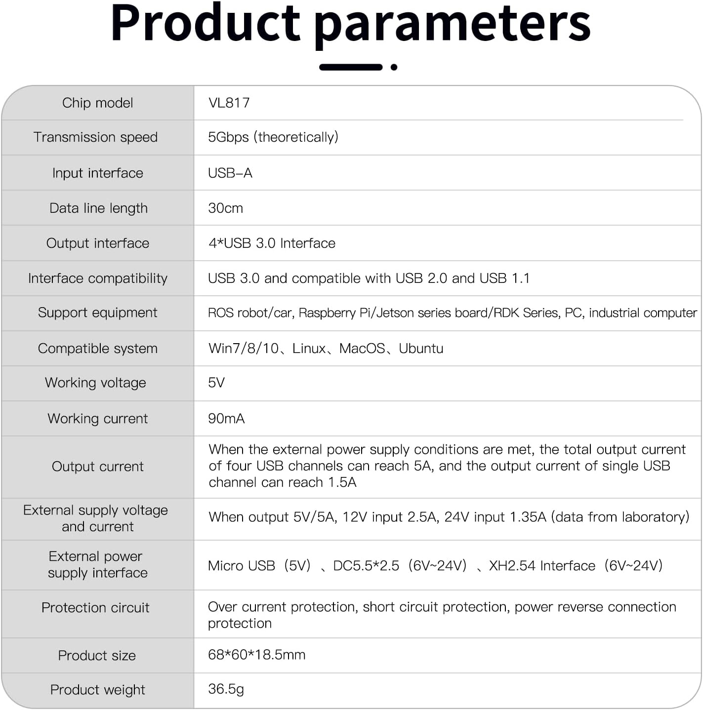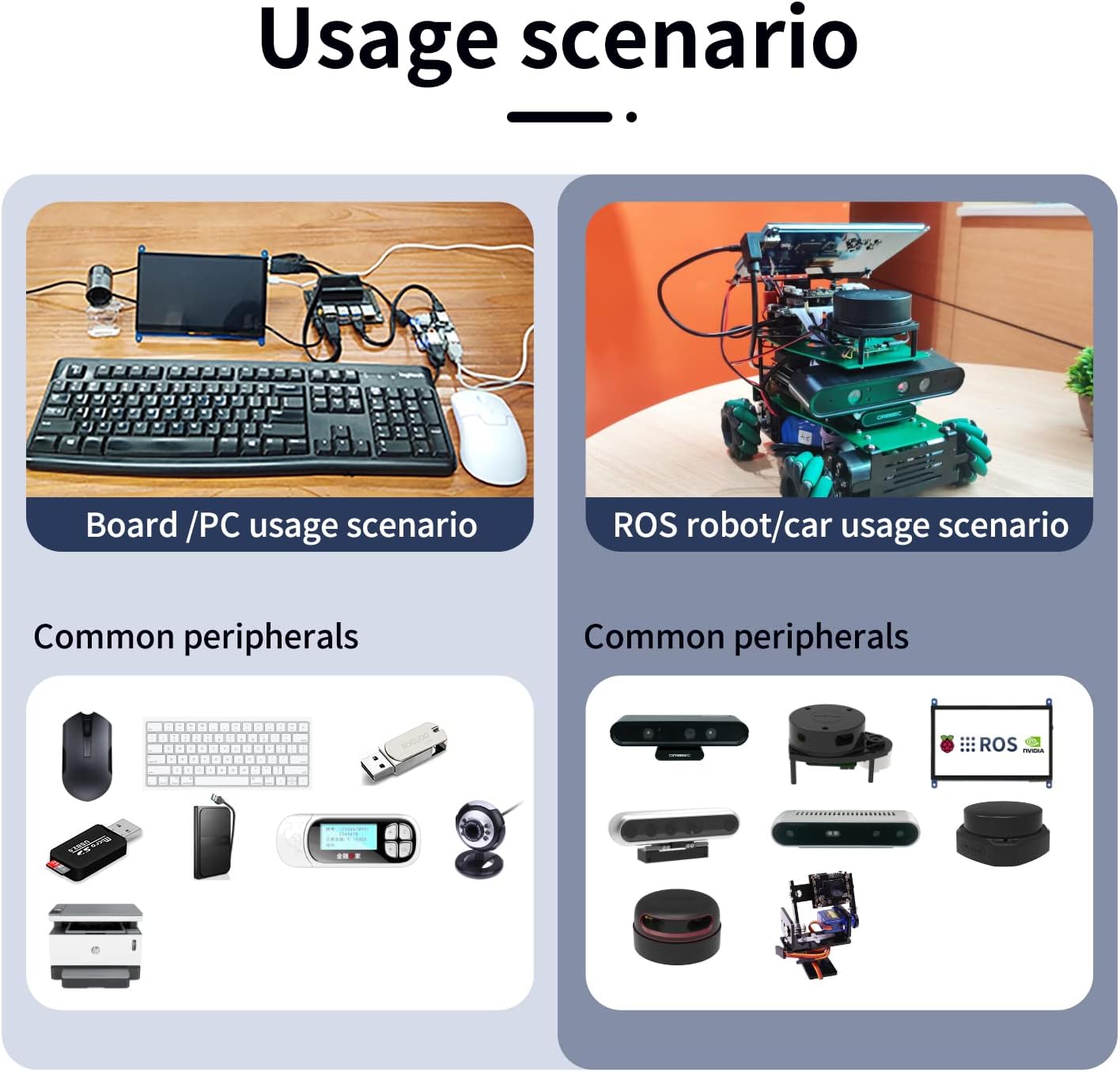 VL817 main control chip - USB3.0 HUB expansion board is designed to solve the problem of insufficient USB interfaces and insufficient power supply on the motherboard due to the increase in USB peripheral devices. Equipped with VL817 main control chip, the main control board has stable performance and stable transmission. The USB3.0 communication interface and HUB chip are used to expand 4 USB interfaces to ensure high-speed data transmission of the interface. The 4 USB interfaces can be expanded at the same time to double the efficiency. When used as a motherboard/host USB docking station, external devices such as keyboards, standard cameras, and U disks can be connected at the same time. When used as a robot/car extension, it can be connected to external devices such as lidar, Bluetooth receiver, and depth camera at the same time. Each USB device has its own indicator light. Supports wide-voltage external power supply. In addition to USB-A standard data interface power supply, it also supports 5V (micro-USB), 6~24V (DC interface/XH2.54 socket) wide-voltage external power supply, ensuring high-power peripherals, multiple The power supply and transmission are stable under high power consumption conditions when the devices are used simultaneously, and each USB3.0 interface can output sufficient current. The new upgrade supports Raspberry Pi 5 and is compatible with ROS robots/cars, Raspberry Pi5/4b/Jetson series developer kits, Horizon, PCs, industrial computers, etc. Compatible with win7/8/10, Linux, Ubuntu, and MacOS systems. No driver files required, just plug and play. If you need to restart a USB device, you can power the device off and on again without damaging the interface. The size supports Raspberry Pi/Horizon stack installation, and supports the installation of Raspberry Pi 5/4B/3B+/3B. Kit includes exclusive copper post screw accessories and data cable for Jetson Nano and Raspberry Pi. Material quality is reliable and technical assistance is provided. | قیمت یورویی : 29.99€