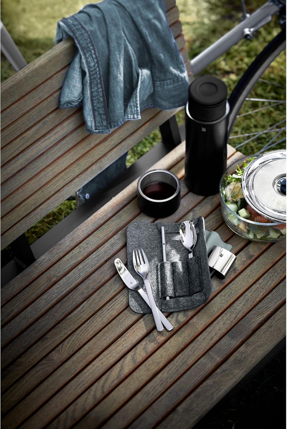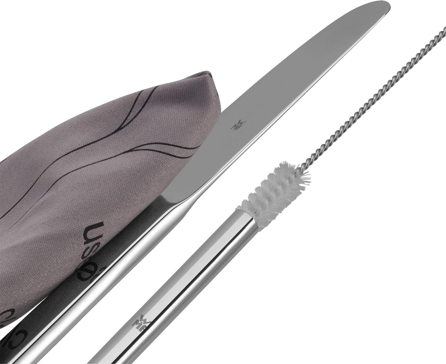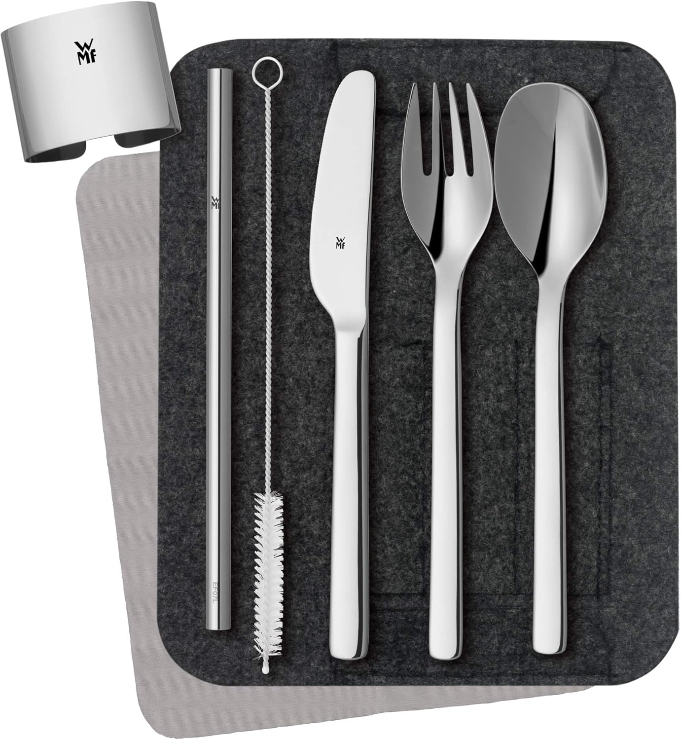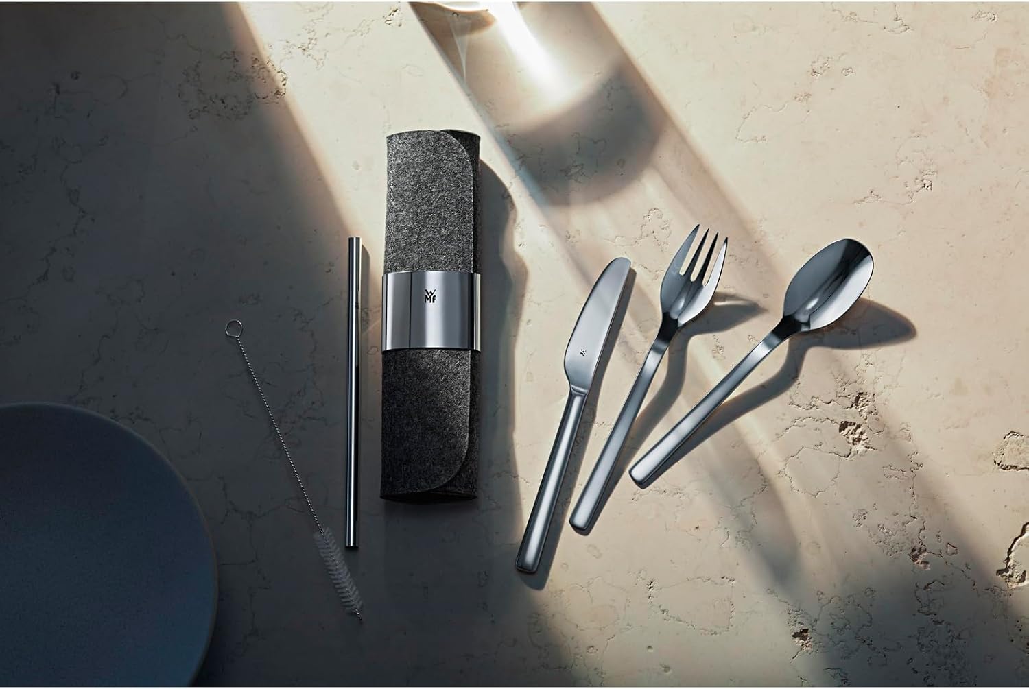 WMF my2Go، استیل ضد زنگ، سرویس کارد و چنگال 8 تکه، سرویس کارد و چنگال مسافرتی فضای باز برای 1 نفر، کارد و چنگال کمپینگ با کیف، کارد و چنگال کوهنوردی سازگار با محیط زیست، نی، برس تمیز کننده، کارد و چنگال My2Go تک نفره هدیه کمپینگ