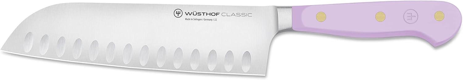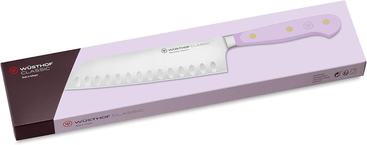 WÜSTHOF SANTOKU MESSER – Die scharfe Klinge des Santoku 17 cm ermöglicht Schnitte in normaler Breite bis hin zu hauchdünnen Streifen. Dieses Messer ist daher aus Küchen auf der ganzen Welt nicht mehr wegzudenken. MODERNES ORIGINAL – Unser ikonisches Messer mit weltweiter Fangemeinde gibt es nun mit farbigen Griffen – geblieben sind die charakteristischen Messingnieten. Purple Yam versprüht sofort gute Laune und bringt Farbe in deine Küche. Einzigartig, lebendig und unverwechselbar, genau wie du. GESCHMIEDETES ASIA-MESSER – Das japanische Kochmesser ist besonders vielseitig: Wiegen, Hacken, Schneiden – macht hiermit einfach mehr Freude. Es wird aus einem Stück Edelstahl geschmiedet, ist mit 58° HRC und der durchgehenden Verlängerung unter dem Griff sehr stabil und liegt besonders ausgewogen in der Hand ANWENDUNG & PFLEGE – Um sicherzustellen, dass Ihr WÜSTHOF-Messer scharf bleibt, verwenden Sie die Klinge bitte nicht auf harten Oberflächen wie Glas, Keramik oder Metall. Messing kann sich mit der Zeit verfärben. Diese Verfärbung kann entfernt werden, indem Sie Backpulver und Zitronensaft auf die Stelle auftragen, 10 Minuten einwirken lassen und dann mit einem weichen Geschirrtuch abwischen. Nur von Hand reinigen. TRADITION SEIT 1814 – Wüsthof ist seit sieben Generationen in Familienbesitz und wurde vor über 200 Jahren in der Klingenstadt Solingen gegründet. Ein Markenmesser eines echten Traditionsunternehmens – geschmiedet in Solingen, Made in Germany | قیمت یورویی : 119€