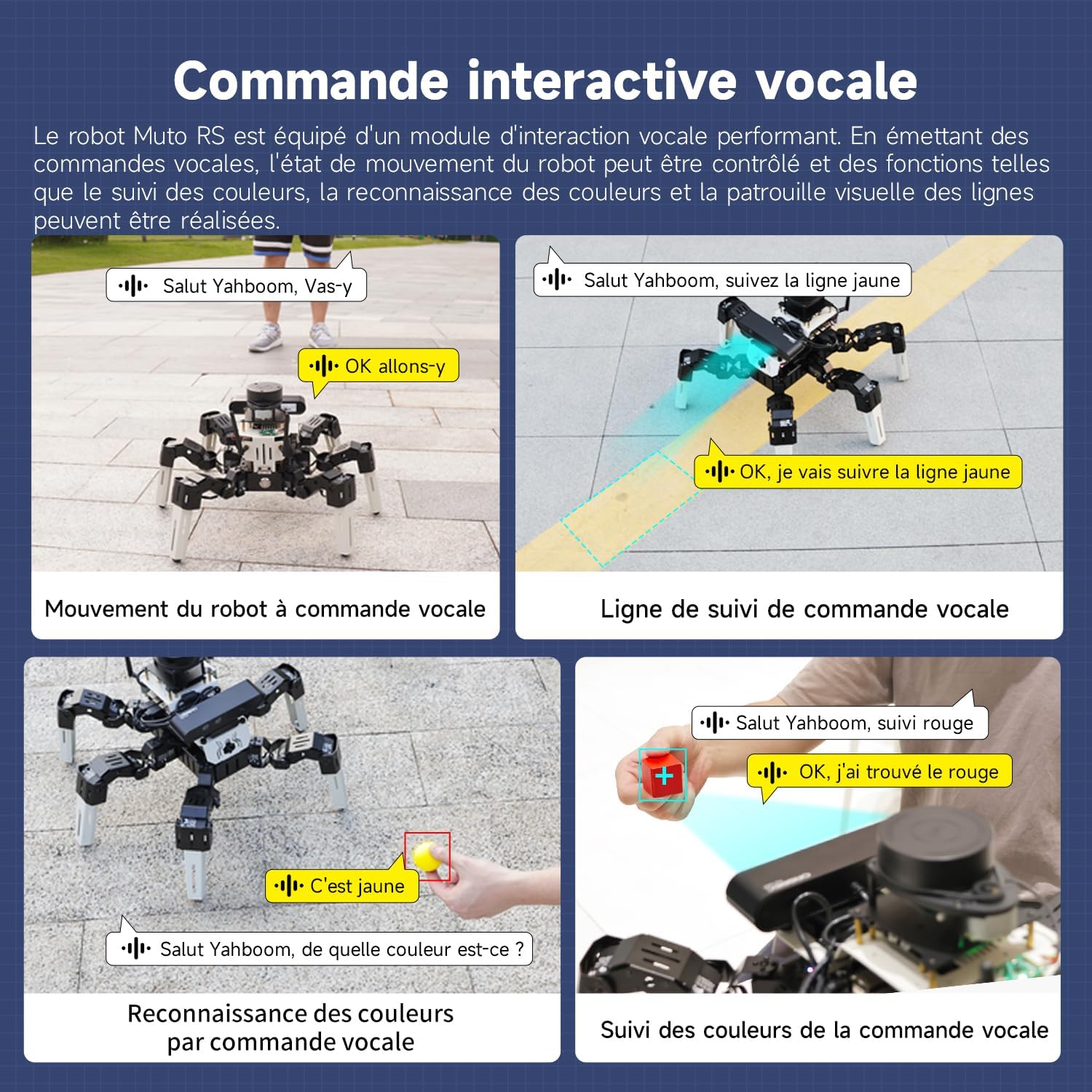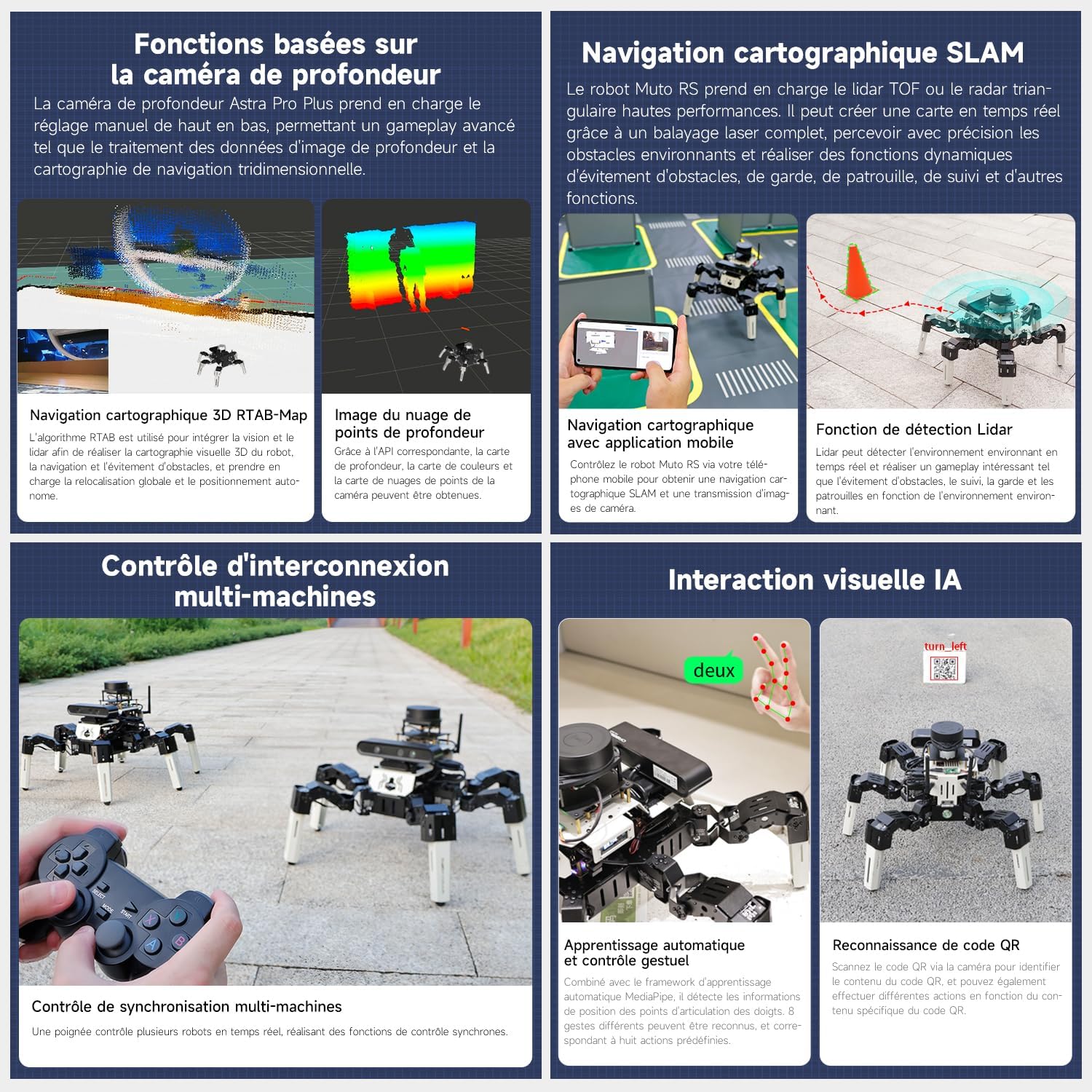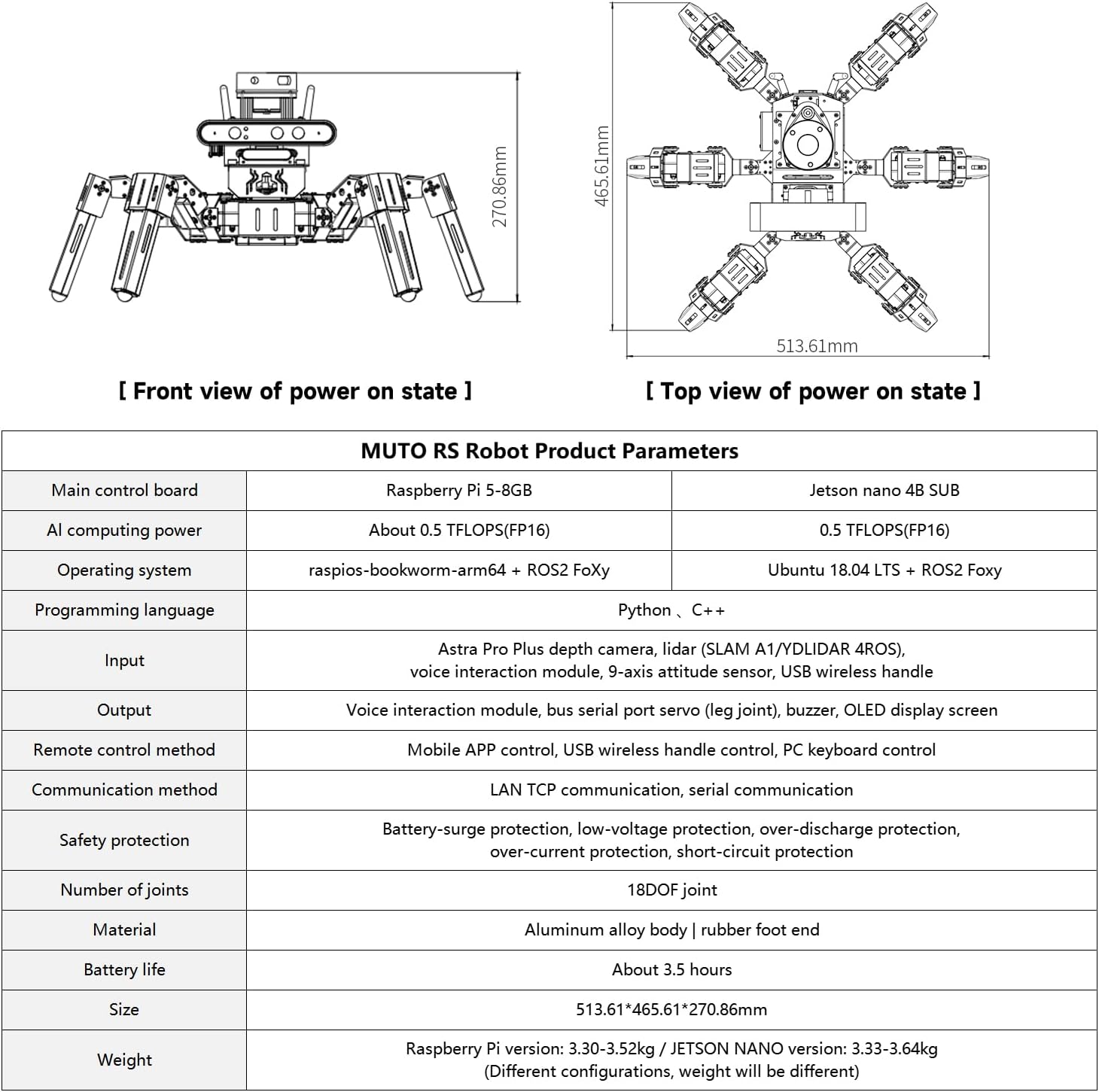 【ROS2 AI Vision Hexapod Robot】The hexapod robot is a programming kit specifically for the robot operating system (Ubuntu), based on the Raspberry Pi 5 or Jetson Nano development kit. It adopts a 6-foot 18dof bionic joint design to provide excellent stability and flexibility in various indoor and outdoor terrains. You can learn machine AI vision, bionic gait, 3D modeling navigation, RVIZ simulation and other knowledge. Please note: the robot cannot be used without a development board. 【High-performance hardware configuration upgrade】The voice interaction module supports voice command control of Muto RS robot interaction; the Astra Pro Plus depth camera not only completes the high-definition AI vision function, but is also responsible for processing data entry and three-dimensional navigation mapping; meeting the accuracy. YDLIDAR 4ROS radar on-demand capability in indoor and outdoor large scenes; all-aluminum alloy chassis body with built-in IMU. 【Multi-platform control, experience AI intelligent gameplay】Can be controlled through USB wireless controller, APP remote control, and PC web version. Through the APP, we can not only realize car body remote control and various performance modes, but also see the first visual picture of the robot. In addition, you can quickly switch to other smart game modes such as color tracking, line of sight, face detection, tag detection, etc. 【35kg servo motor + alloy alloy structure】3Equipped with a high-torque 35KG servo motor, 270° controllable 35kg intelligent serial bus servo, height adjustable; The solid all-aluminum alloy structure ensures the durability and durability of the product in harsh environments sex. 【Providing ROS2 tutorial】 Yahboom provides support ROS courses, including robot motion control, AI visual interaction, mapping navigation, docker container development, depth visual tracking, radar tracking and obstacle avoidance, 3D mapping navigation, voice interaction and other related electronic tutorials Tutorial For hexapod robot motion learning and verification, there is always online help to provide technical support. | قیمت یورویی : 1170€