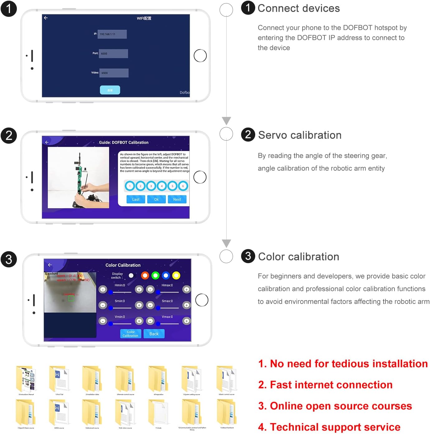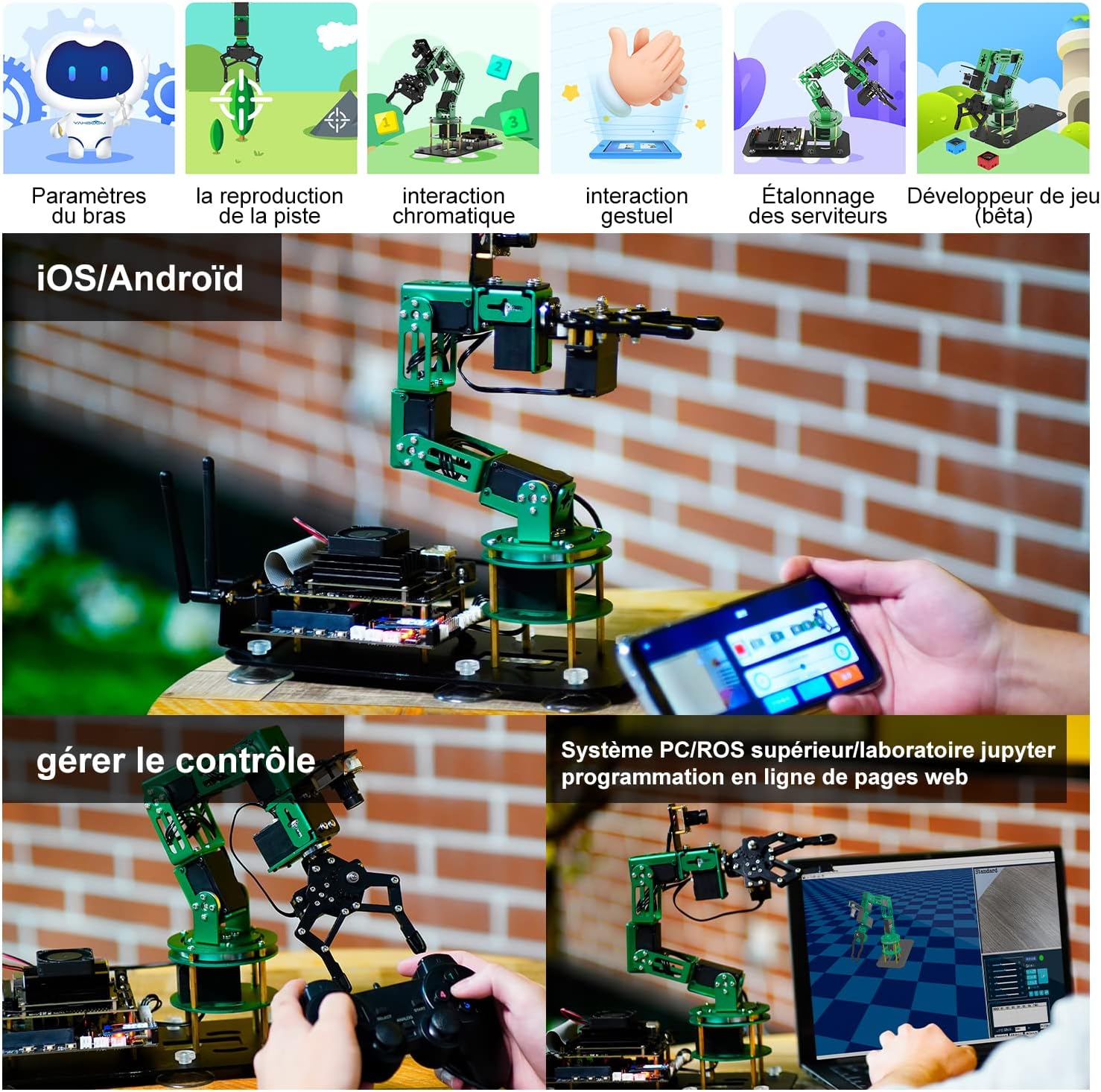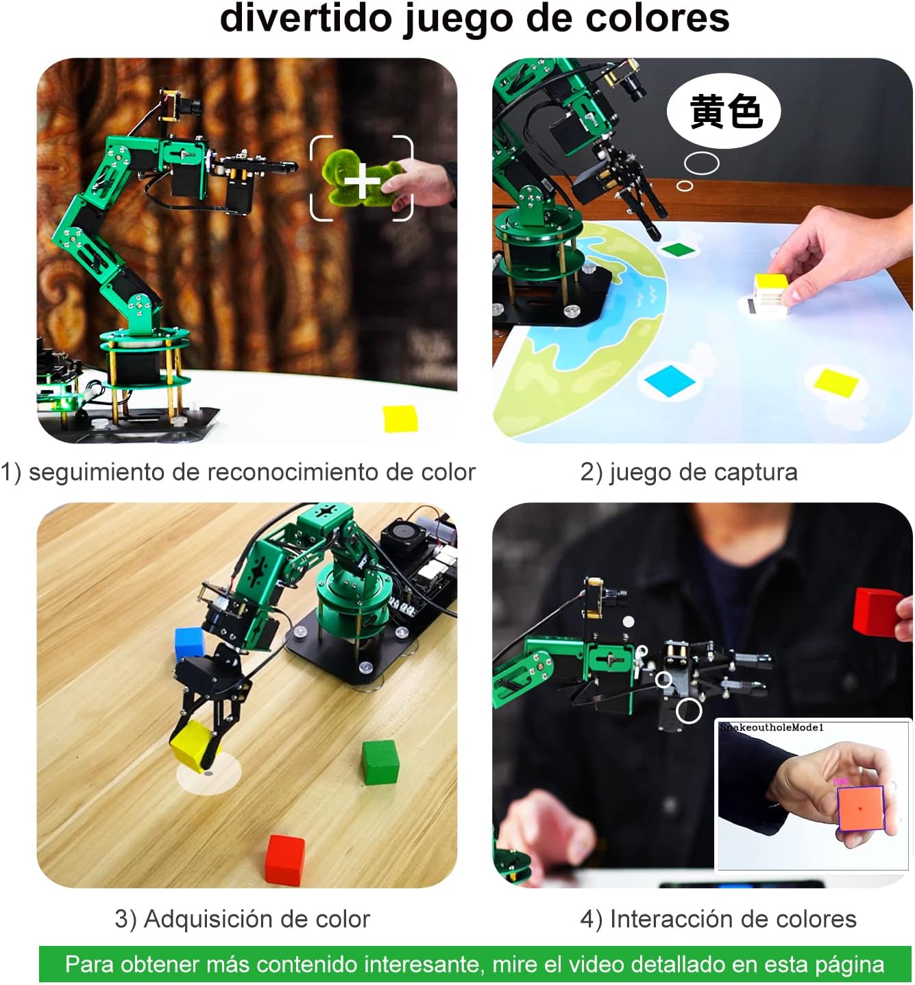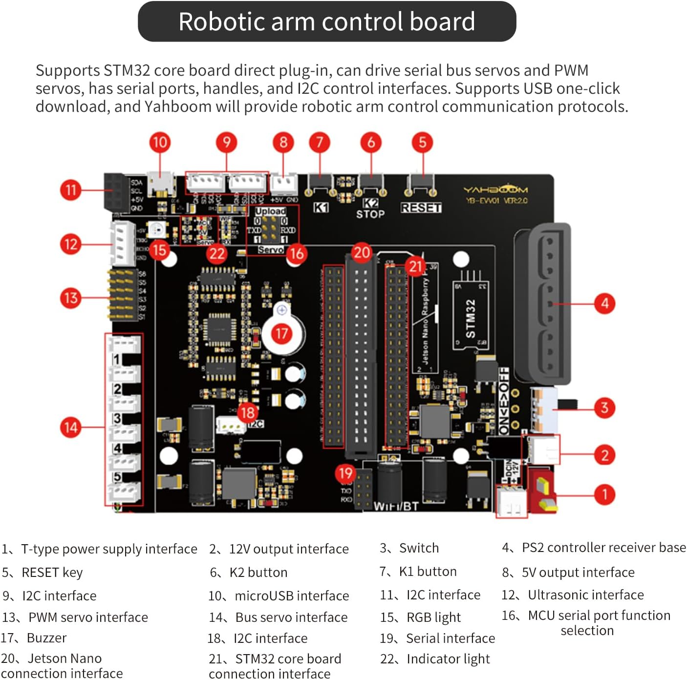 【Artificial Intelligence Robotic Arm with Camera】Robotic arm comes with camera to achieve FPV video transmission. The robotic arm can recognize colors, specific gestures and faces, respond to the recognized gestures and track the recognized faces, track the corresponding colors, and grab the corresponding designated color objects. These recognition, tracking and grabbing actions fully reflect the AI bionic characteristics of robot arm. DOFBOT starts to take you into the field of AI robotics. 【DOFBOT Motion Control】 Robotic arm not only has its own fixed action group, but also can perform custom actions. In terms of control method, we can use the Master Machine to control the Slave Machine to achieve remote operation of real-time transmission of action gestures. What’s more,the ros system can be used to build obstacle models, so that the robotic arm can avoid opening the obstacles to operate. Flexible arms can complete complex tasks for you 【Freely enjoy 5 control methods】 The programmable robot arm kit can use the multi-function APP (Android/iOS) to operate most of the functions; the kit is equipped with a USB gamepad remote control to achieve the best control feeling; it can also be used PC upper computer view image transmission; 3D simulation model construction of ROS system; Jupyter Lab webpage online programming. 5 kinds of interconnected control methods can enjoy the fun of robotic arm 【Top Configuration】Dofbot uses 15kg smart serial bus metal gear digital servo, which is conducive to separately controlling and reading the angle of each steering gear; equipped with a fully functional expansion board, reserved for continued expansion; the robotic arm is made of fully anodized aluminum alloy with a beautiful and strong structure 【Easy to Get Start & Online Technical Support】The assembled robotic arm can be controlled directly by simply installation and quick connection to the network (Based on the factory burned image). However, this robotic arm is for DIY makers with basic Python programming knowledge. Yahboom provide a large amount of course materials and online technical support is available. If you encounter difficulties, pls contact Yahboom. ***Raspberry Pi 4B (4G or 8G) is recommended | قیمت یورویی : 369.99€