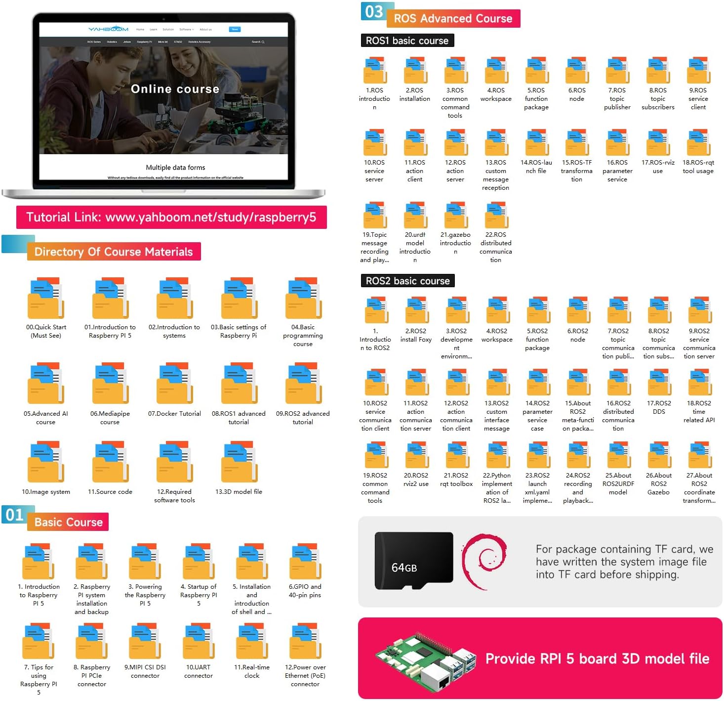 Raspberry Pi 5 features 64-bit quad-core Arm Cortex-A76 processor with aclock speed of 2.4GHz, delivering 2-3 times improved CPU performance compared to Raspberry Pi 4B. Additionally, graphics performance sees significant boost with the 800MHz VideoCore VII GPU, supporting dual 4Kp60 display output via HDMI. The redesigned Raspberry Pi image signal processor provides advanced camera support, offering users a smooth desktop experience and opening new possibilities for industrial applications Yahboom provides different kit combinations for Raspberry Pi 5 to suit various user needs. If you need high-frequency cooling, cooling boost kit is recommended. Camera kit is suitable for visual developers. If you have high quality requirements for raspberry pi 5 case, choose solid metal casing. All kits are equipped with Yahboom's customized Raspberry Pi 5-specific 5.1V/5A power adapter with PD protocol, which can fully utilize the performance of Pi5. Except for the Basic Kit, the other kits include 64G TF card that is burned into the image system , card reader, micro-HDMI cable and network cable Yahboom provides basic usage tutorials, AI vision advanced development tutorials, and Raspberry Pi 5 ROS advanced development materials for the Raspberry Pi 5 development board. Our technical support will also promptly help users with difficulties. Raspberry Pi 5 requires 2 essential conditions for normal and healthy operation: adapter and heat dissipation system. Yahboom’s 27W USB-C 5.1V/5A power adapter solves stable power supply. Various needs of the cooling system, we provide economical heat sinks; moderate heat sinks and fans have metal casings; if long-term high-frequency operation is required, an active cooling solution that doubles the heat dissipation is needed to ensure the normal operation of the pi 5 development board. | قیمت یورویی : 231€