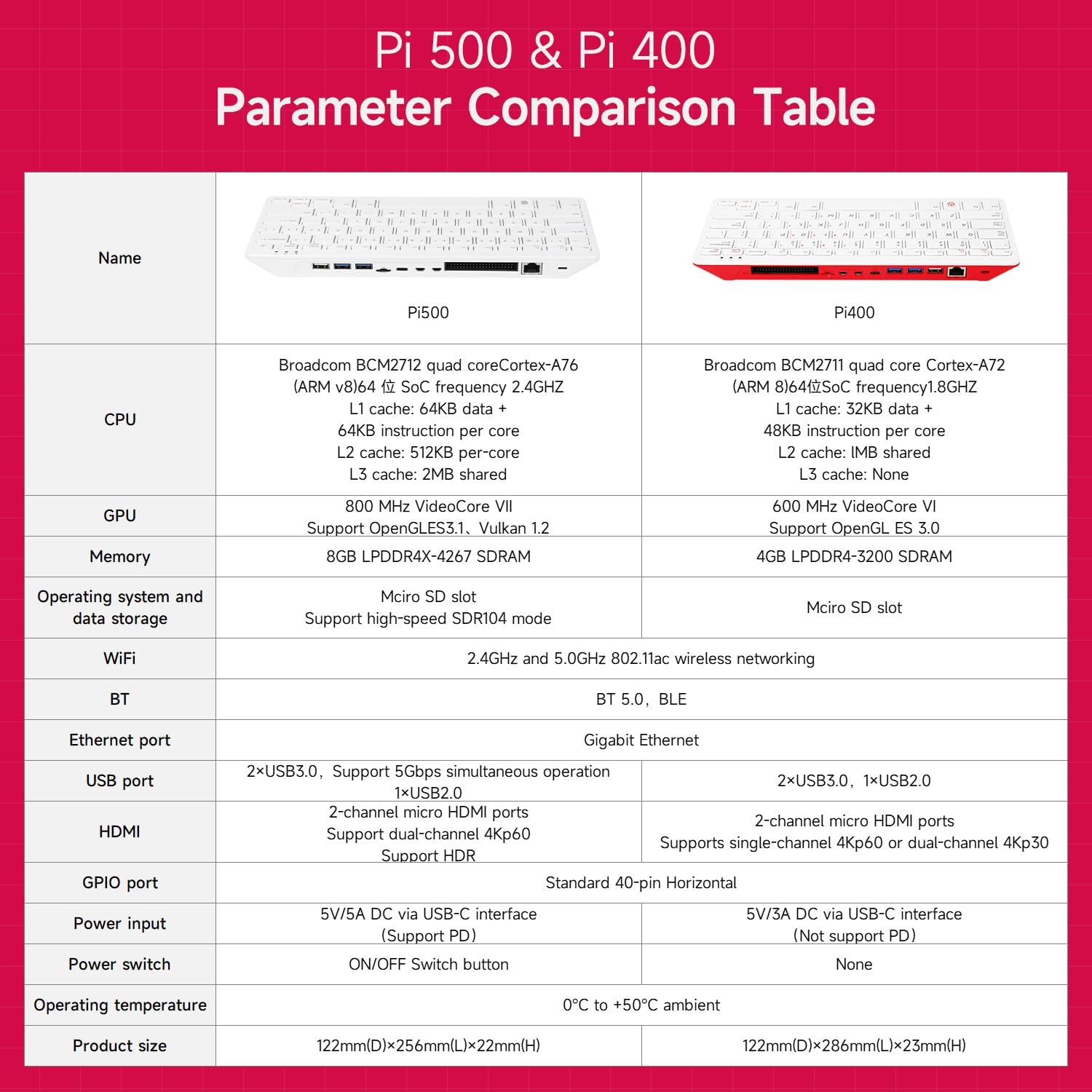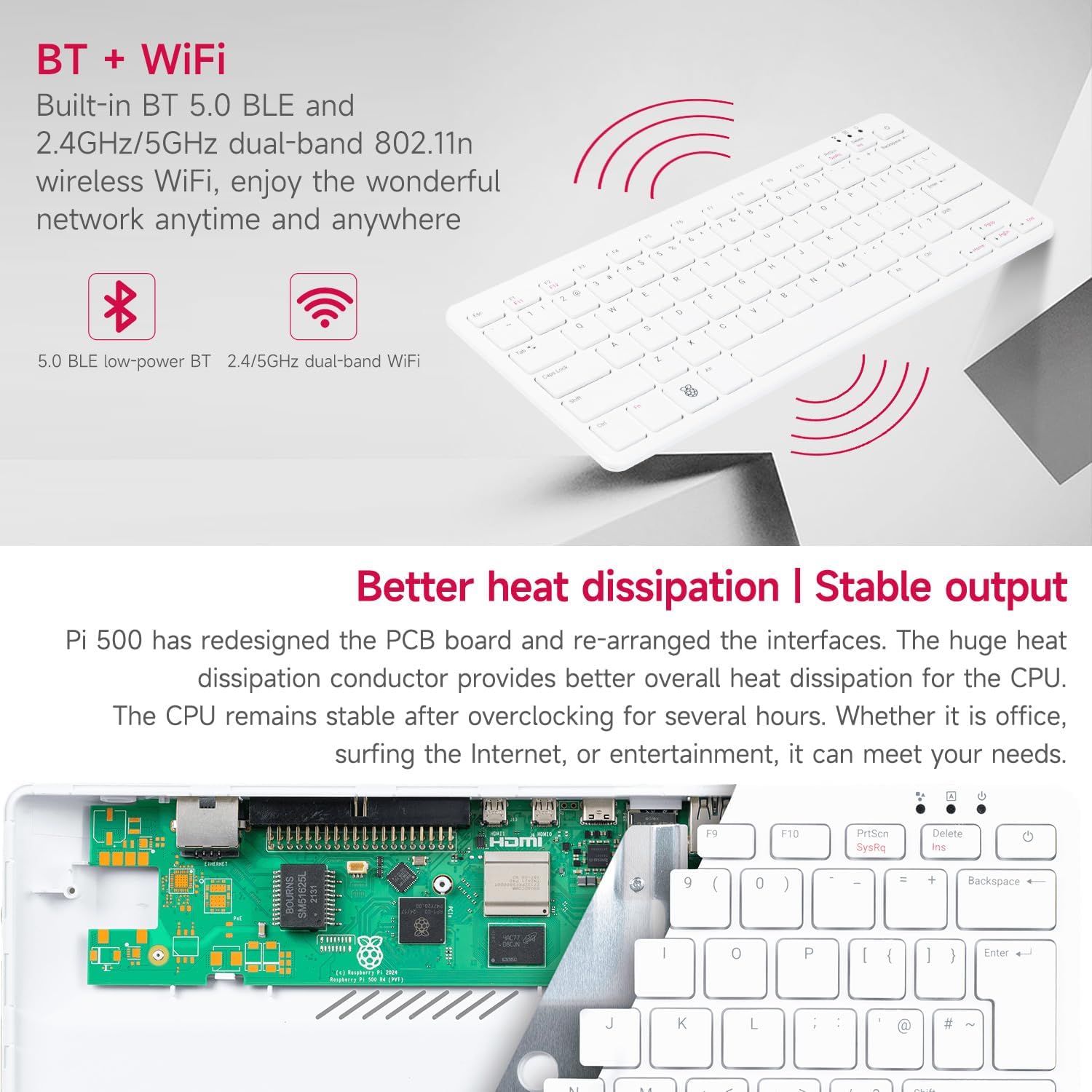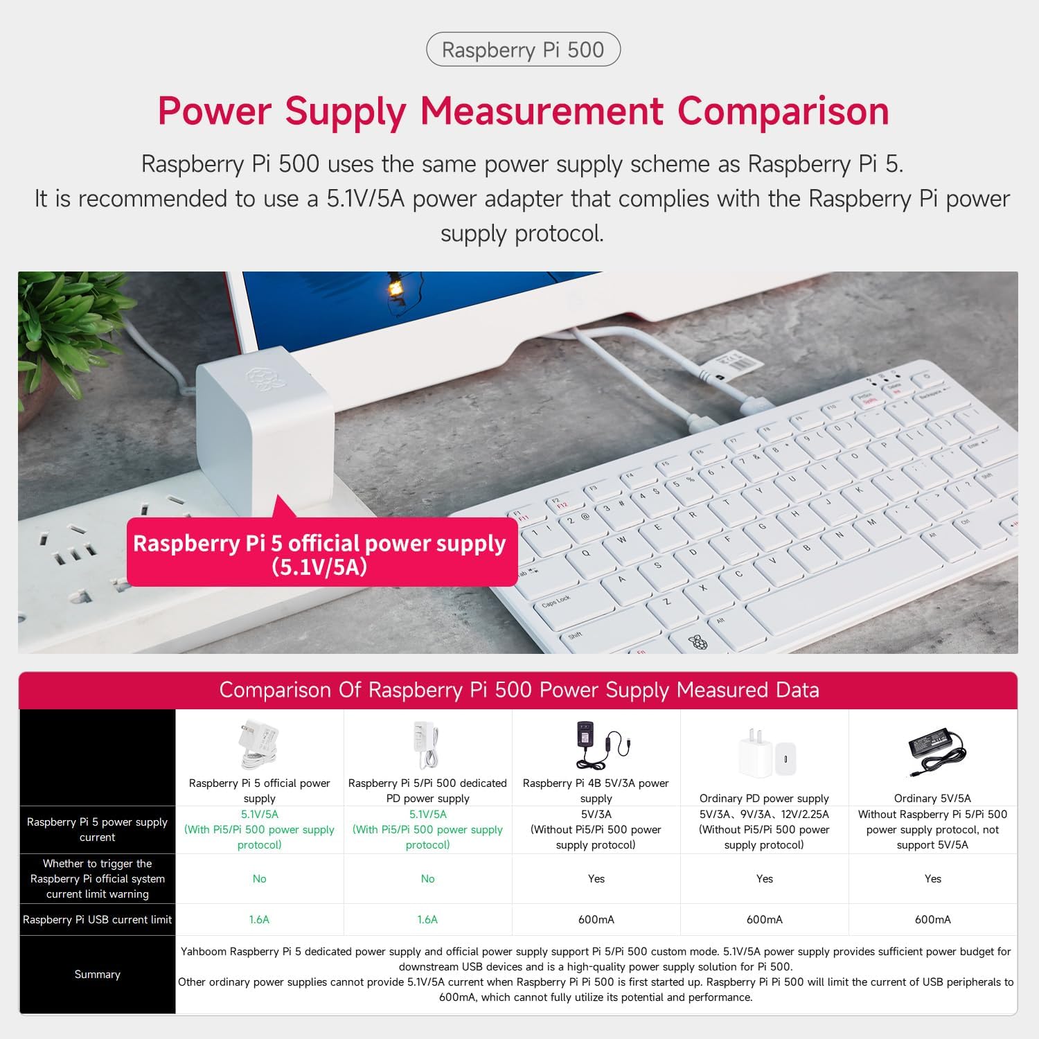 2.4GHz quad-core 64-bit Arm Cortex-A76 CPU with cryptographic extensions, 512KB L2 cache per core, and 2MB shared L3 cache. 8GB LPDDR4X-4267 SDRAM. A fast, powerful computer with a built-in high-quality keyboard for the ultimate compact PC experience. Pi 500 has the same quad-core 64-bit Arm processor and RP1 I/O controller as Pi 5. Two ways to connect: built-in Bluetooth 5.0 BLE and 2.4GHz/5GHz dual-band 802.11n wireless WiFi, enjoy the wonderful network anytime, anywhere. Requires a 5.1V 5A PD power supply to provide sufficient power budget for USB devices. If other ordinary power supplies are used after powering on, there will be a low voltage current limit warning, and the potential and performance of Pi 500 cannot be fully utilized; it is recommended to use it with the official Pi 5 power supply or Yahboom PD power supply. With a built-in integrated aluminum heat sink to improve heat dissipation, your Pi 500 can run fast and smoothly even under heavy loads, while providing excellent dual 4K display output. Yahboom has configured AI vision and large language model development environment materials, which need to be downloaded from the Yahboom website. The list comes with a card reader, the materials support Chinese or English, and technical support services are provided. Please contact Yahboom to obtain them. | قیمت یورویی : 138.99€