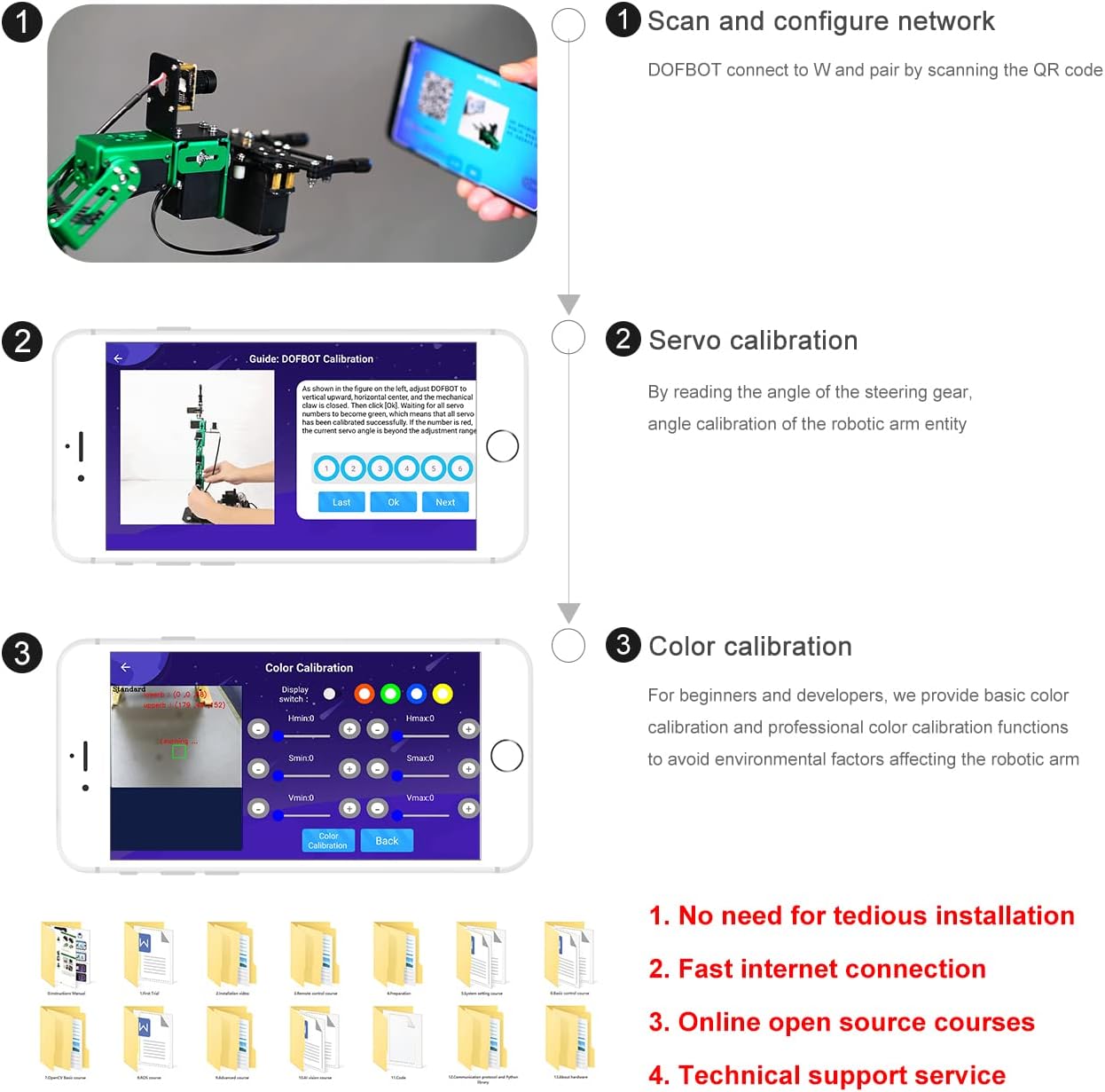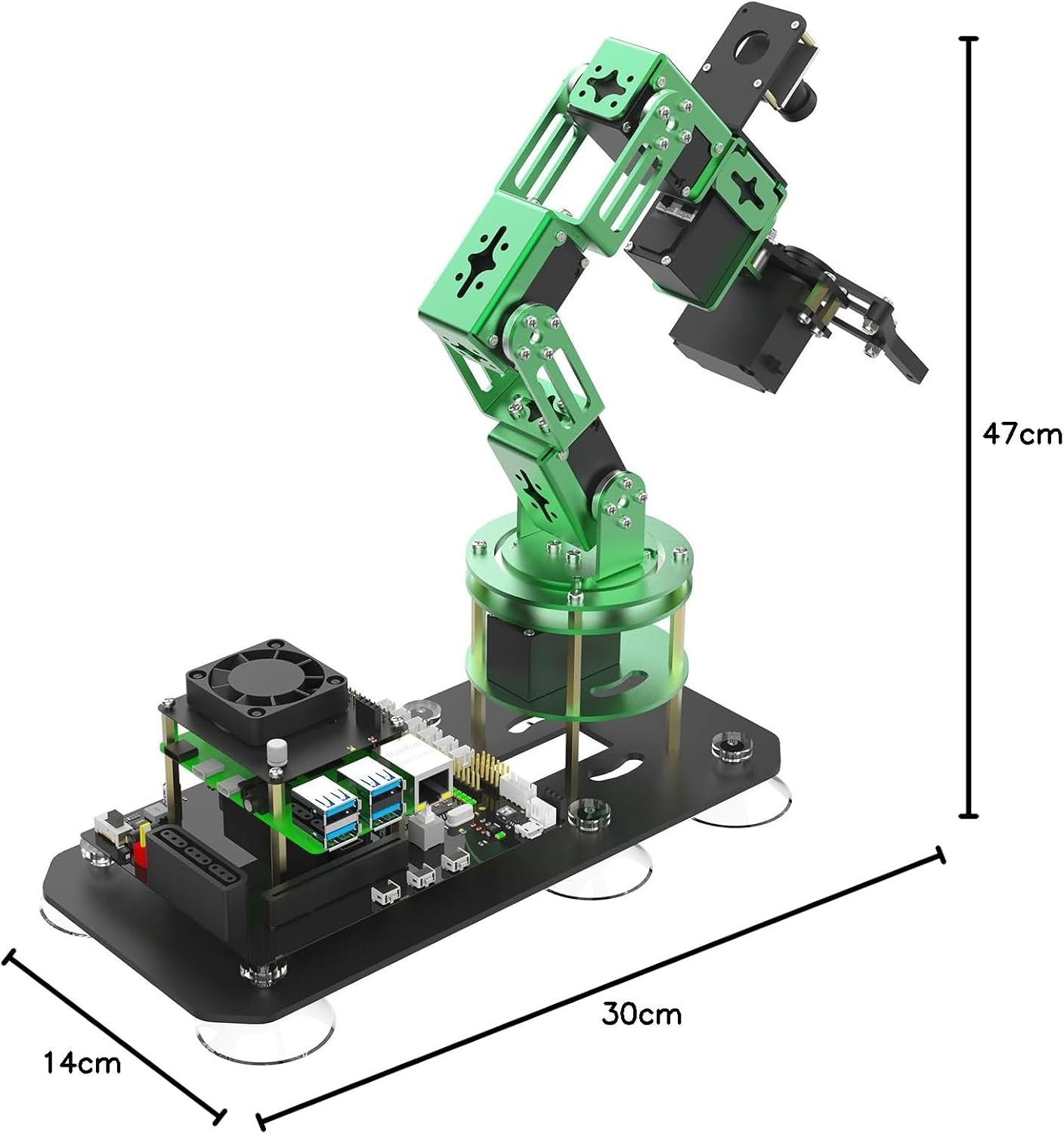 【Artificial Intelligence Robotic Arm with Camera】Robotic arm comes with camera to achieve FPV video transmission. The robotic arm can recognize colors, specific gestures and faces, respond to the recognized gestures and track the recognized faces, track the corresponding colors, and grab the corresponding designated color objects. These recognition, tracking and grabbing actions fully reflect the AI bionic characteristics of robot arm. DOFBOT starts to take you into the field of AI robotics. 【DOFBOT Motion Control】 Robotic arm not only has its own fixed action group, but also can perform custom actions. In terms of control method, we can use the Master Machine to control the Slave Machine to achieve remote operation of real-time transmission of action gestures. What’s more,the ros system can be used to build obstacle models, so that the robotic arm can avoid opening the obstacles to operate. Flexible arms can complete complex tasks for you 【Freely enjoy 5 control methods】 The programmable robot arm kit can use the multi-function APP (Android/iOS) to operate most of the functions; the kit is equipped with a USB gamepad remote control to achieve the best control feeling; it can also be used PC upper computer view image transmission; 3D simulation model construction of ROS system; Jupyter Lab webpage online programming. 5 kinds of interconnected control methods can enjoy the fun of robotic arm 【Top Configuration】Dofbot uses 15kg smart serial bus metal gear digital servo, which is conducive to separately controlling and reading the angle of each steering gear; equipped with a fully functional expansion board, reserved for continued expansion; the robotic arm is made of fully anodized aluminum alloy with a beautiful and strong structure 【Easy to Get Start & Online Technical Support】The assembled robotic arm can be controlled directly by simply installation and quick connection to the network (Based on the factory burned image). However, this robotic arm is for DIY makers with basic Python programming knowledge. Yahboom provide a large amount of course materials and online technical support is available. If you encounter difficulties, pls contact Yahboom. ***Raspberry Pi 4B (4G or 8G) is recommended | قیمت یورویی : 465.99€