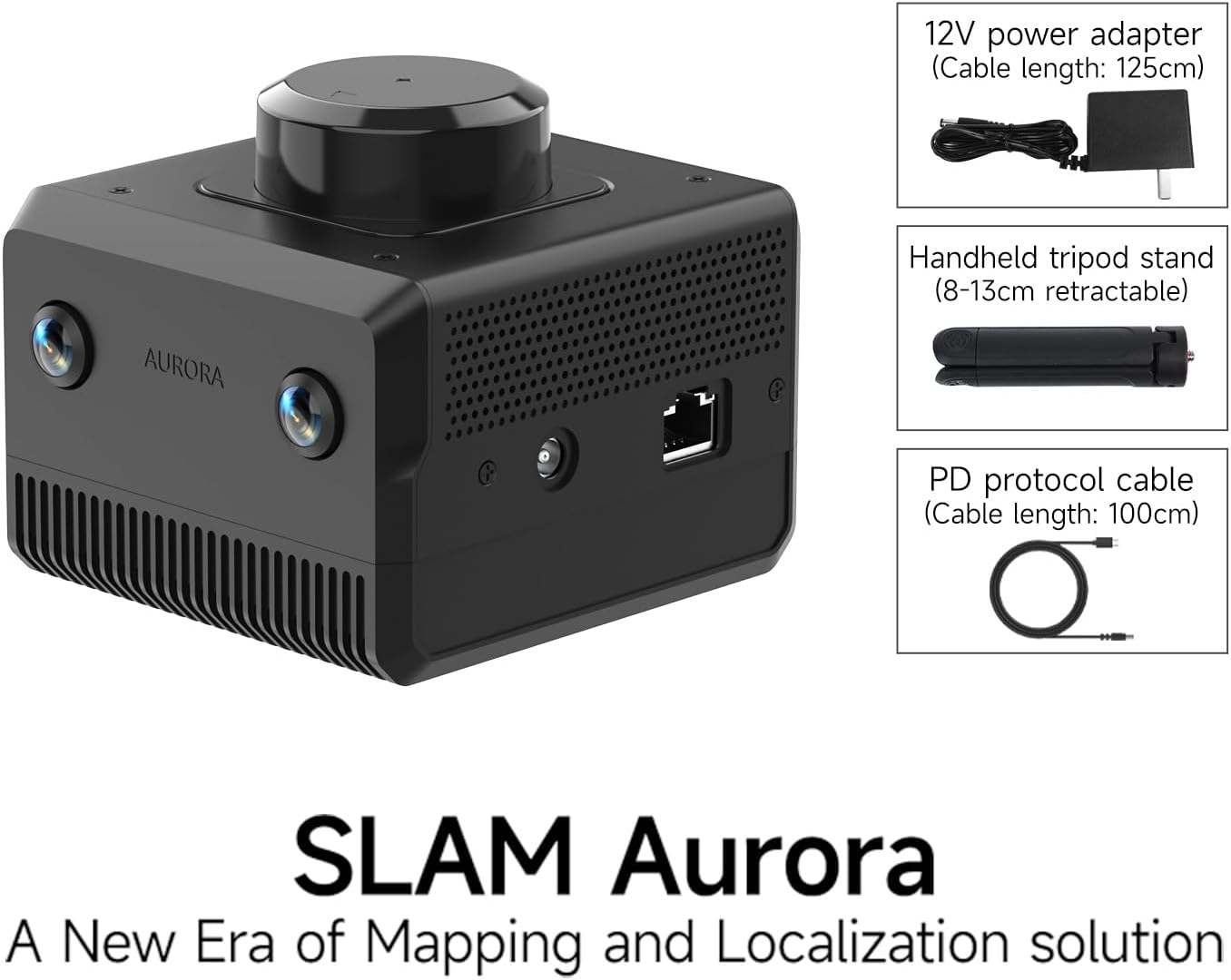 Aurora is a new integrated positioning and mapping sensor that innovatively integrates laser, vision, inertial navigation and deep learning technologies. Without external dependencies, it can achieve universal indoor and outdoor 3D high-precision mapping and 6DOF positioning capabilities as soon as it is turned on, providing an unprecedented large perception range and providing accurate spatial perception for smart devices in complex environments. The packing list comes with an 8-13cm retractable handheld bracket, a 100cm PD line, and a 125cm 12V power adapter. It is exquisite and compact, and can be easily installed on a mechanical dog/robot.It provides an Android mapping navigation APP,which supports mobile phones and PCs to view visual features and lidar scanning effects,whether you want to view 2D or 3D. It is fully compatible with ROS1 and ROS2,and provides SDK usage examples for the two systems.You can directly view the fixed-point data of the binocular camera, allowing developers to quickly see the mapping effect without a complicated configuration process. It has a wide range of application scenarios,supporting ROS robots and humanoid robots used by RPi and Jetson series development boards;it is widely used in industrial fields, environmental mapping,and construction engineering development.We provide development materials in Chinese and English.If necessary, please contact Yahboom to obtain them. | قیمت یورویی : 799.99€